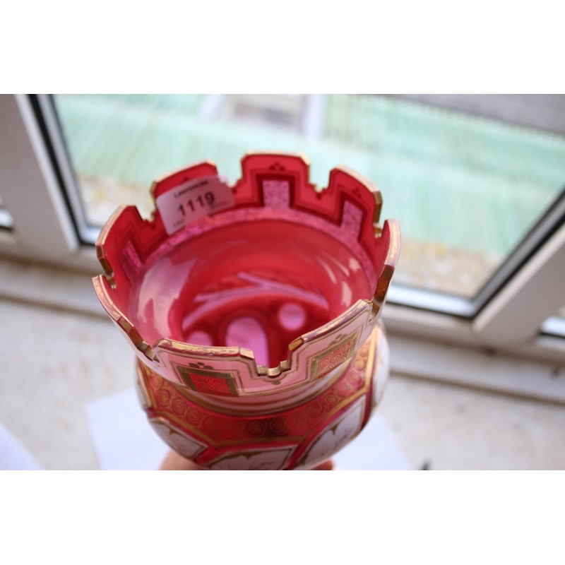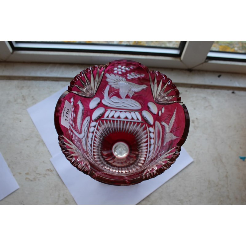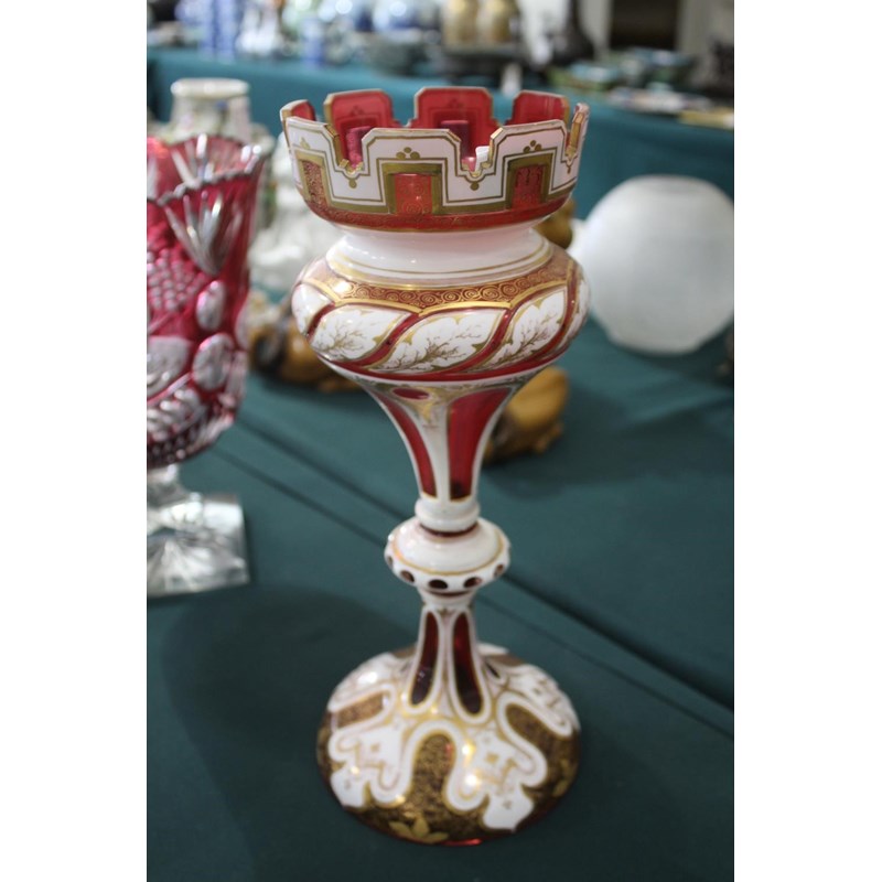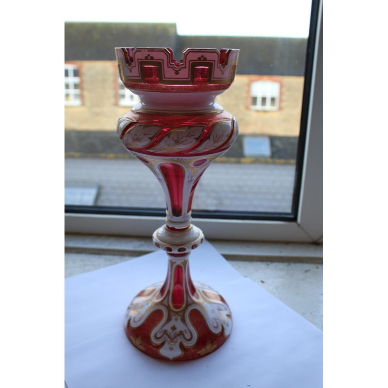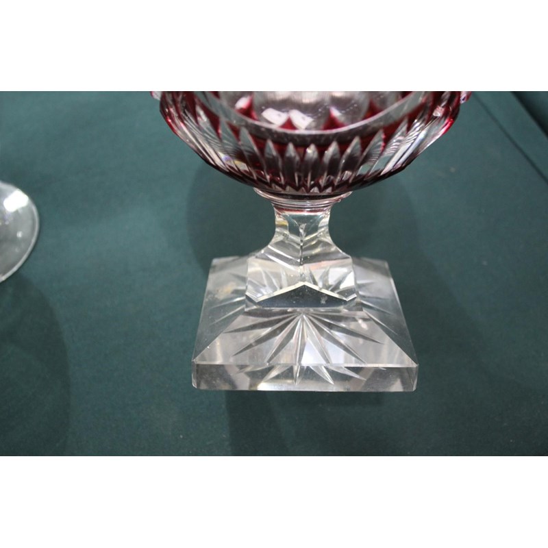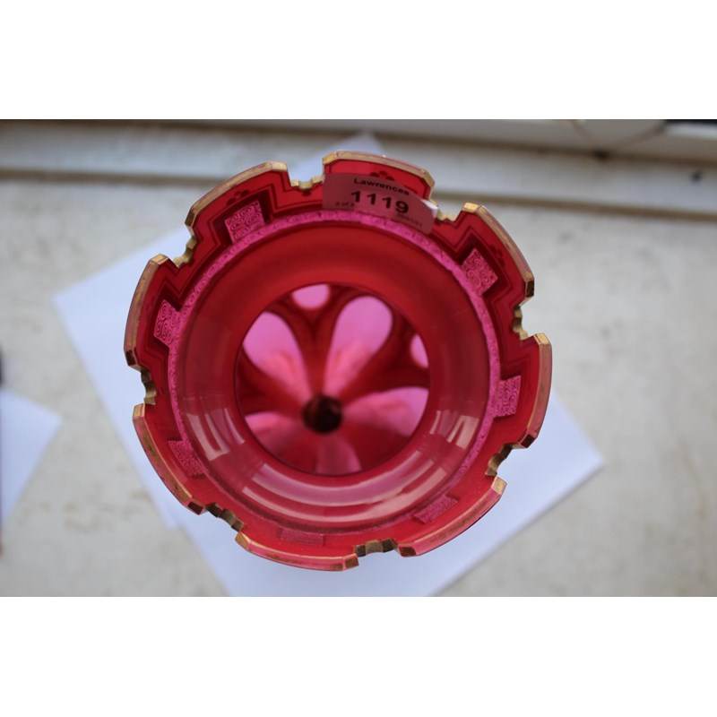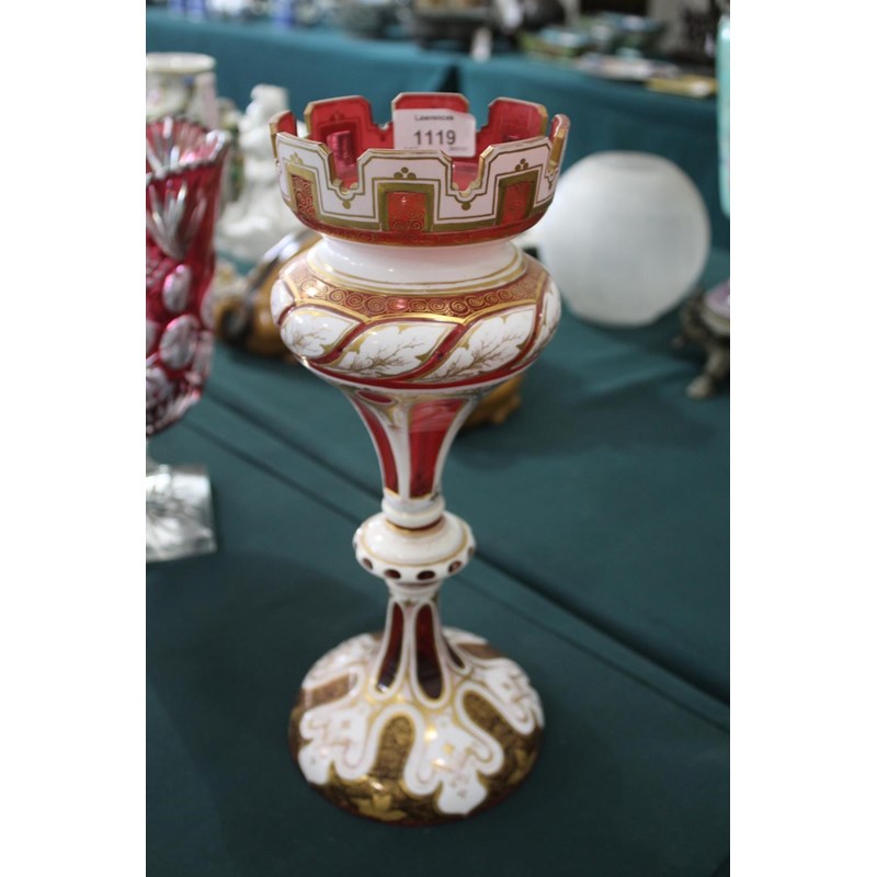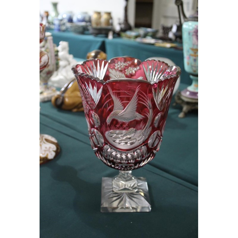 a large ruby flash cut glass vase, the bowl with various Birds and mounted on a square pedestal with star cut base (28cms high). Also with a Bohemian red and white overlaid glass vase, missing its glass lustres (33.5cms high). (2)