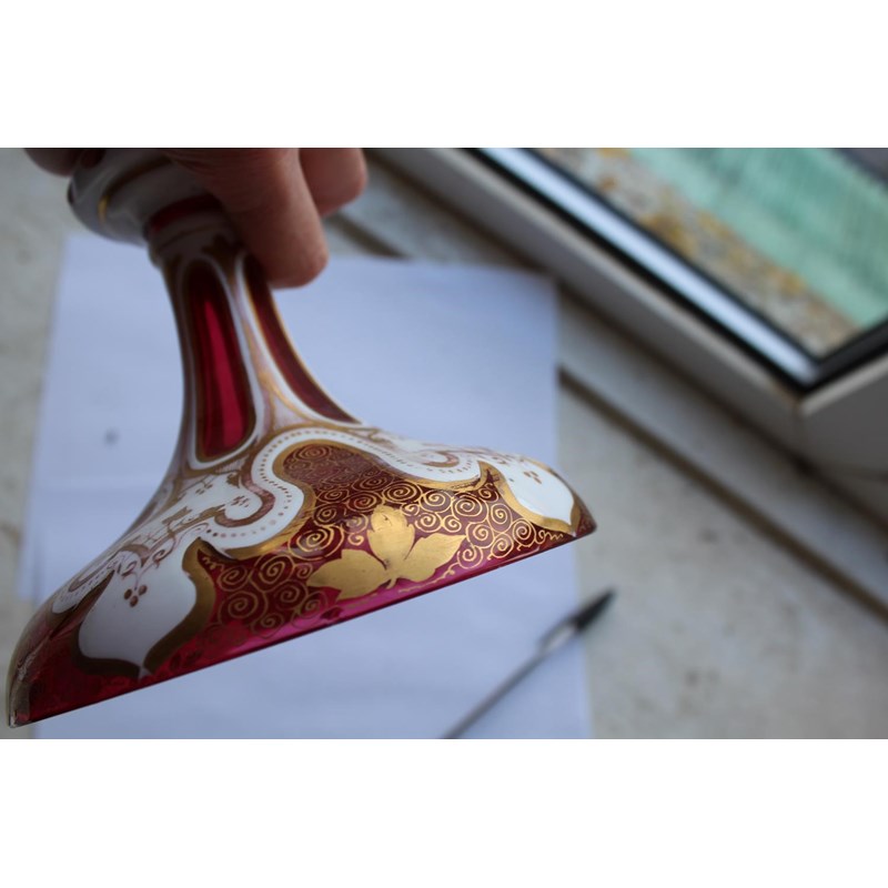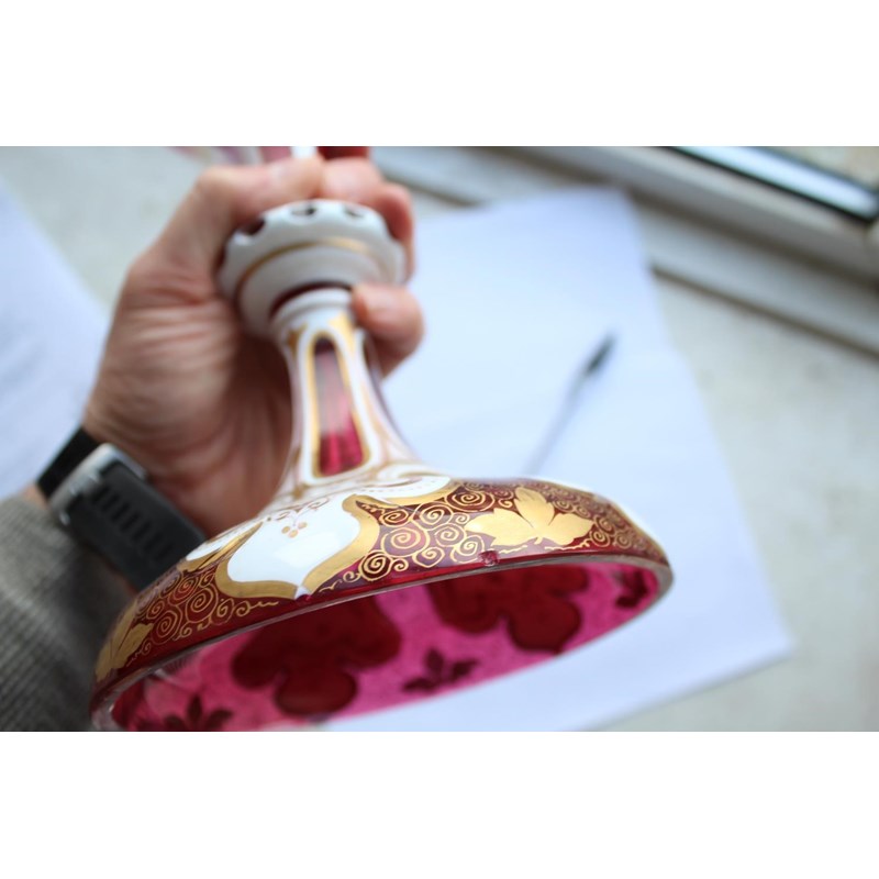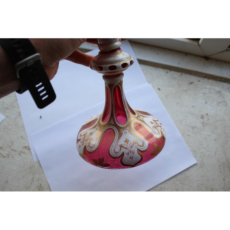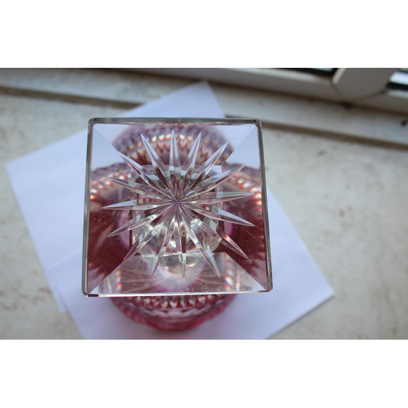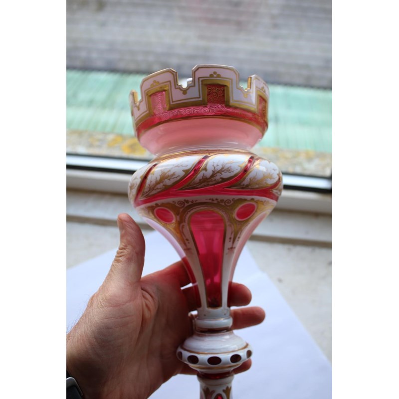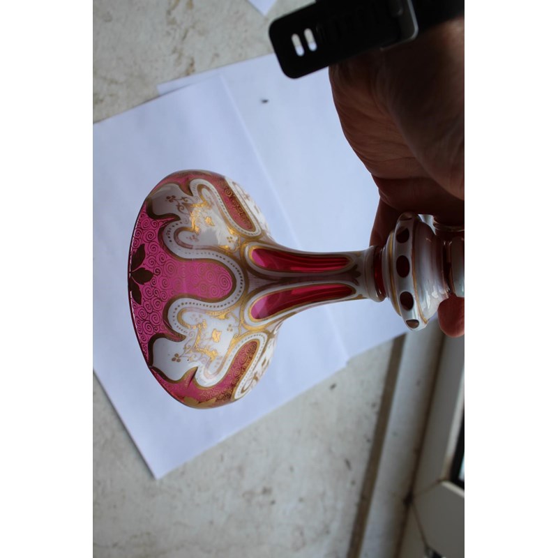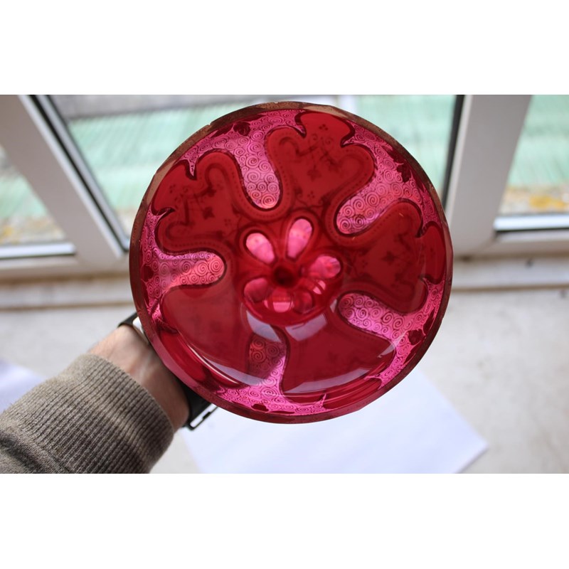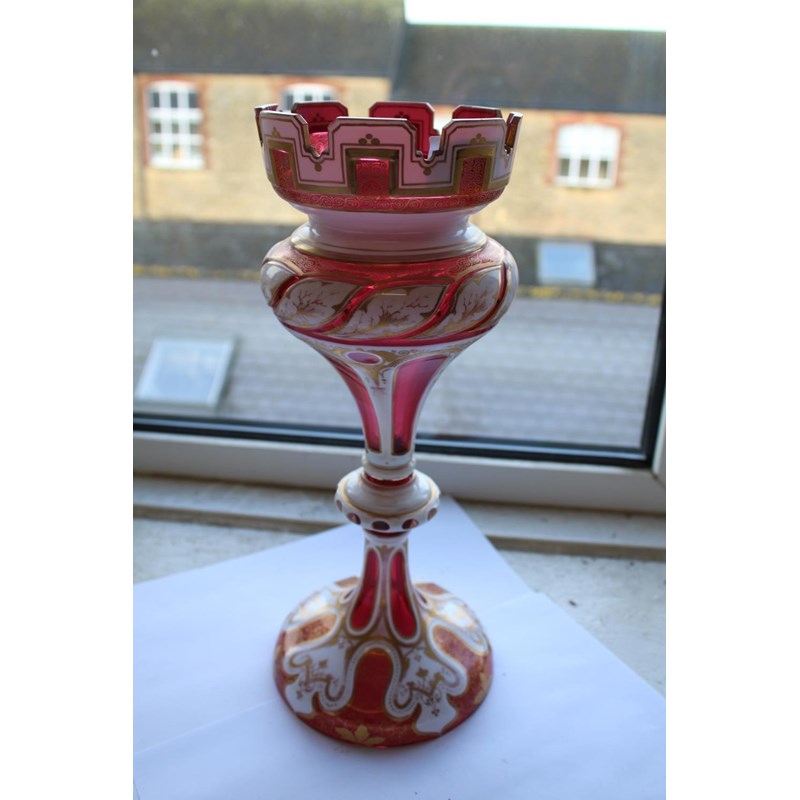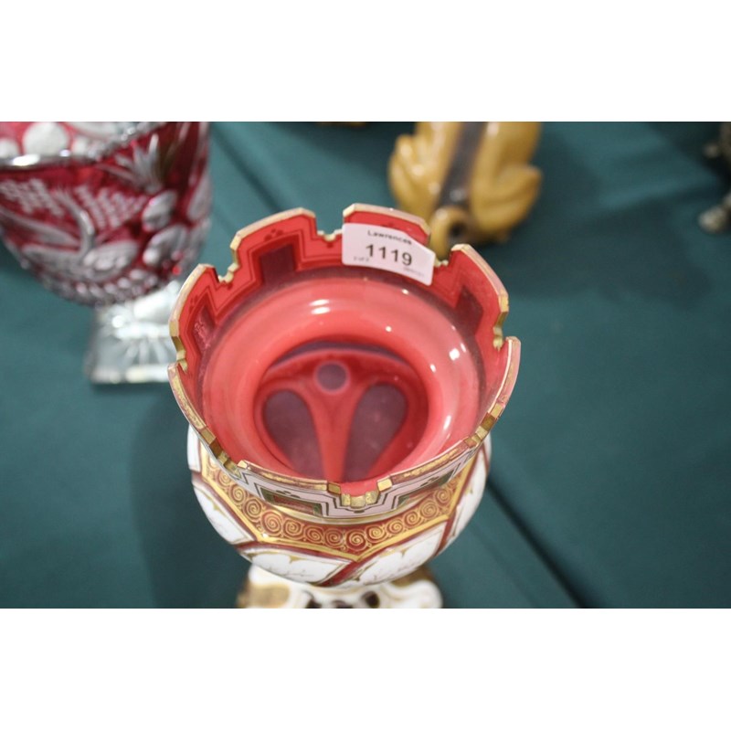 a large ruby flash cut glass vase, the bowl with various Birds and mounted on a square pedestal with star cut base (28cms high). Also with a Bohemian red and white overlaid glass vase, missing its glass lustres (33.5cms high). (2)