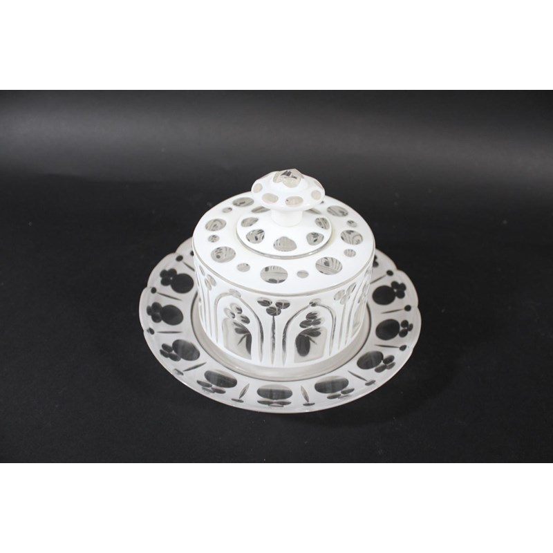 BOHEMIAN GLASS BUTTER DISH & STAND a white overlaid glass stand with star shaped base, with a circular lid. 14.5cms high