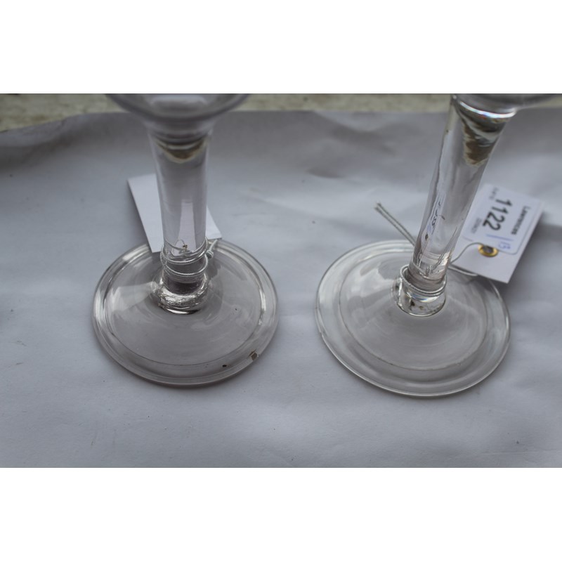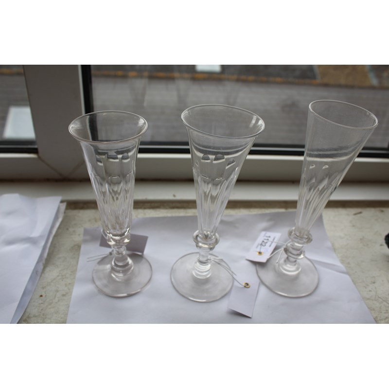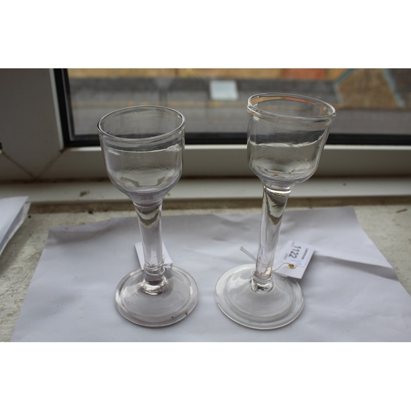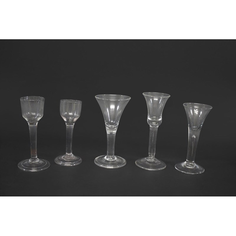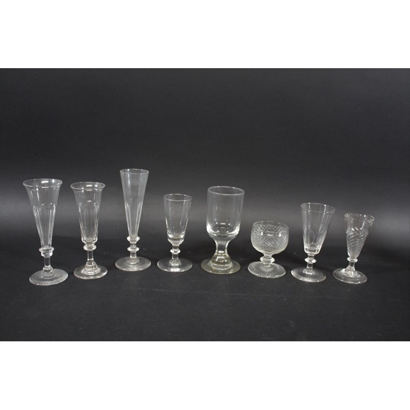 probably 18thc with an ogee shaped bowl, plain stem and conical foot (15cms high), also with a similar glass of slightly smaller proportions (14cms high), a wine glass with bell shaped bowl and tear within the stem (16.5cms), and two other wine glasses with tear drops. Also with various other glasses including ale glasses, rummer etc. (13)