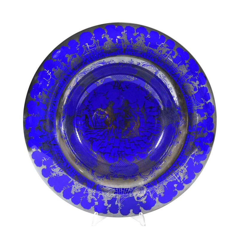 probably Venetian, an interesting large hand blown cobalt blue bowl with silver overlaid decoration, the centre with a courting couple and a gondola in a landscape. With further figures and musicians around the rim, 36cms diameter