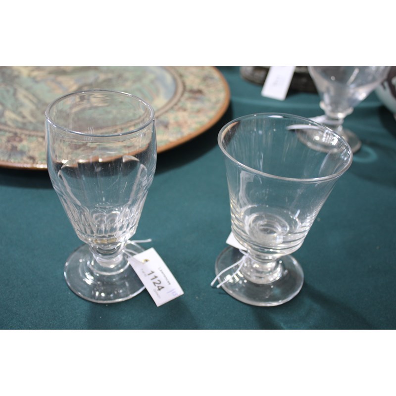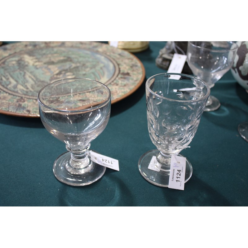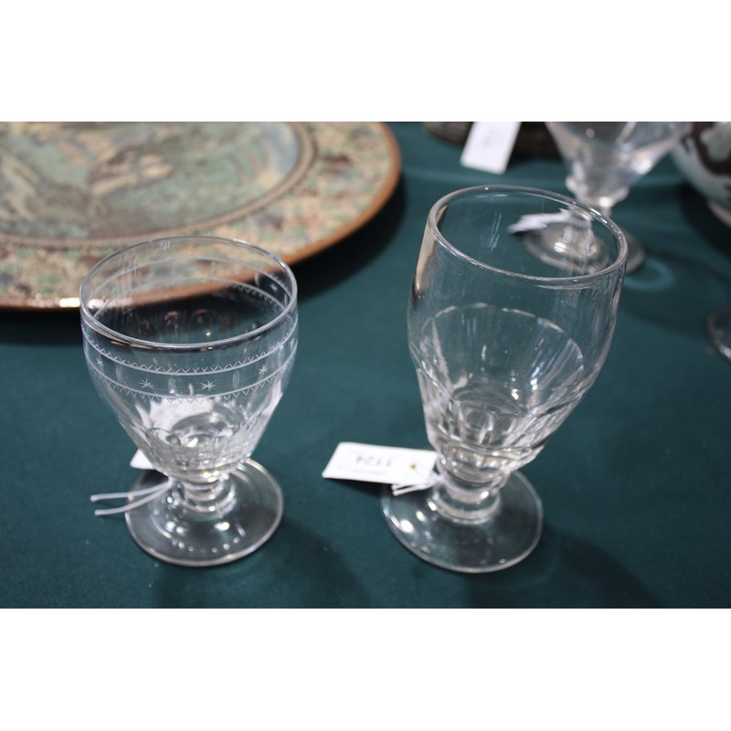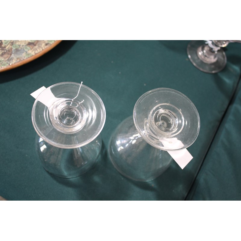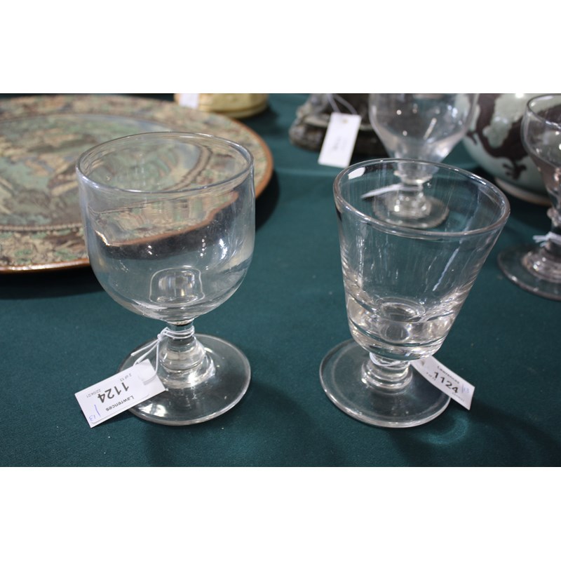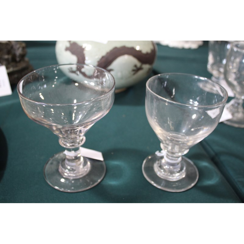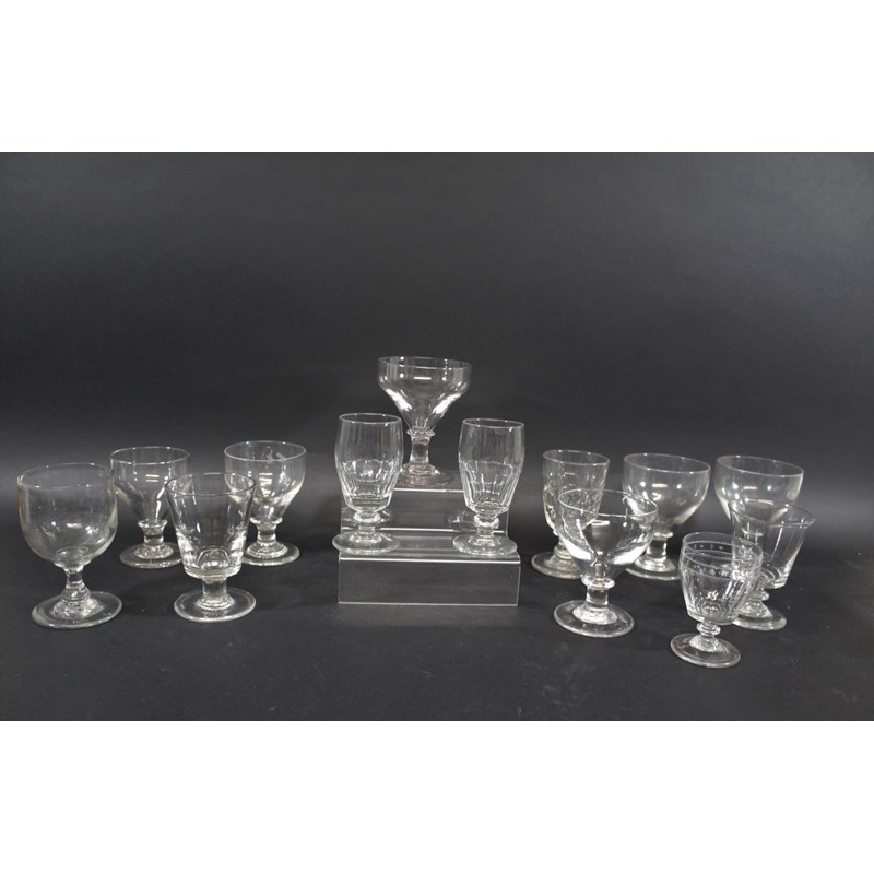 including a near pair of rummers with ovoid body an capstan stem (15cms high), a large rummer with tapering body and capstan stem (15cms), a pair of wine glasses with faceted sides, and various other rummers. (13)