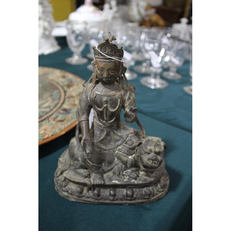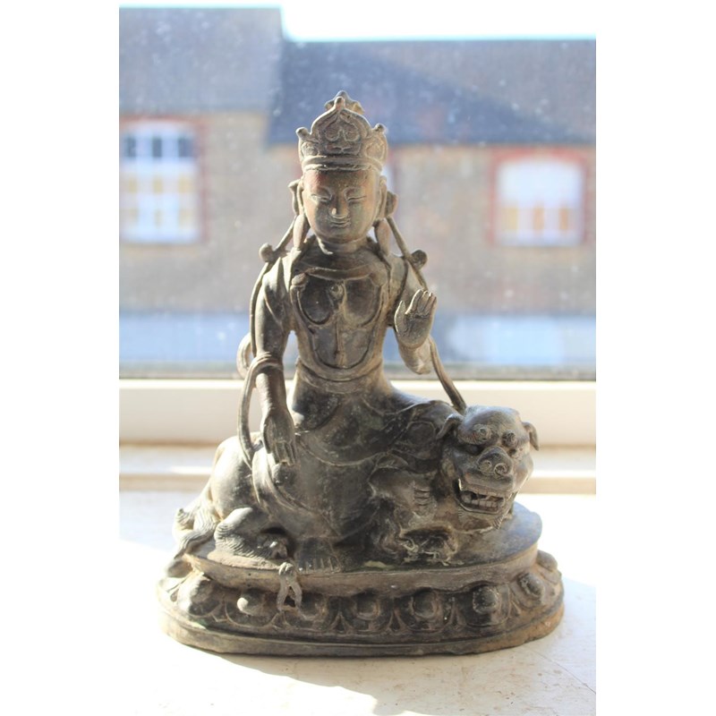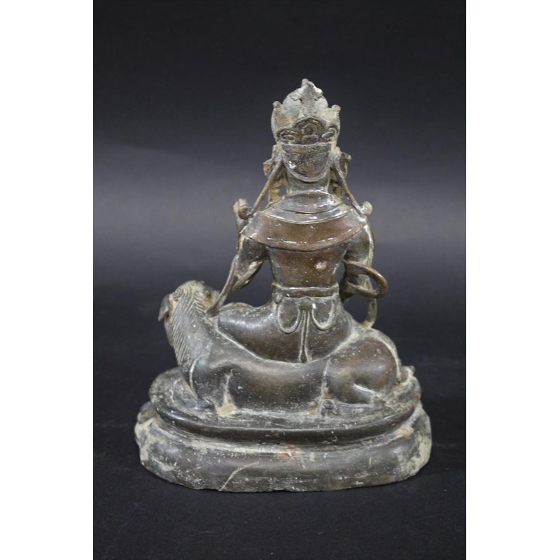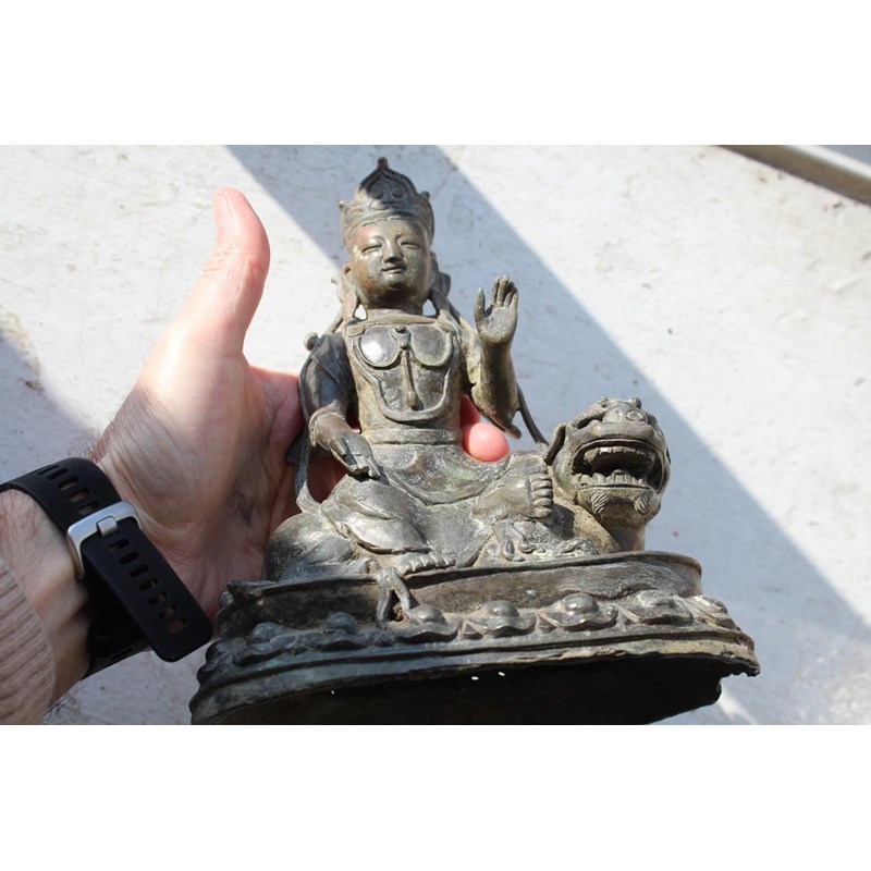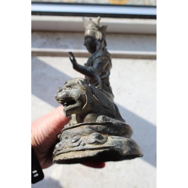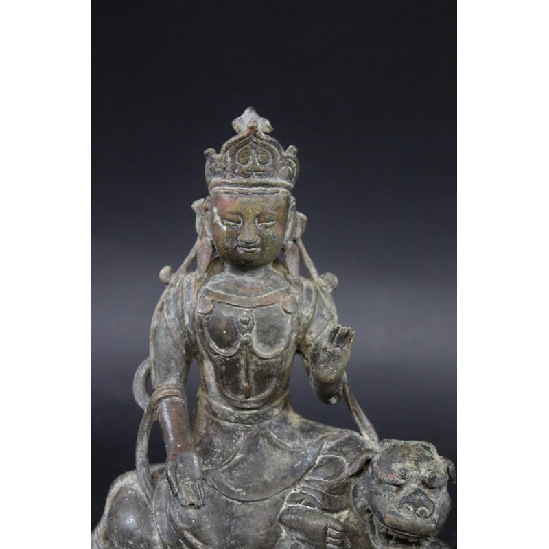 TIBETAN/CHINESE BUDDAH - BODHISATTVA possibly 18th or 19thc, the metal cast figure seated on a Lion and with a lotus shaped base. 22cms high