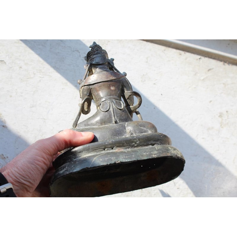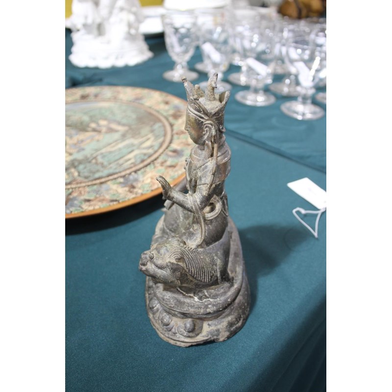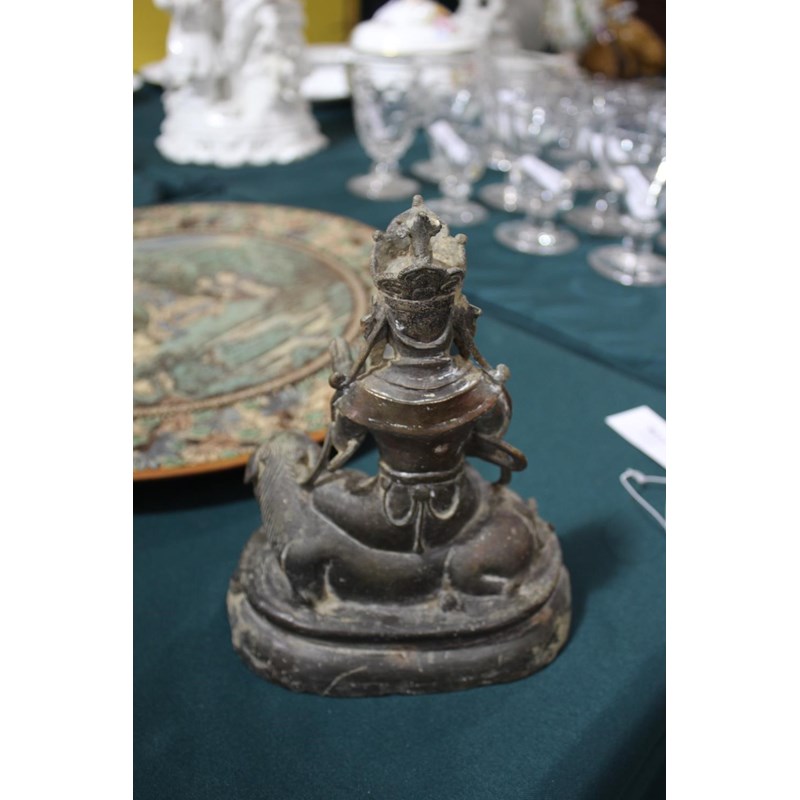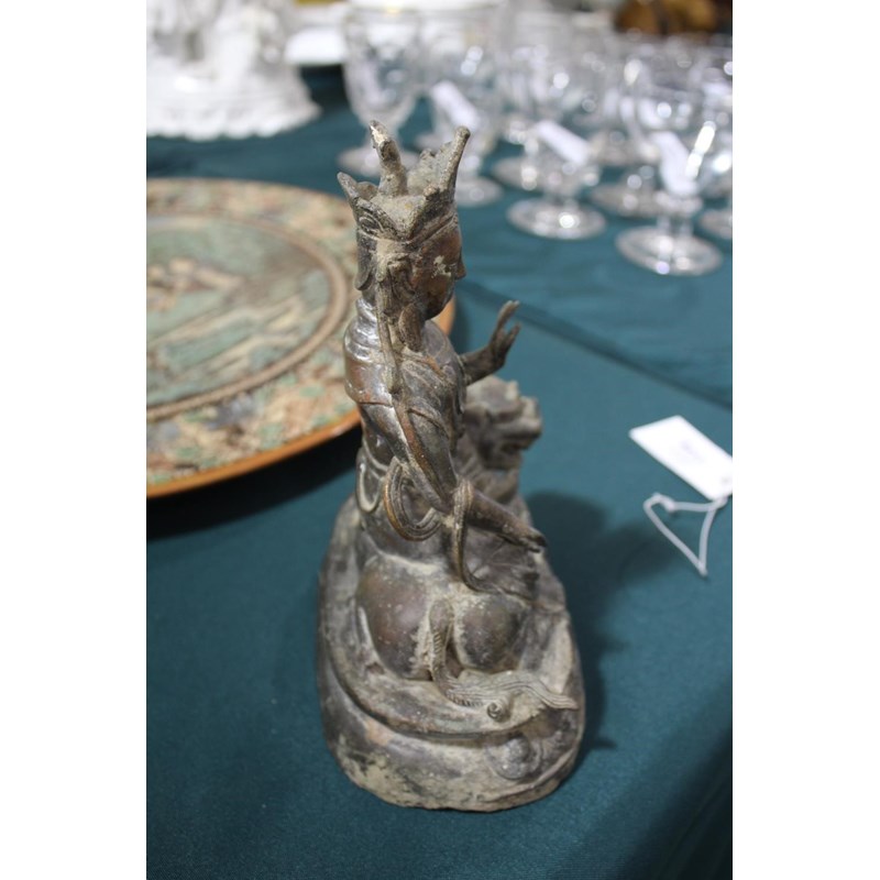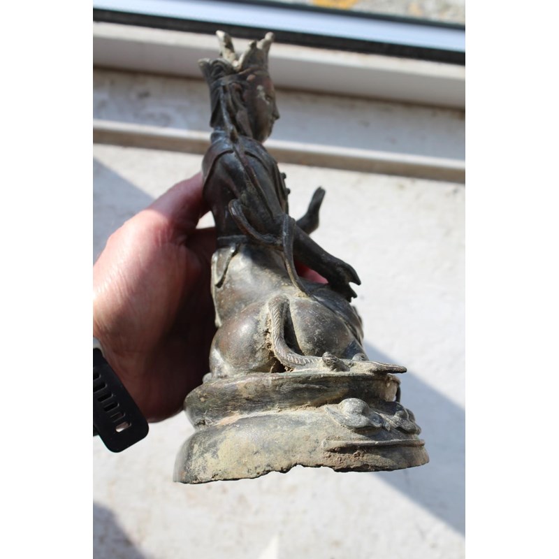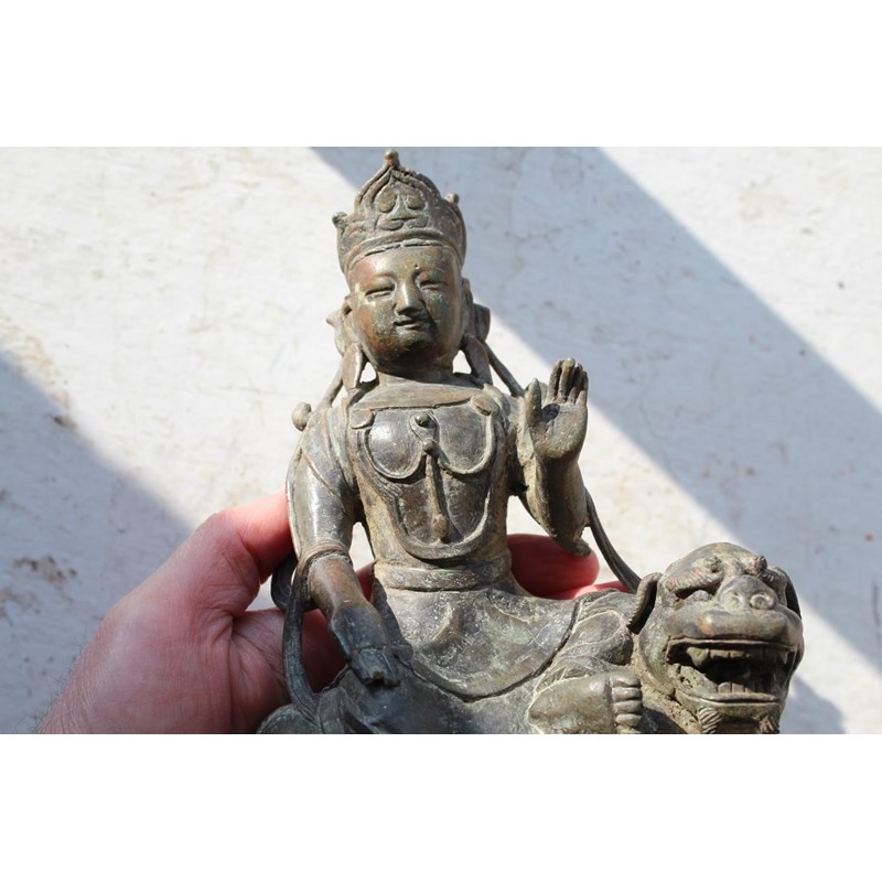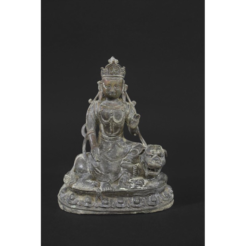 TIBETAN/CHINESE BUDDAH - BODHISATTVA possibly 18th or 19thc, the metal cast figure seated on a Lion and with a lotus shaped base. 22cms high