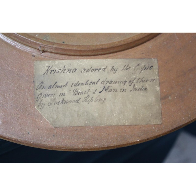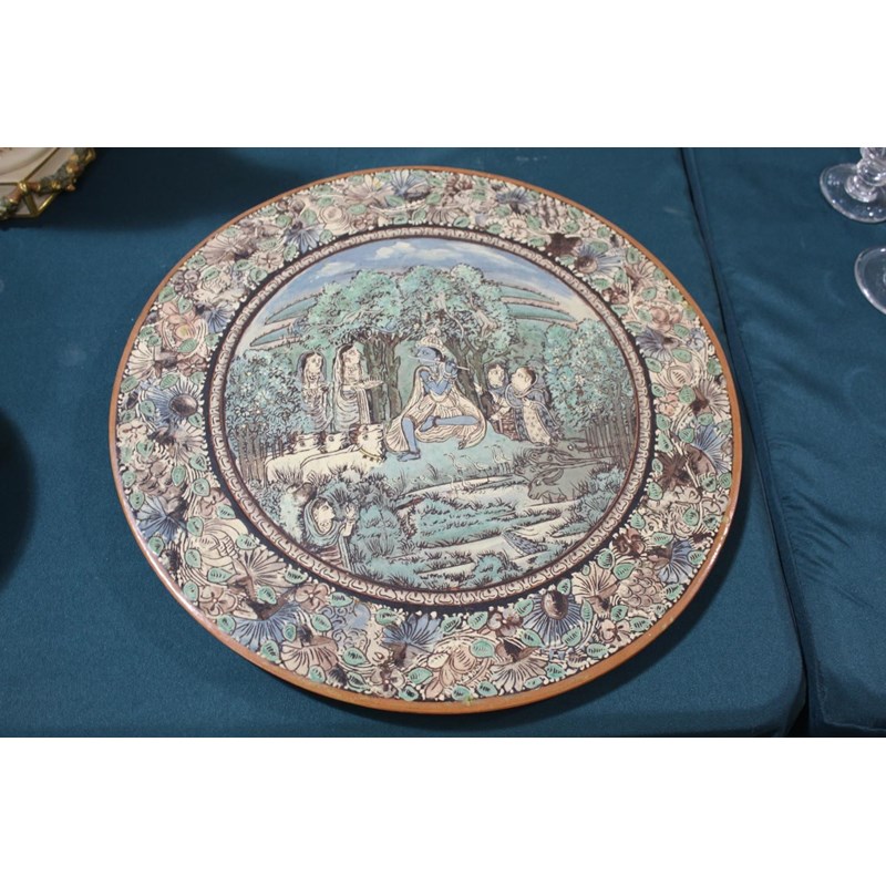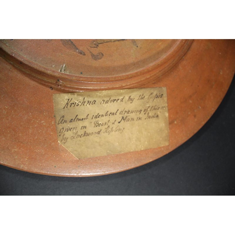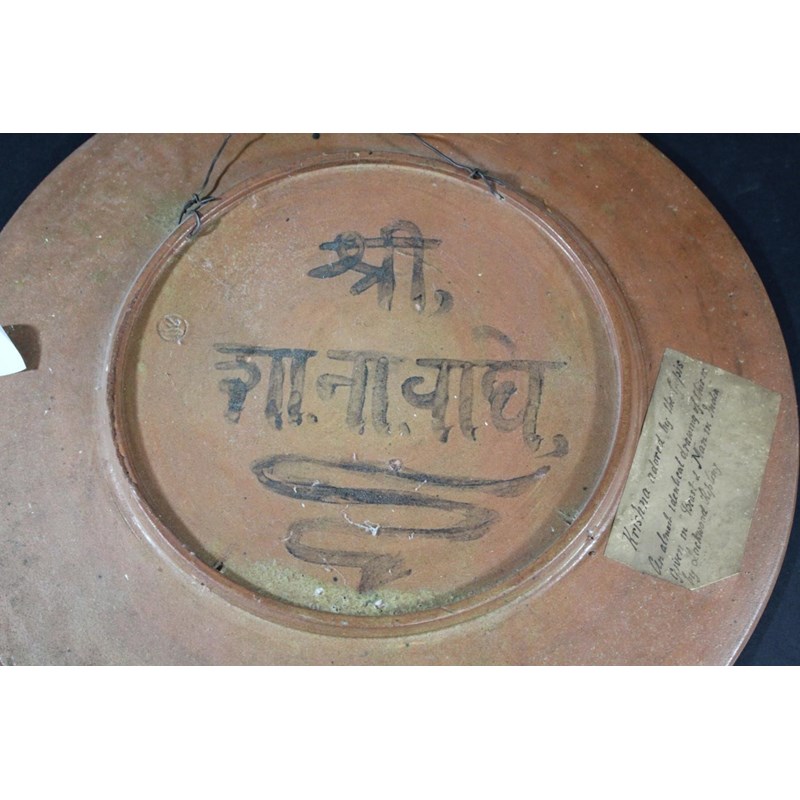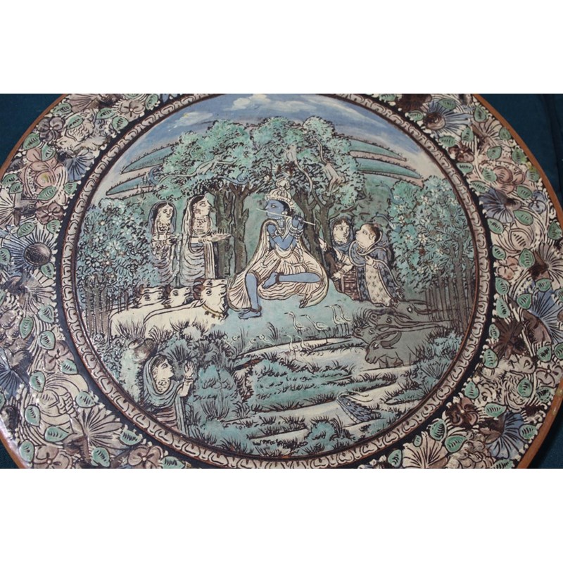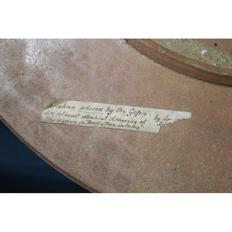 an interesting large pottery charger, painted with various Indian figures within a landscape scene, and with foliage around the border. With a label to the reverse, Krishna adored by the Gopis, and various painted marks and impressed mark. 46cms diameter