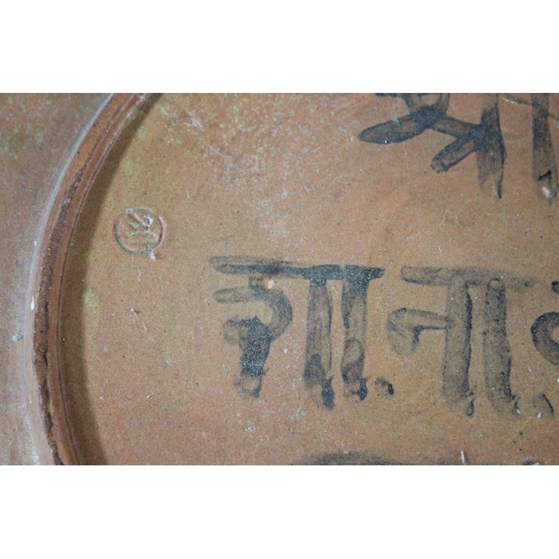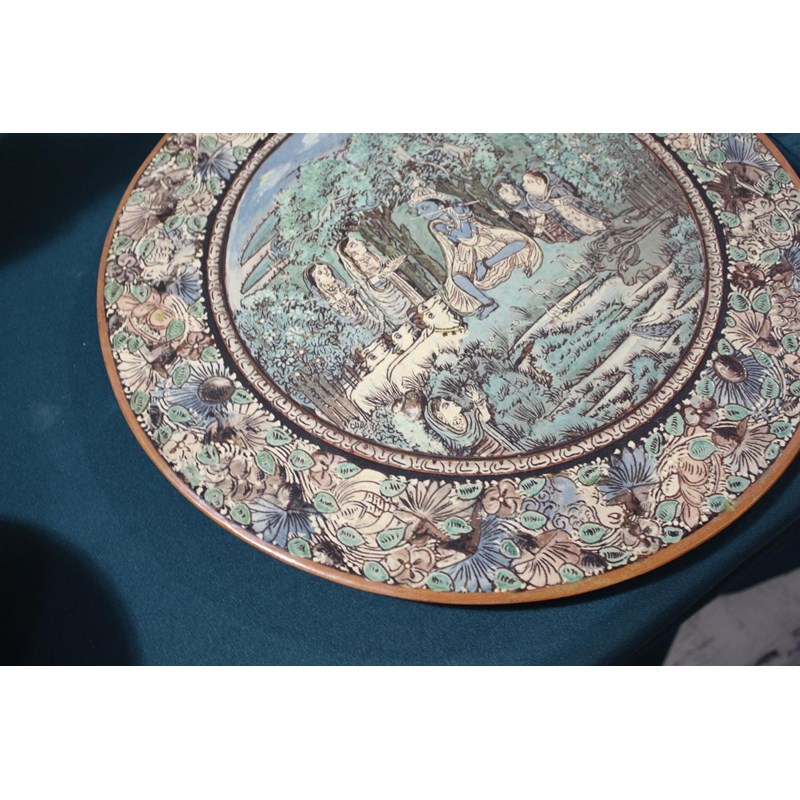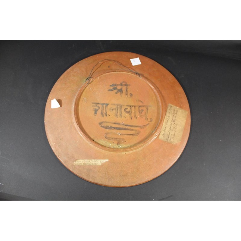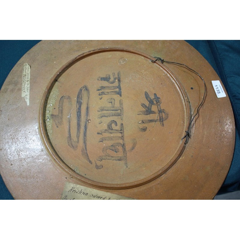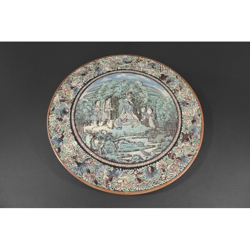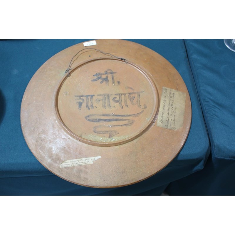 an interesting large pottery charger, painted with various Indian figures within a landscape scene, and with foliage around the border. With a label to the reverse, Krishna adored by the Gopis, and various painted marks and impressed mark. 46cms diameter
