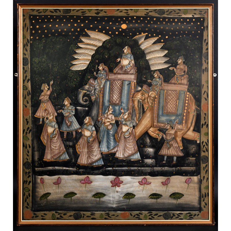 a large 19thc painting of a procession, including figures on Elephants and various other figures within a landscape scene. Painted on linen and mounted in a frame. Frame 97cms by 84cms