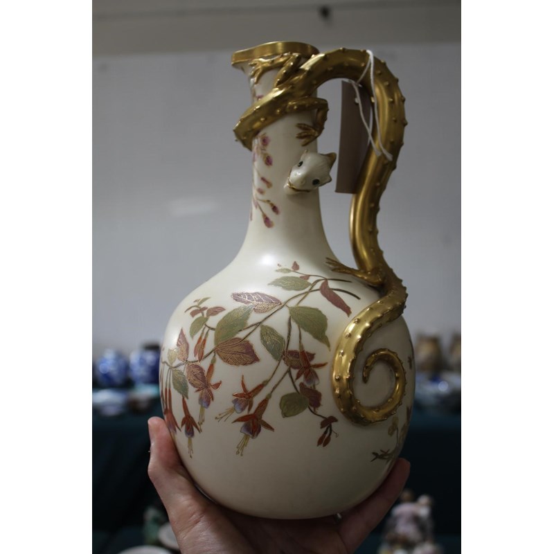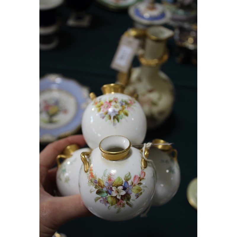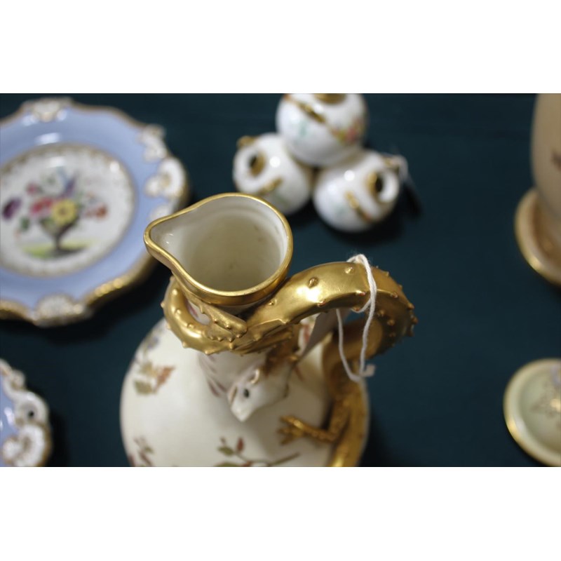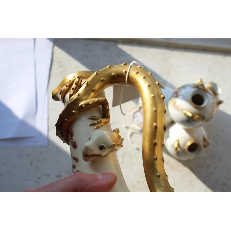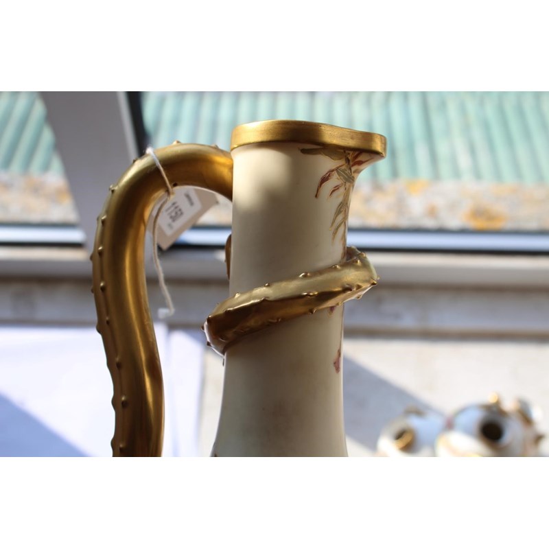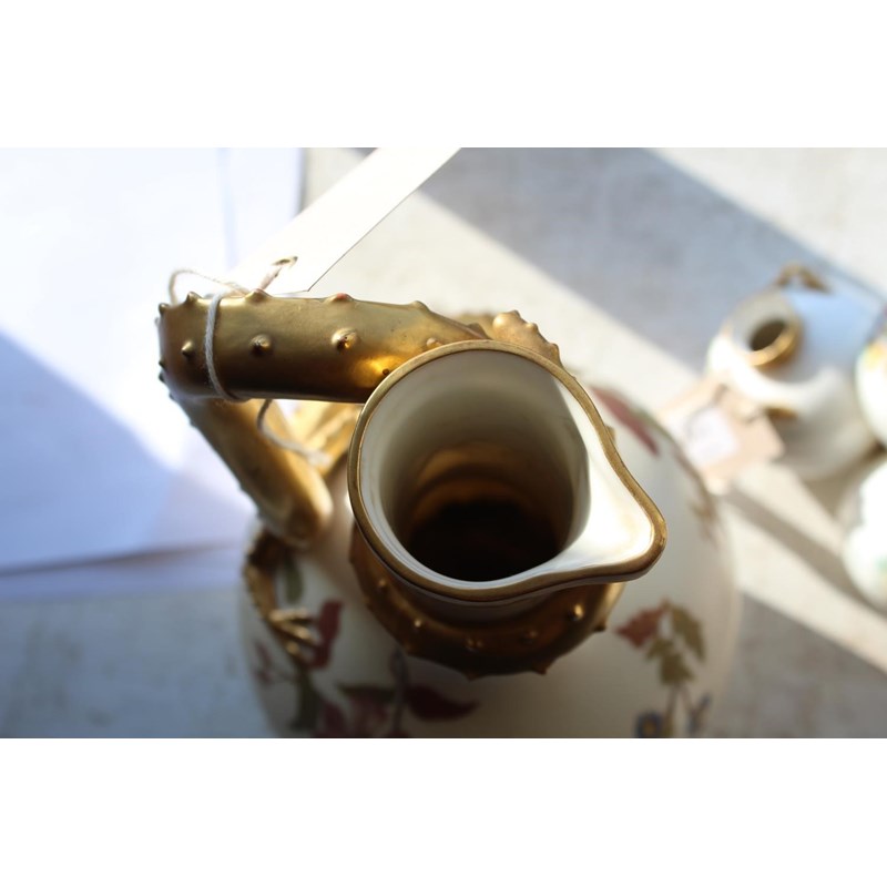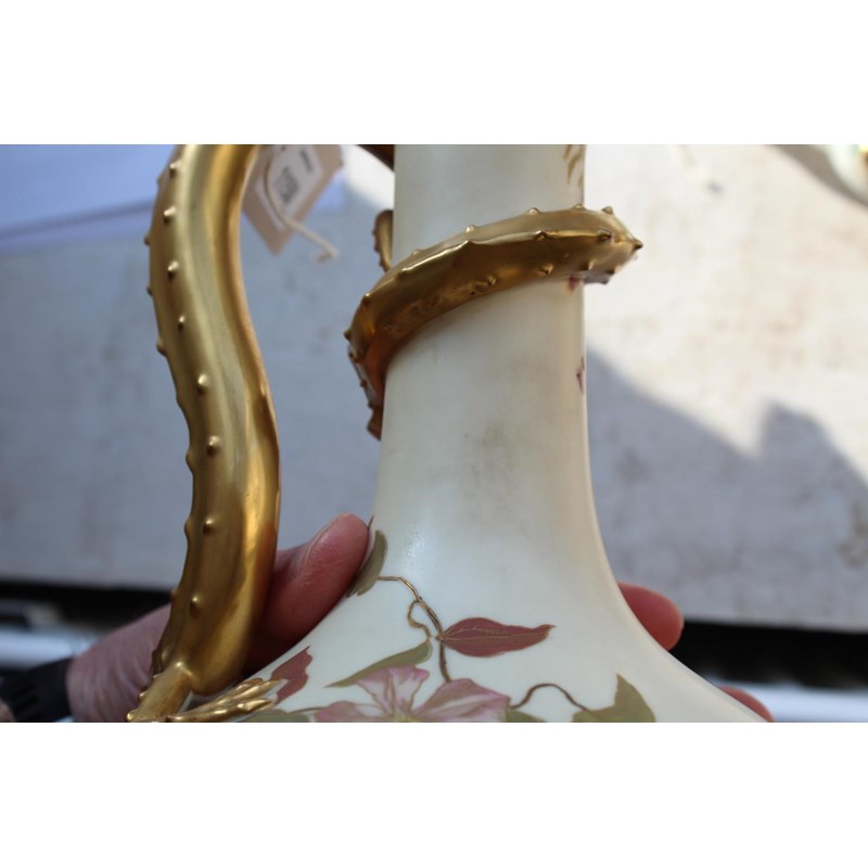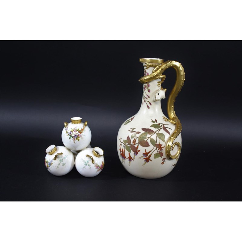 the blush ivory jug with gilded lizard handle, the body painted with various flowers and foliage. Also with a Royal Worcester vase composed of four pots placed on top of each other, each painted with flowers and gilded handles (Puce mark 14.5cms high). Lizard Jug marked, Royal Worcester, England, 260. 29cms high. (2)