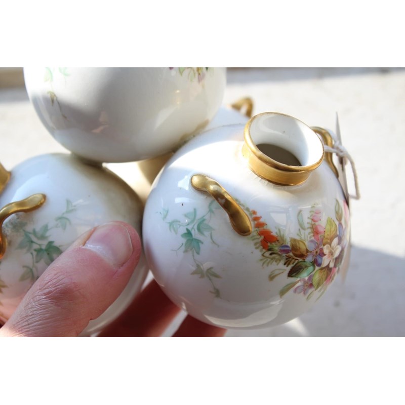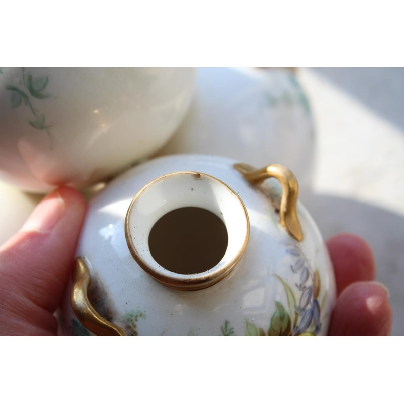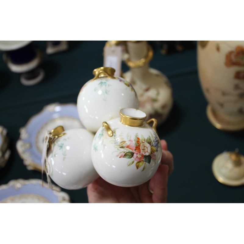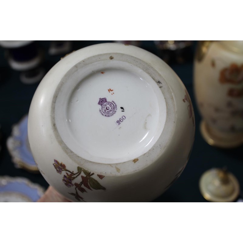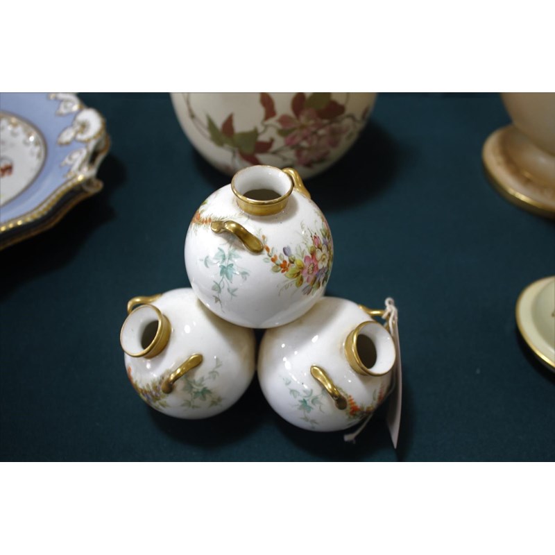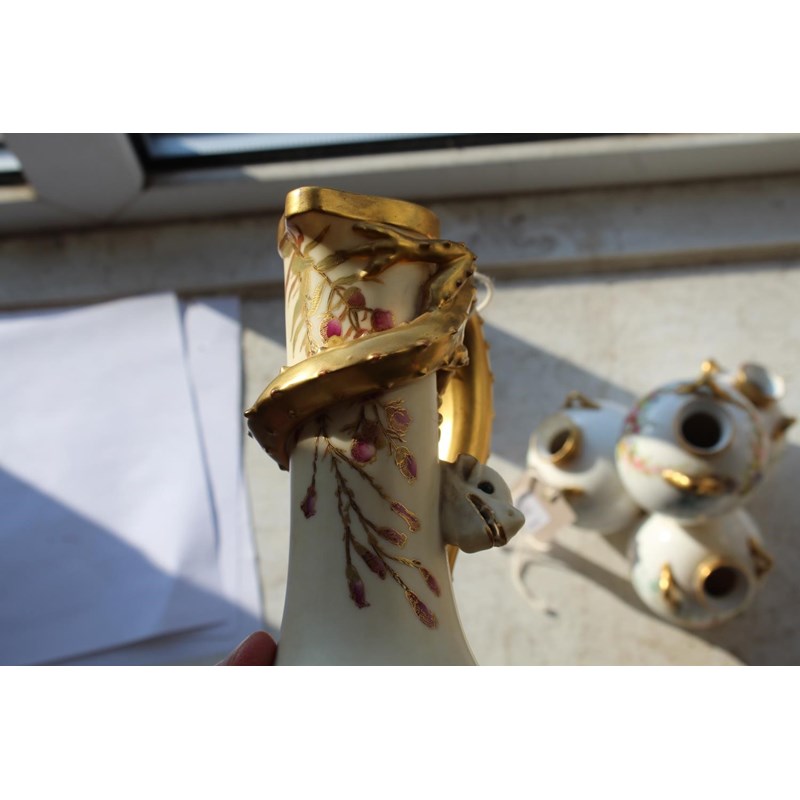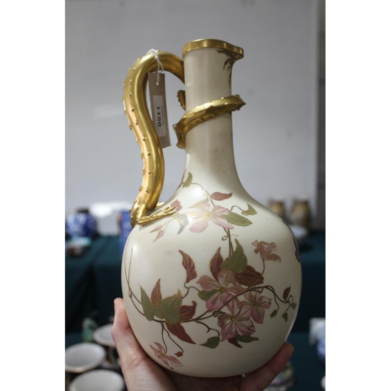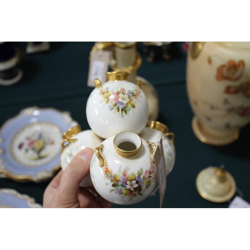 the blush ivory jug with gilded lizard handle, the body painted with various flowers and foliage. Also with a Royal Worcester vase composed of four pots placed on top of each other, each painted with flowers and gilded handles (Puce mark 14.5cms high). Lizard Jug marked, Royal Worcester, England, 260. 29cms high. (2)