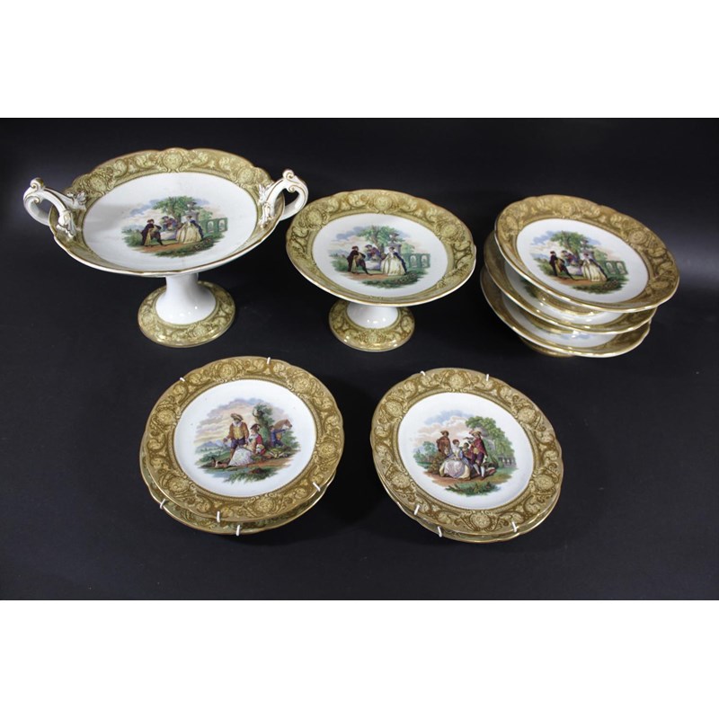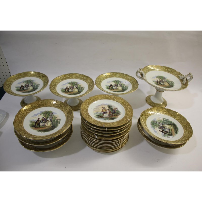 pattern 704 and probably by Fenton & Sons, a large service comprising nine comports of varying sizes, and sixteen circular plates (22cms diameter). Each piece with a transfer printed design and rich gilded border, one with a collection label for the Manners Collection. (25)