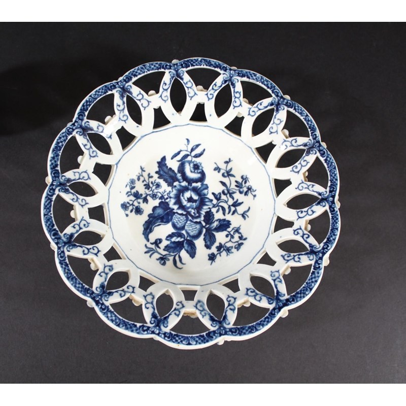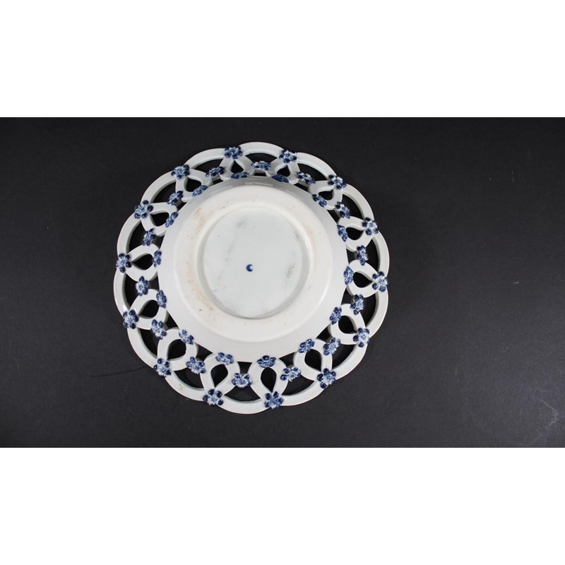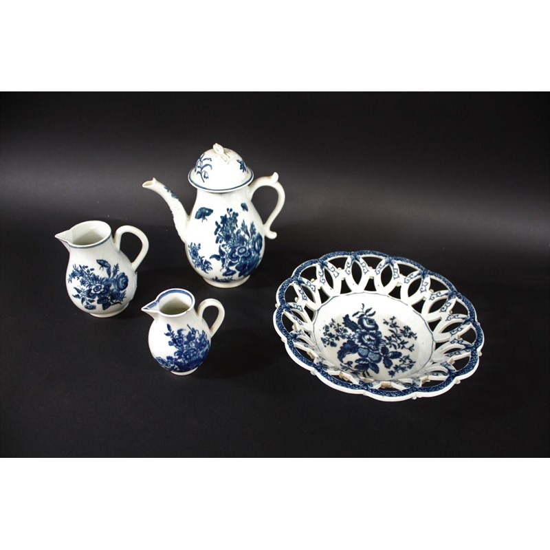 a porcelain pierced basket in the Pinecone design, also with two Worcester jugs in the Three Flowers and Fence patterns (some damages), and a Worcester lidded coffee pot in the Three Flowers pattern (finial restored). Basket with crescent mark to base. 23cms diameter. (4)