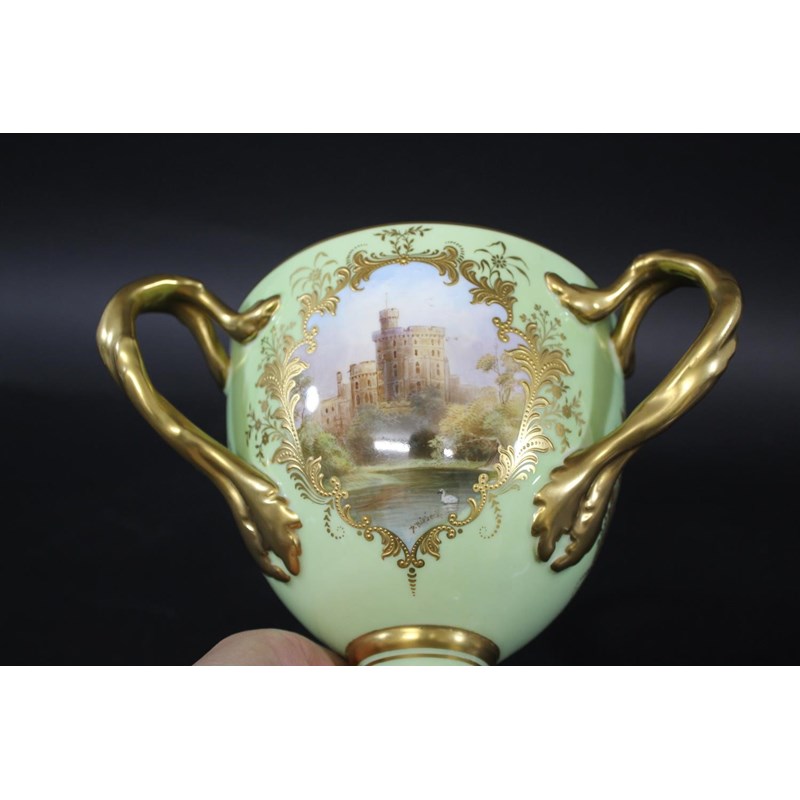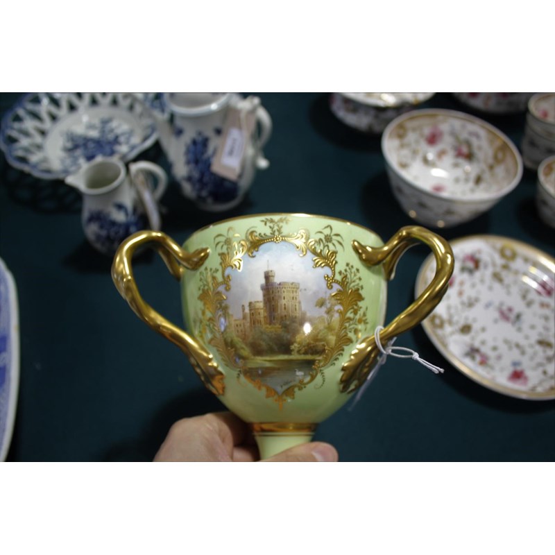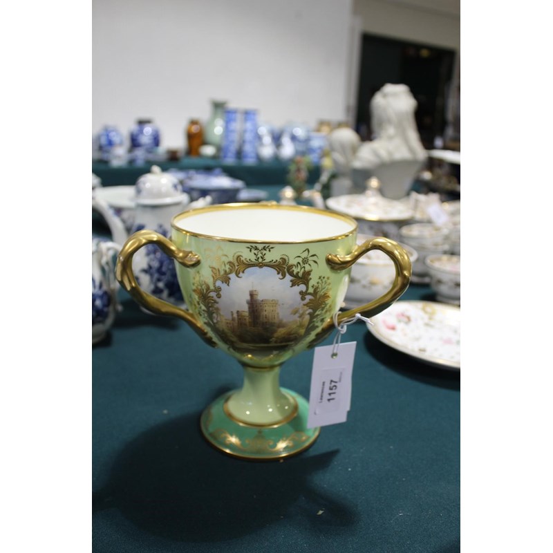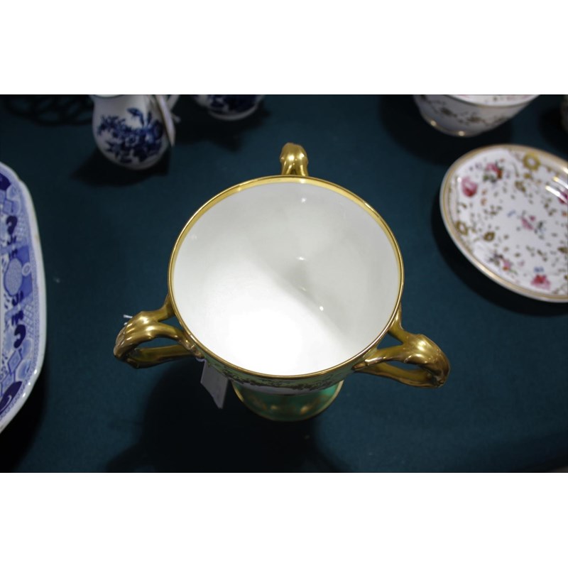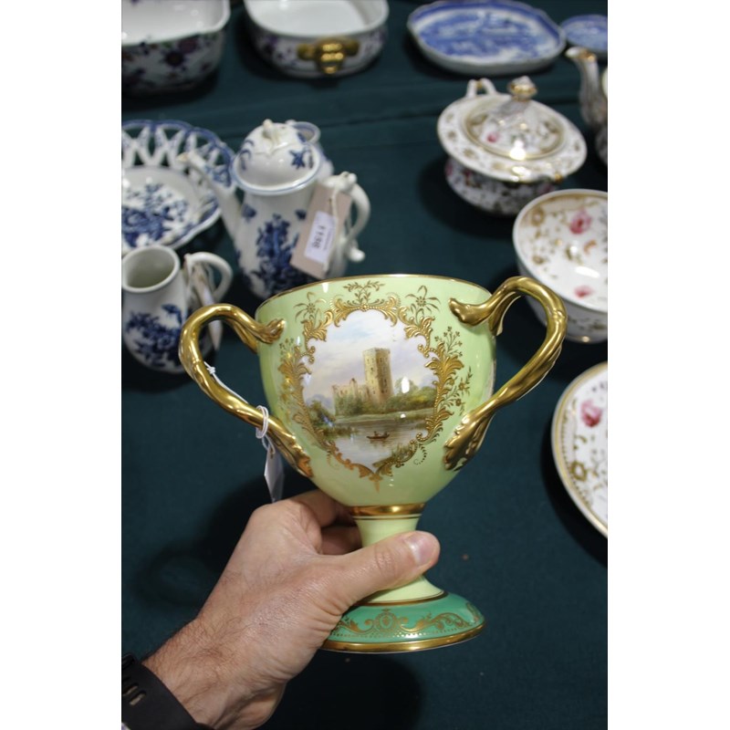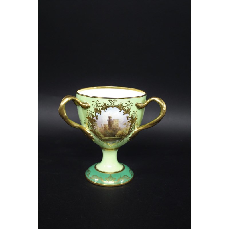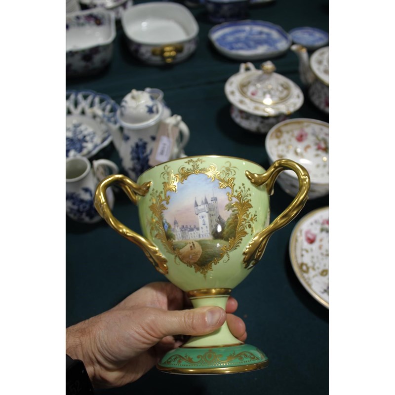a large bone china three handled cup, with three panels painted with various Castle's against a green ground. With three gilded handles and gilded decoration to the rim and base. One panel signed D Birbeck, and marked underneath Cauldon England. 18cms high