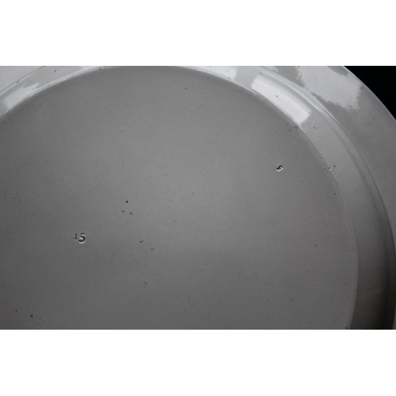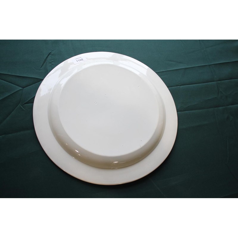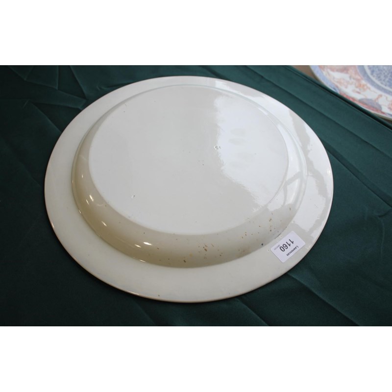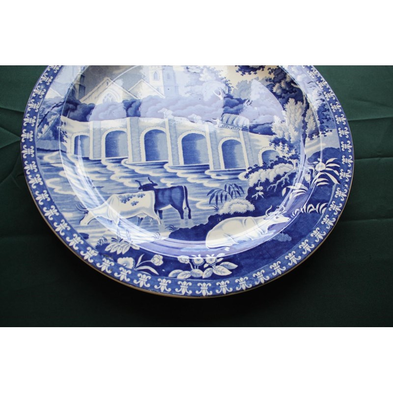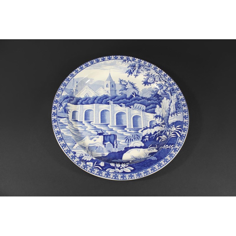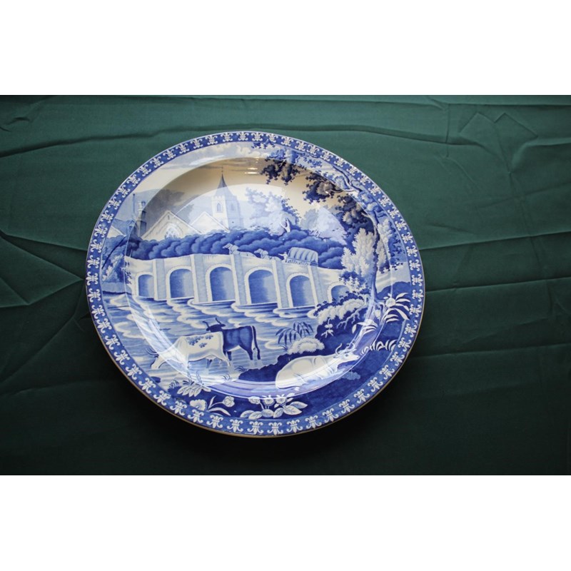 circa 1820-30, a large circular dish with a blue and white transfer printed pattern. With a depiction of a horse and cart on an arched bridge with Church behind, and with Cows in the foreground by a fast moving river. Impressed numbers, 15, 5. 37.5cms diameter