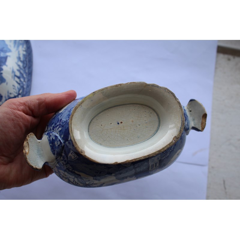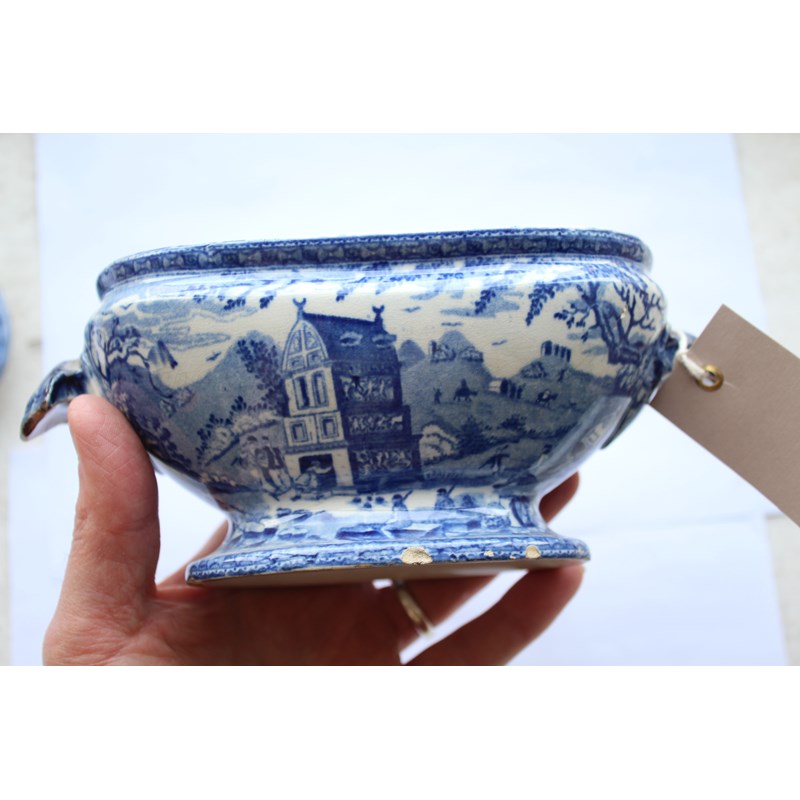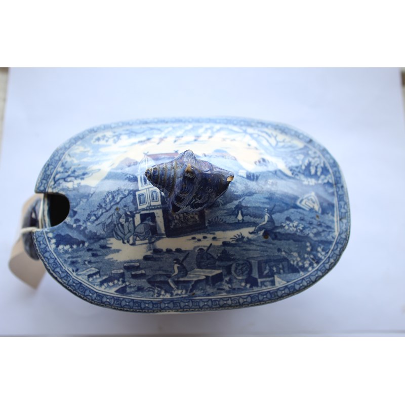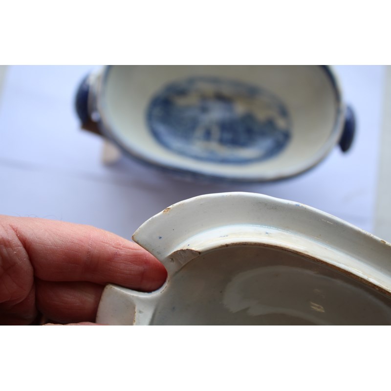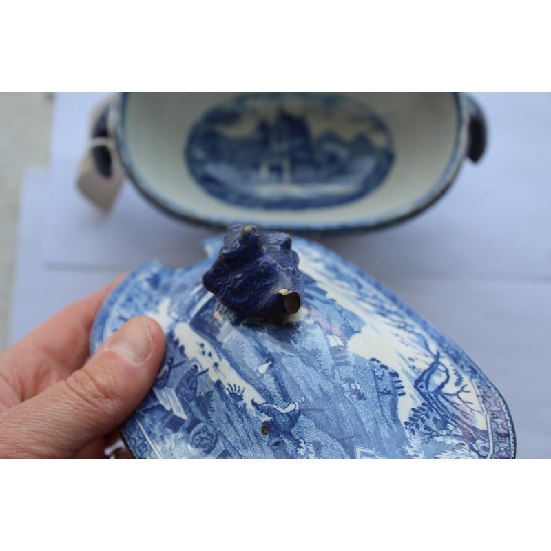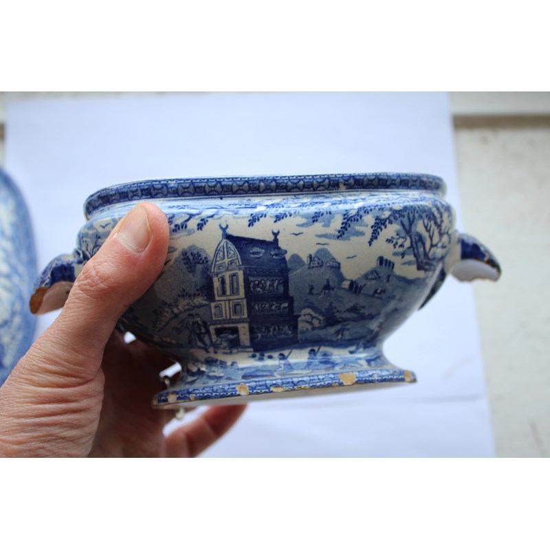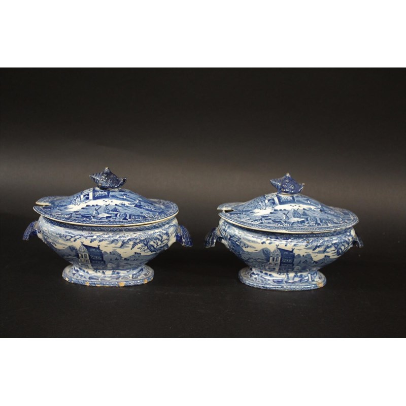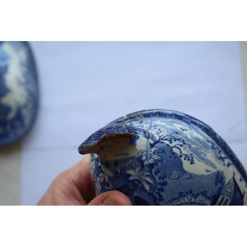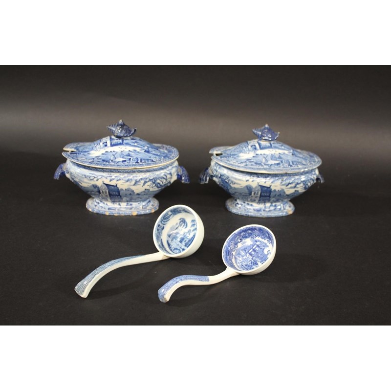 a pair of lidded tureens with shell shaped finials and handles, with blue and white transfer printed designs of exotic buildings and various figures within a mountainous landscapes (some damages), also with two ladles with differing patterns. Tureens 13.5cms high. (4)