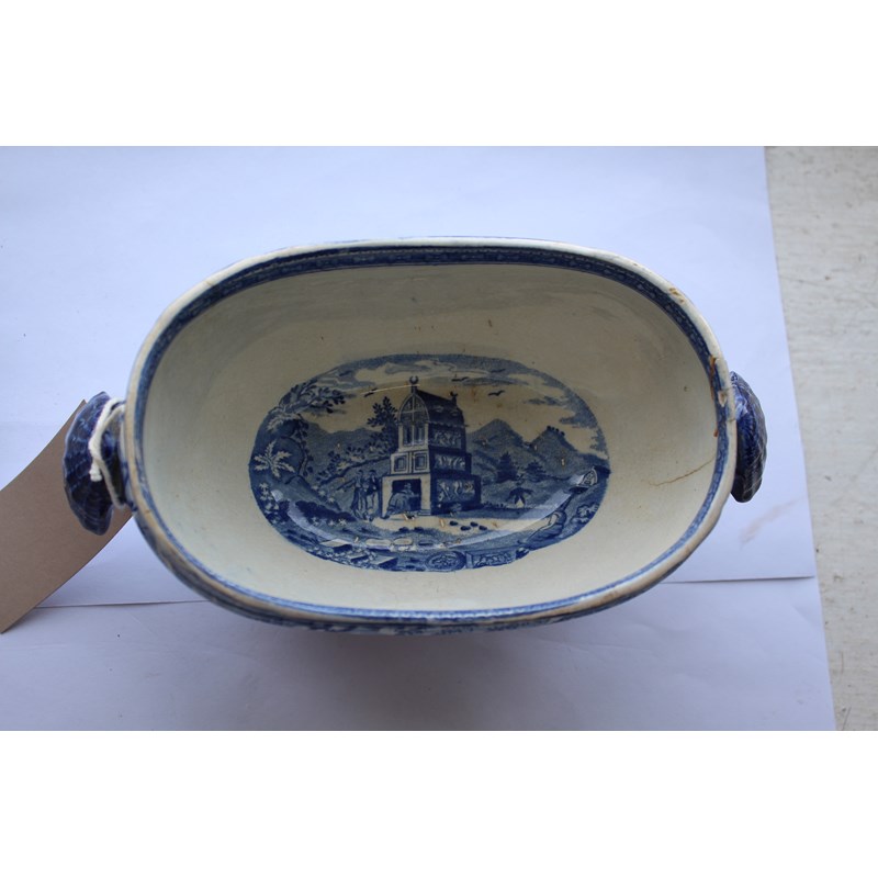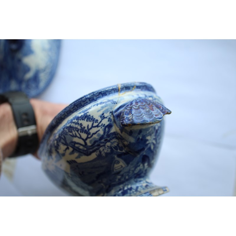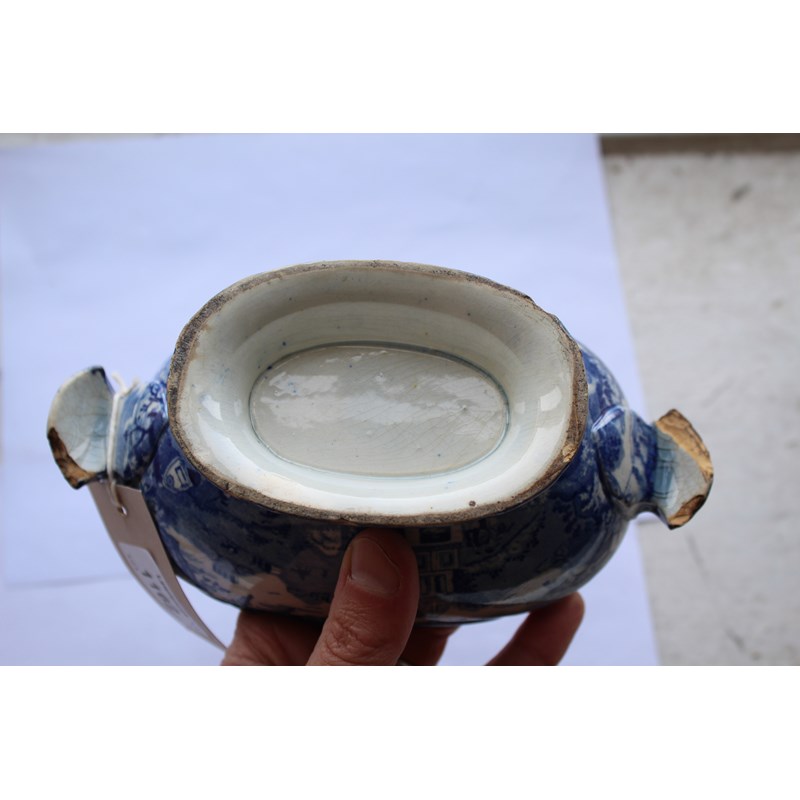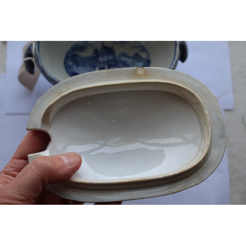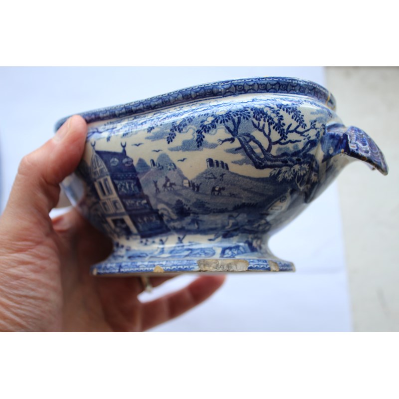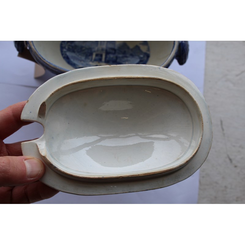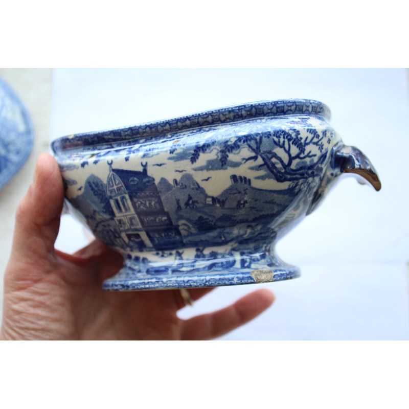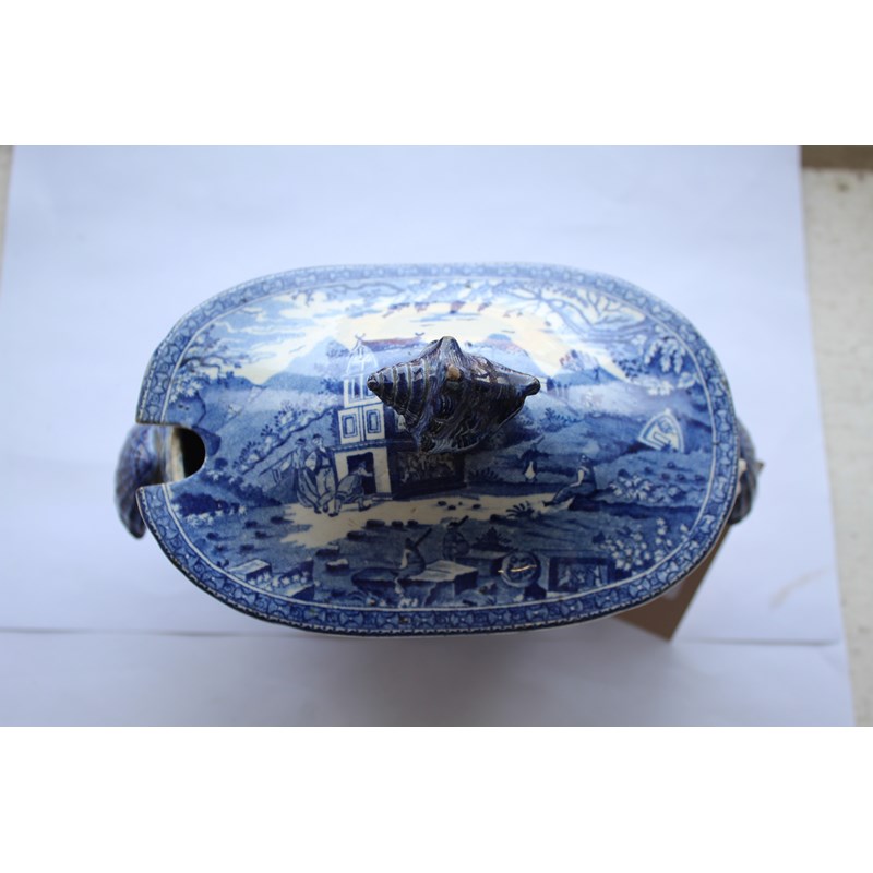 a pair of lidded tureens with shell shaped finials and handles, with blue and white transfer printed designs of exotic buildings and various figures within a mountainous landscapes (some damages), also with two ladles with differing patterns. Tureens 13.5cms high. (4)