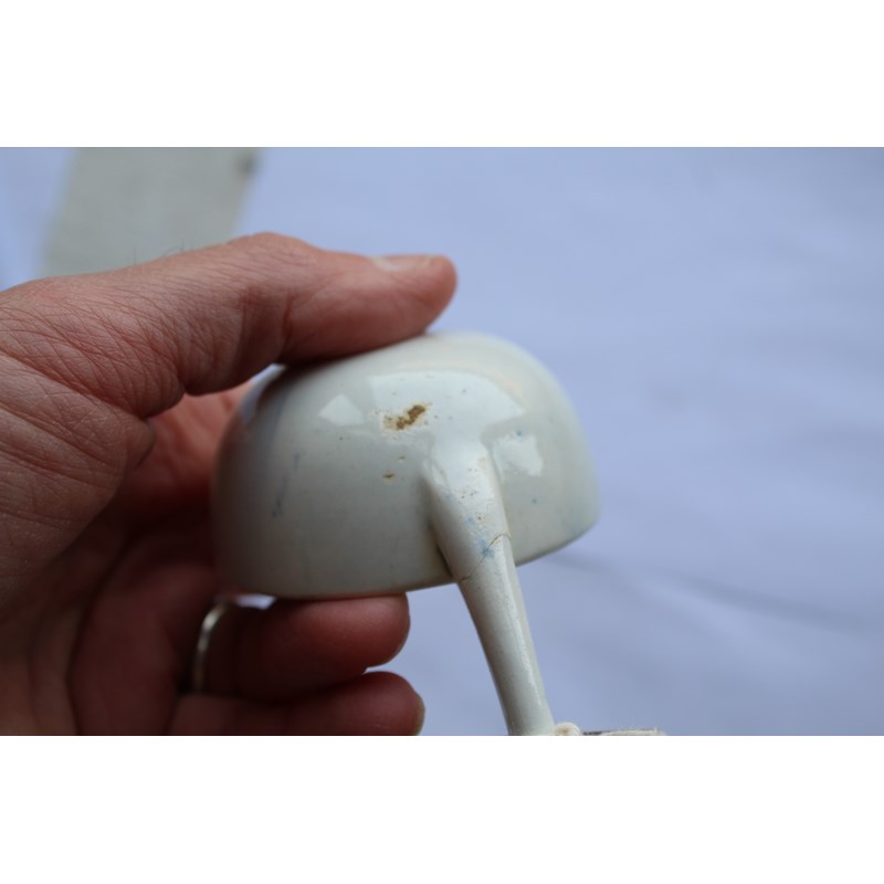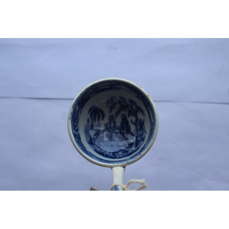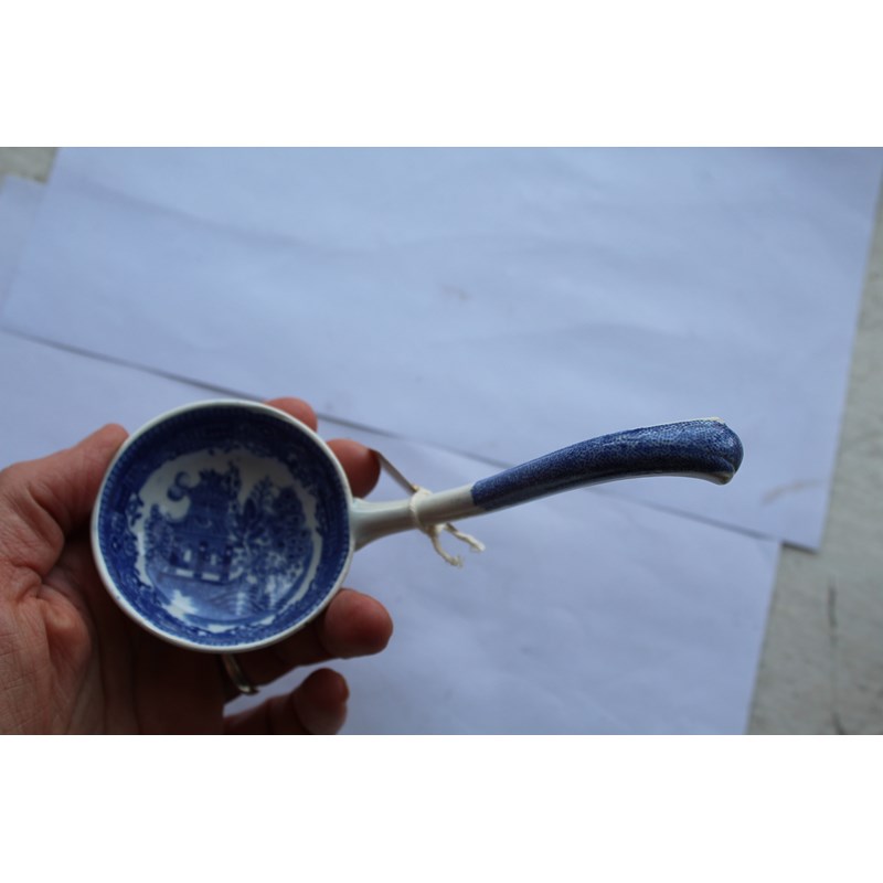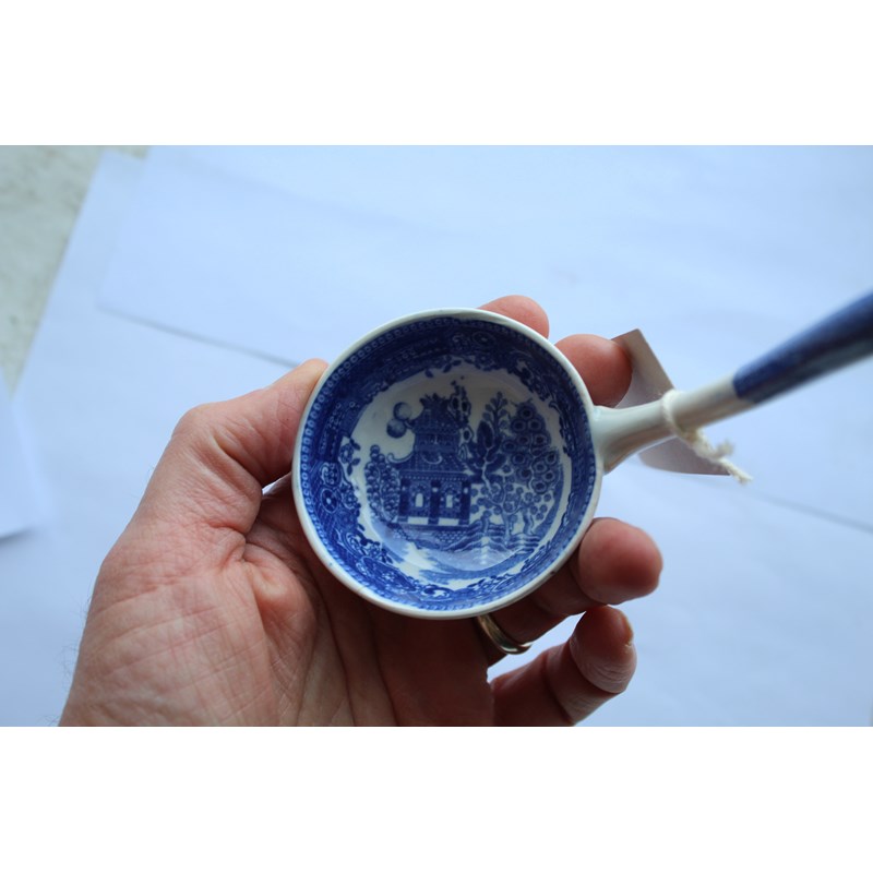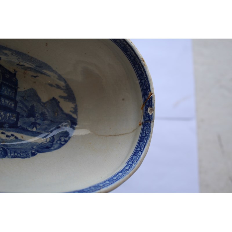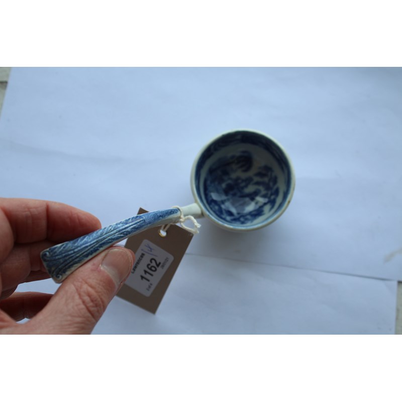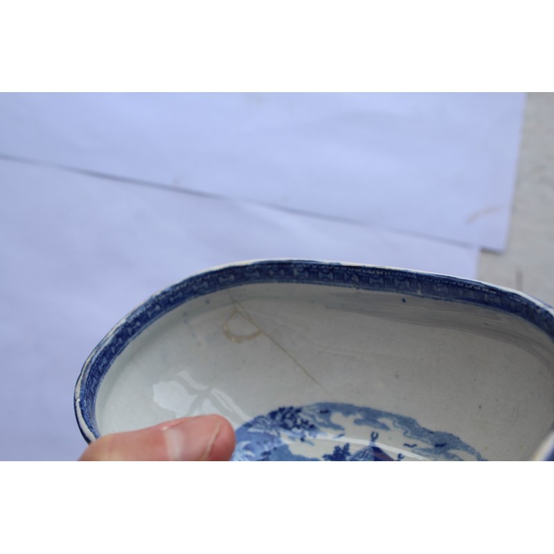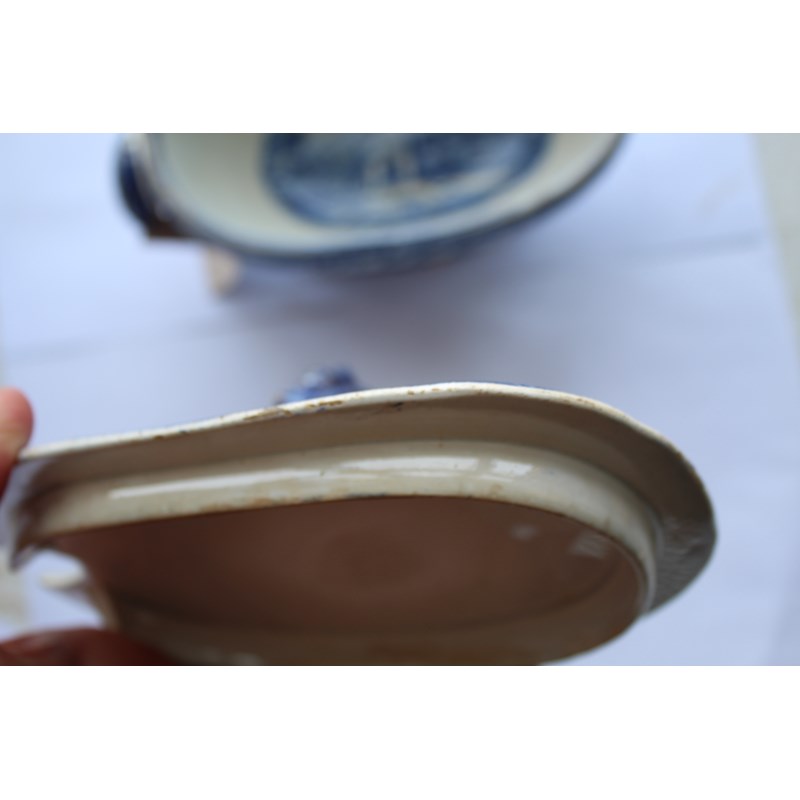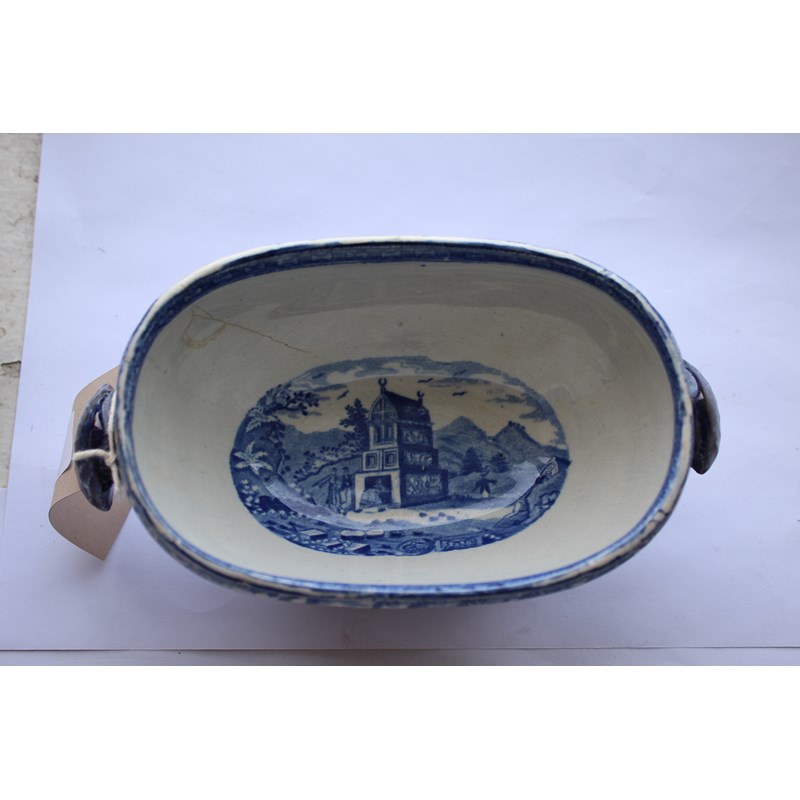 a pair of lidded tureens with shell shaped finials and handles, with blue and white transfer printed designs of exotic buildings and various figures within a mountainous landscapes (some damages), also with two ladles with differing patterns. Tureens 13.5cms high. (4)