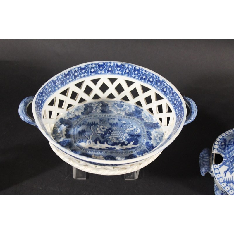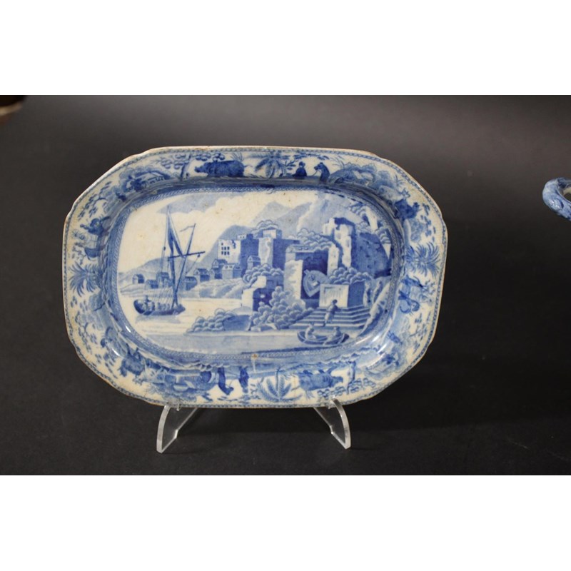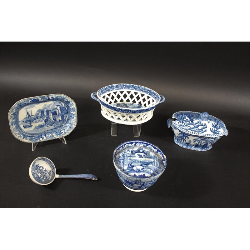 a early 19thc basket with a blue and white transfer printed design to the interior and rim (unmarked, 22cms across), also with a small Spode rectangular dish with elephants and other animals to the rim, the centre with a small boat and town scene (damaged, 18cms across), a lidded tureen with exotic buildings and figures (with ladle, not matching), and a circular lidded bowl with a large house within a landscape and sheep grazing (damages). (5)