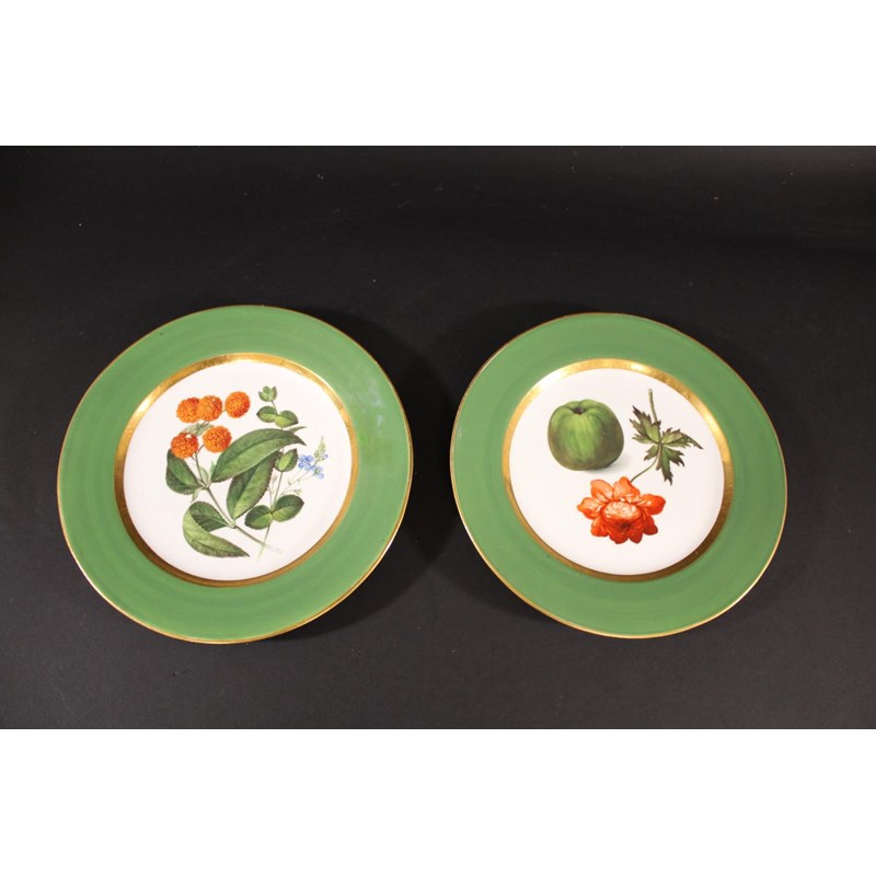 each with green rims and gilded borders, one painted with an apple and flower, the other with flowers and foliage. Unmarked, one with restored chip to underside of rim. 23cms diameter. (2)