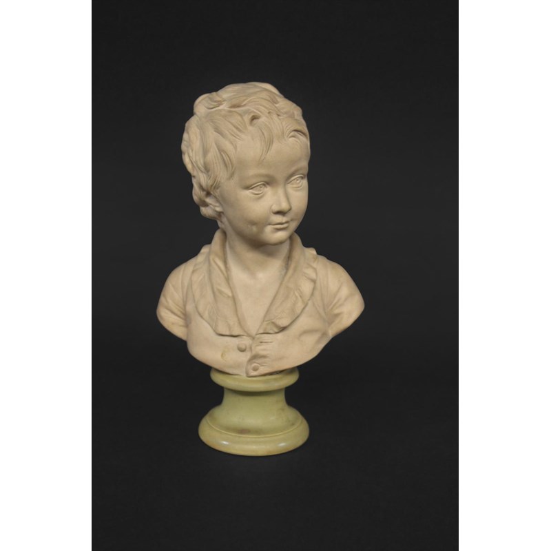 after a model by Jean Antoine Houdon, the terracotta bust mounted on a porcelain socle base. Impressed marks Alexandre Brongnart, Par Houdon, Sevres 1919, and marked to scole S DN, 1914. 20.5cms high
