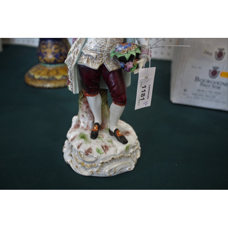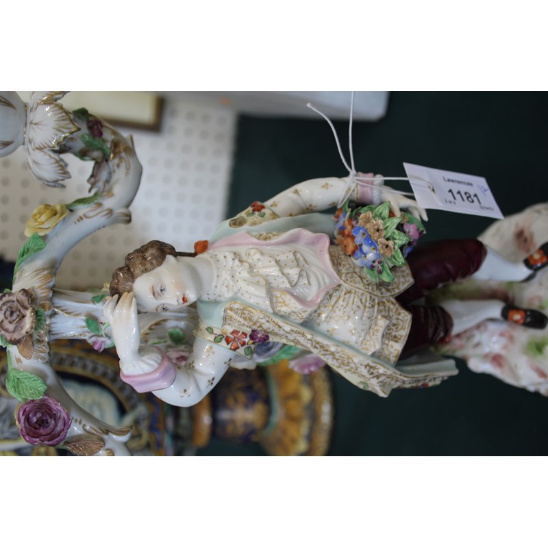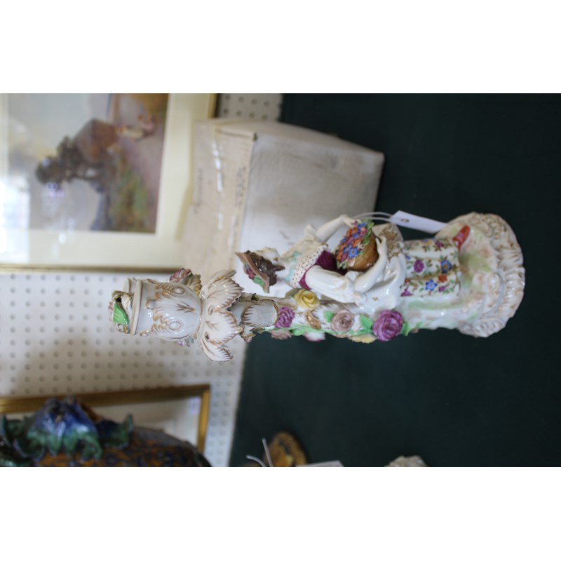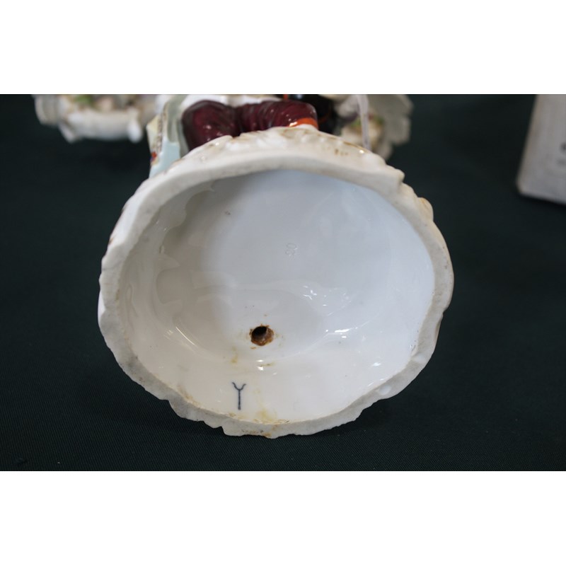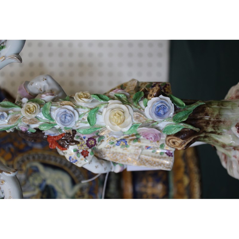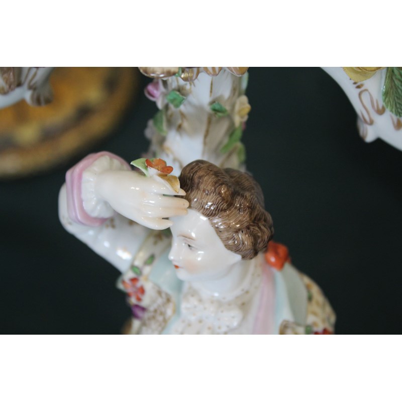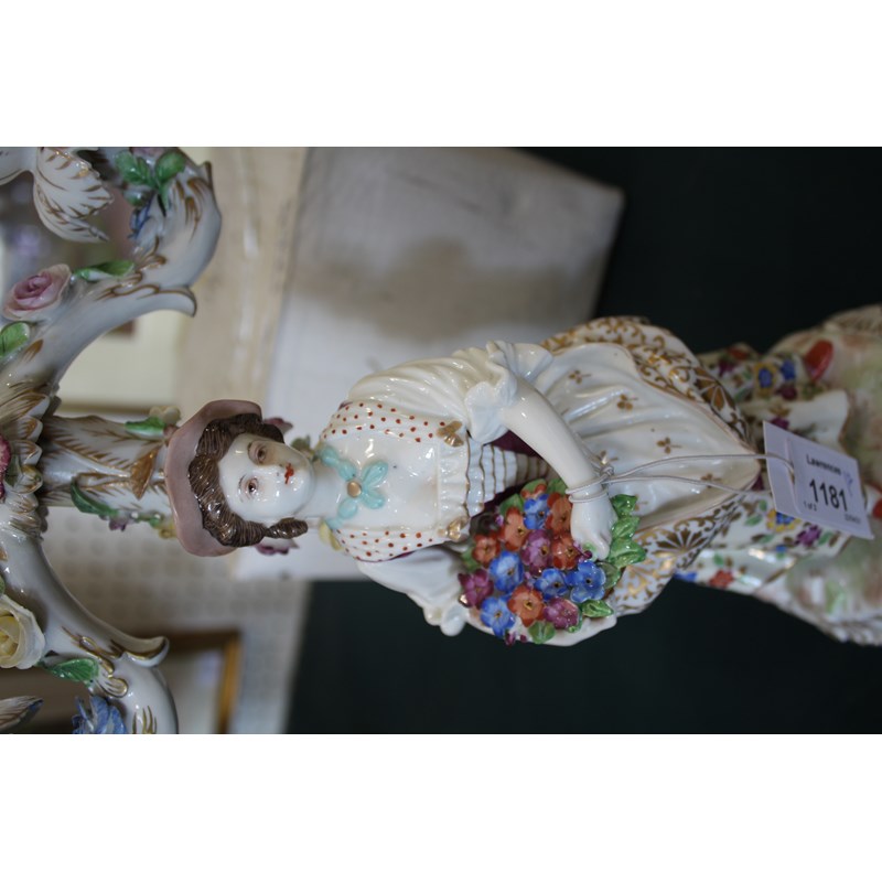 a pair of late 19thc porcelain twin branch candleabra, the figures holding baskets of flowers and mounted on rococco style bases. With various additional flowers and leaves to the candleabra. Blue fork mark to base. 34cms high. (2)