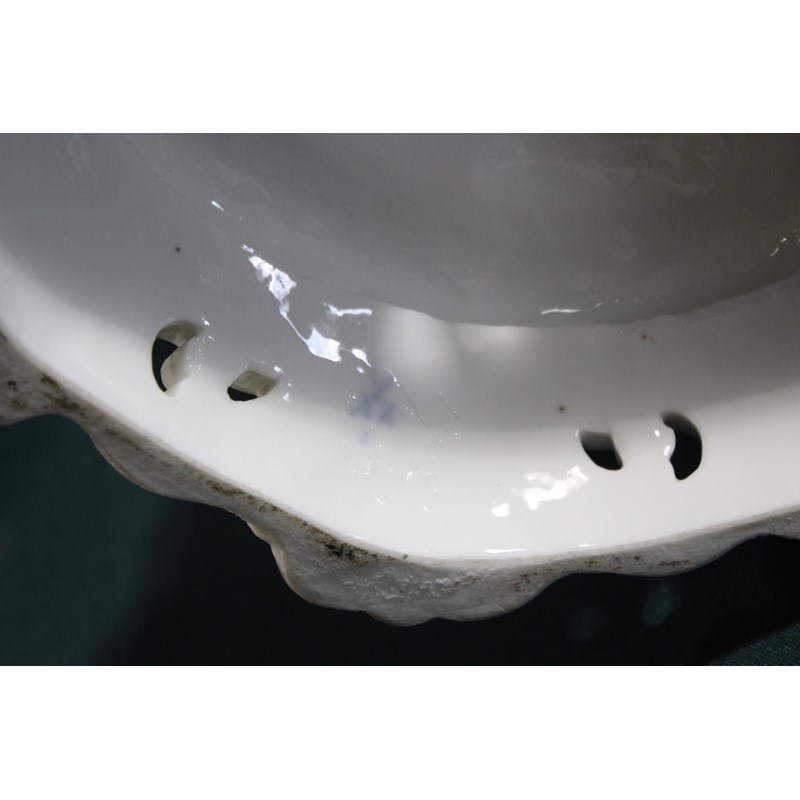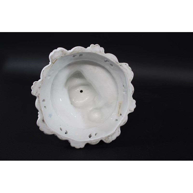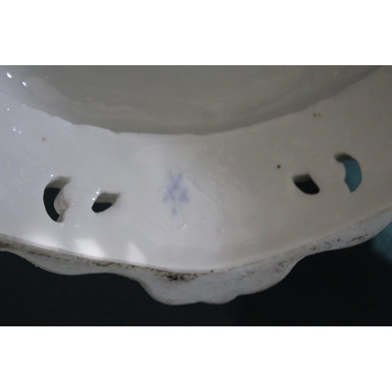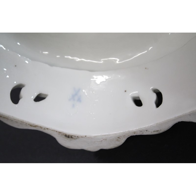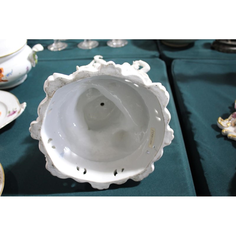 a large figure group including a lady musician and various other figures, holding garlands of flowers and with encrusted flowers and birds around the base. Some damages and restoration. Underglaze blue crossed swords mark and dot, 1702. 42cms high