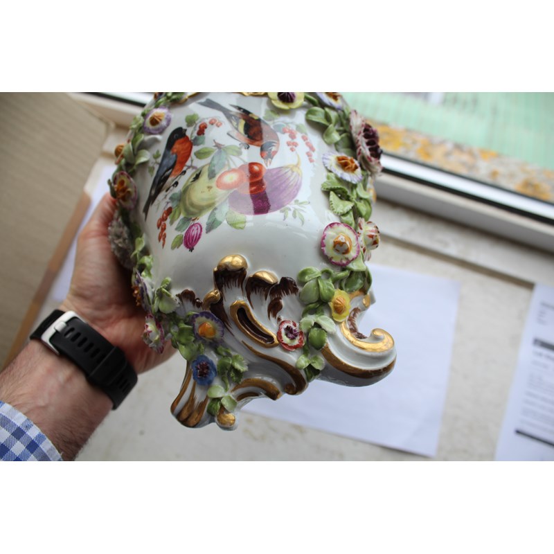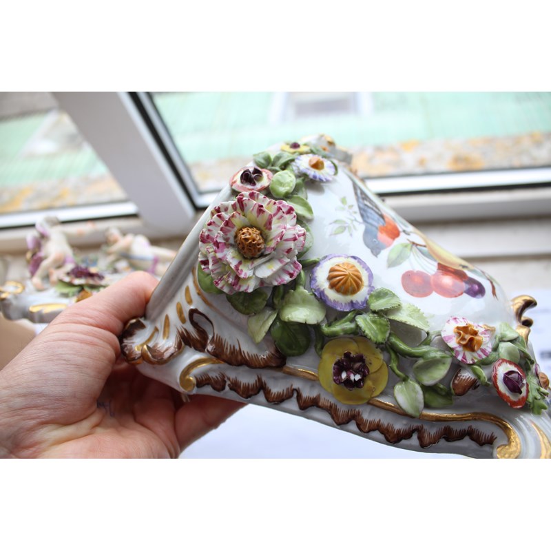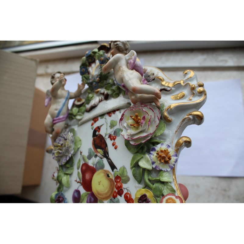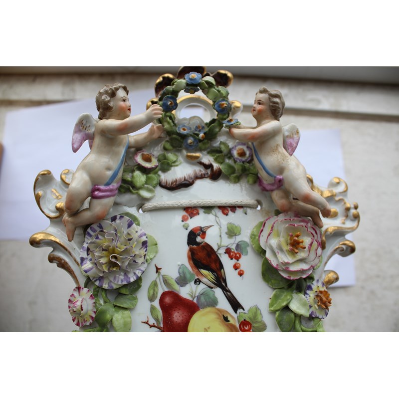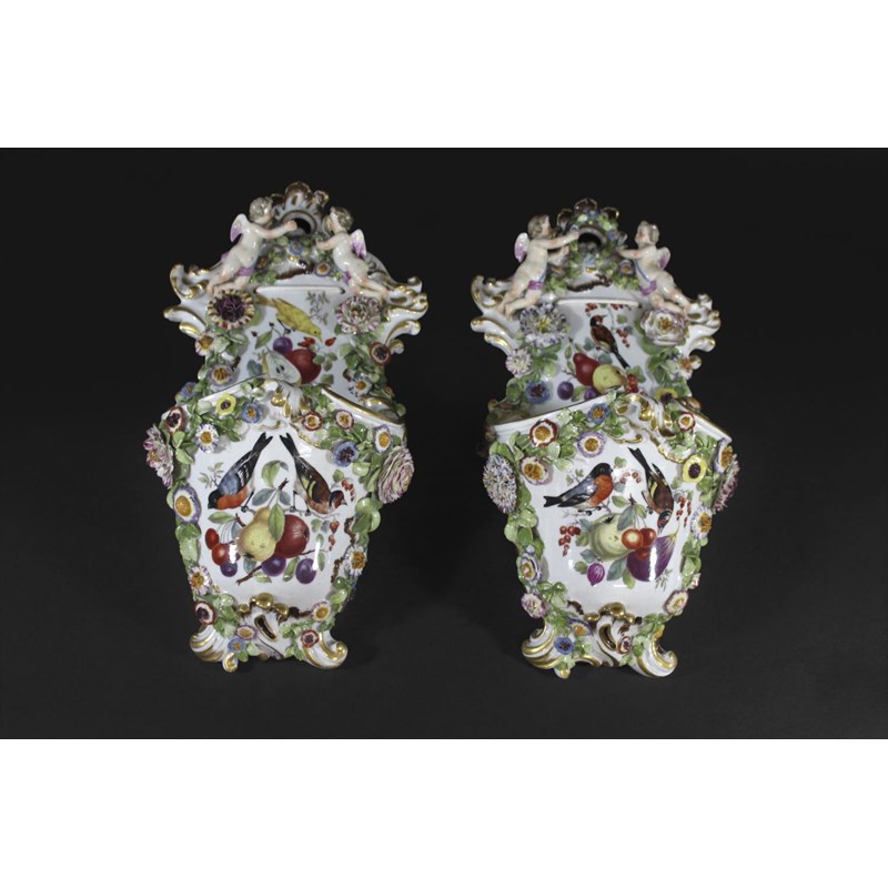 possibly by Samson of Paris in the manner of Meissen, the large wall pockets painted with various birds and flowers, heavily encrusted with flowers and mounted with winged cherubs around the tops. With blue crossed swords marks, 2198. 39cms high. (2)