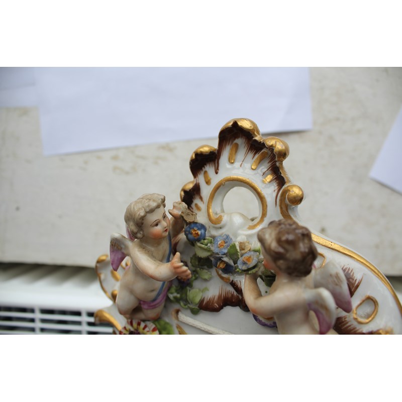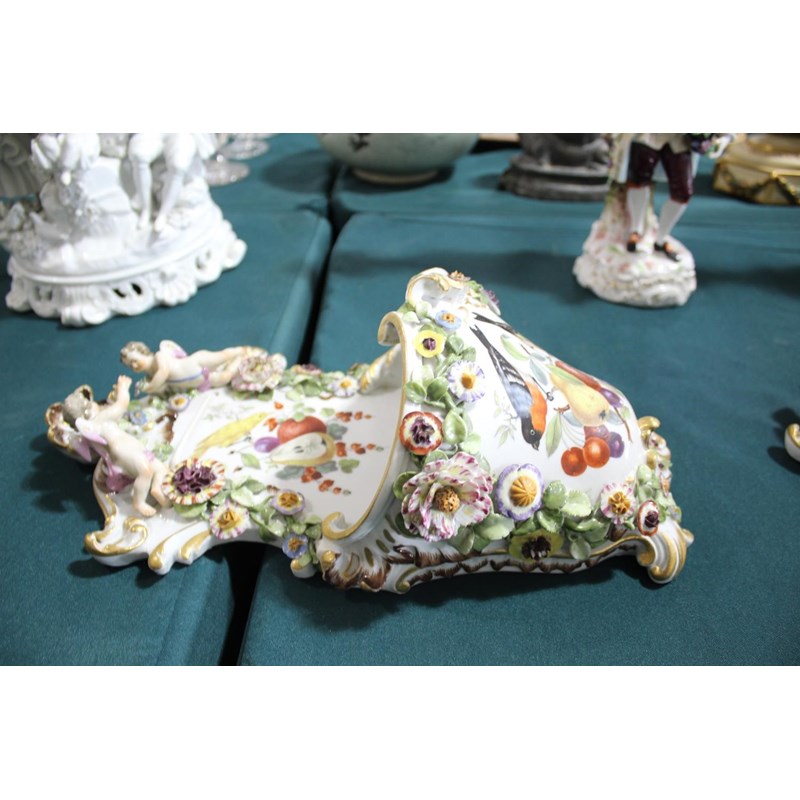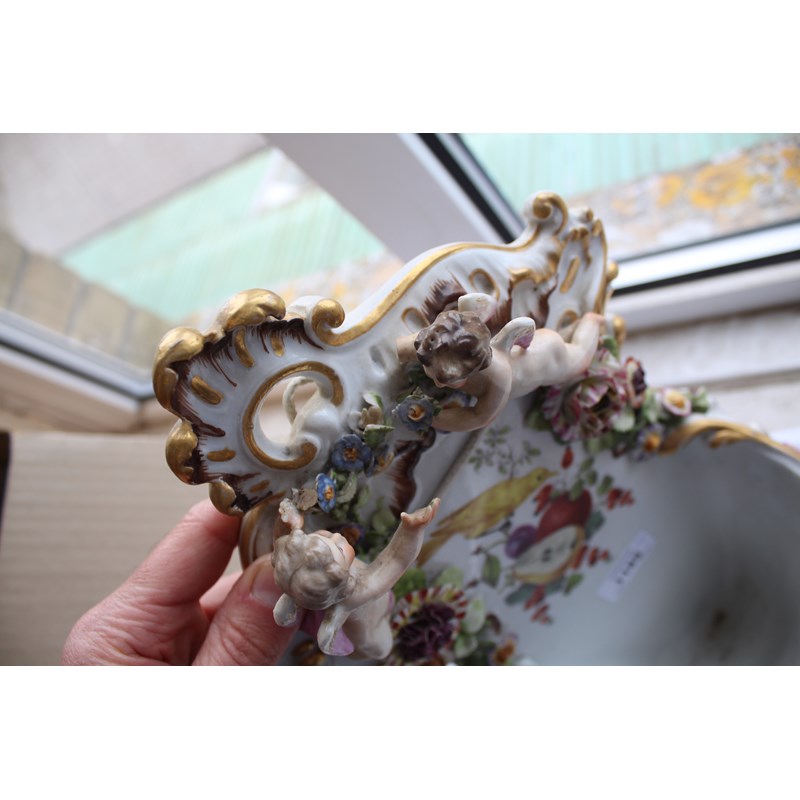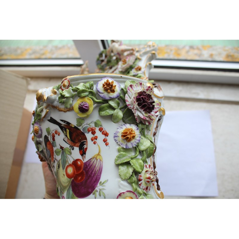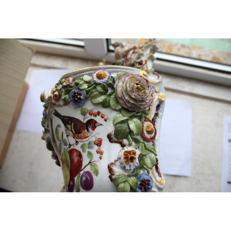 possibly by Samson of Paris in the manner of Meissen, the large wall pockets painted with various birds and flowers, heavily encrusted with flowers and mounted with winged cherubs around the tops. With blue crossed swords marks, 2198. 39cms high. (2)