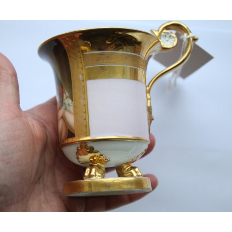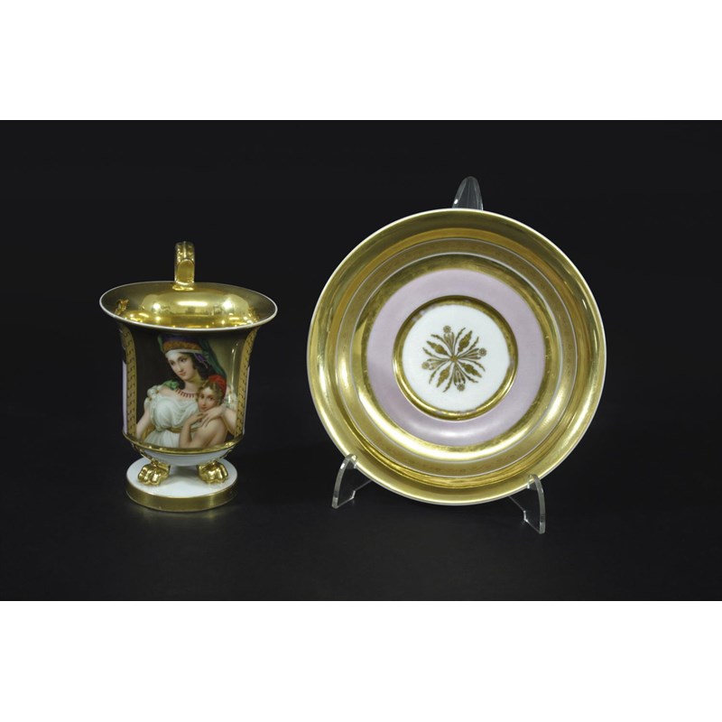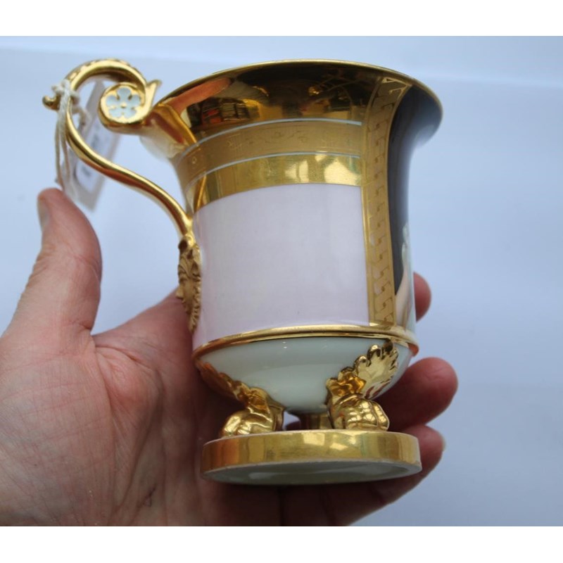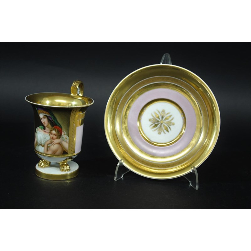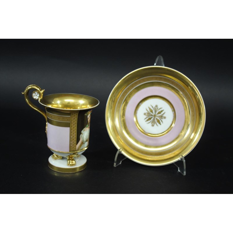 the cup painted with two female figures in a central panel, with rich gilding and mask at the base of the handle, with three claw feet and circular base. With matching saucer. Both with 'S' mark in underglaze blue. Cup 12cms high, Saucer 16cms diameter. (2)