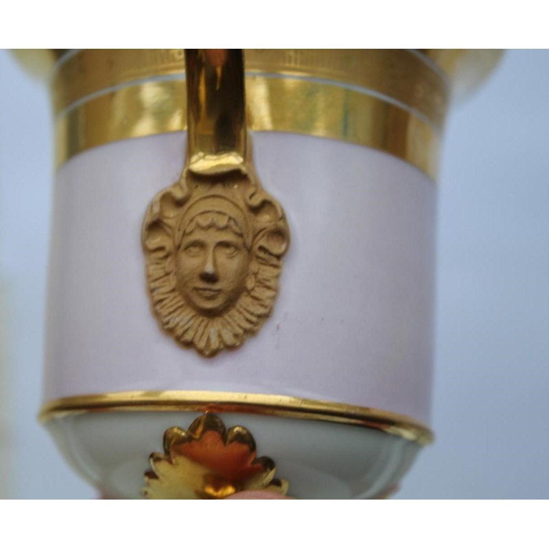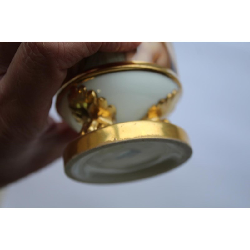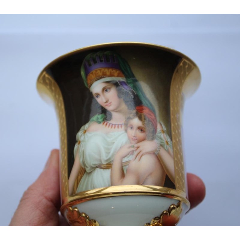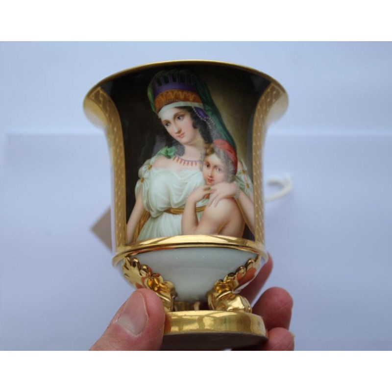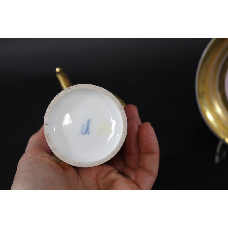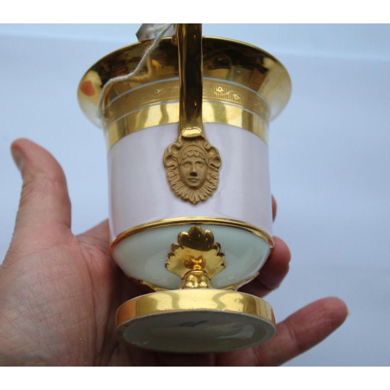 the cup painted with two female figures in a central panel, with rich gilding and mask at the base of the handle, with three claw feet and circular base. With matching saucer. Both with 'S' mark in underglaze blue. Cup 12cms high, Saucer 16cms diameter. (2)