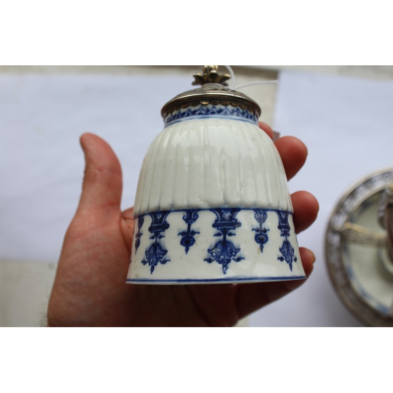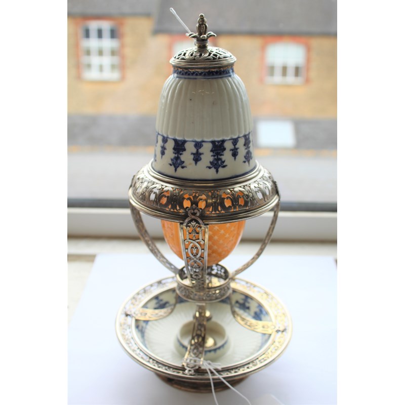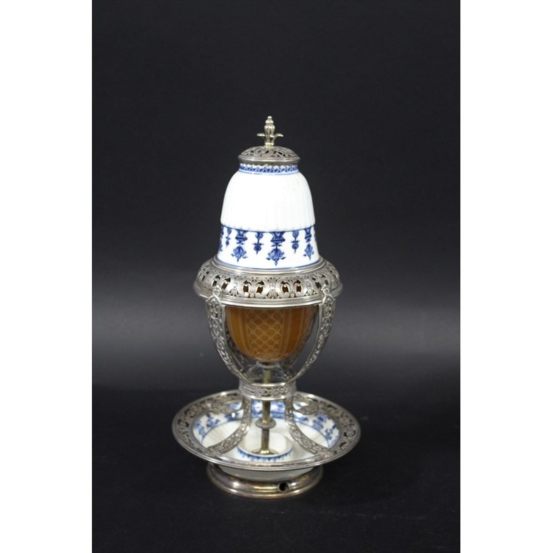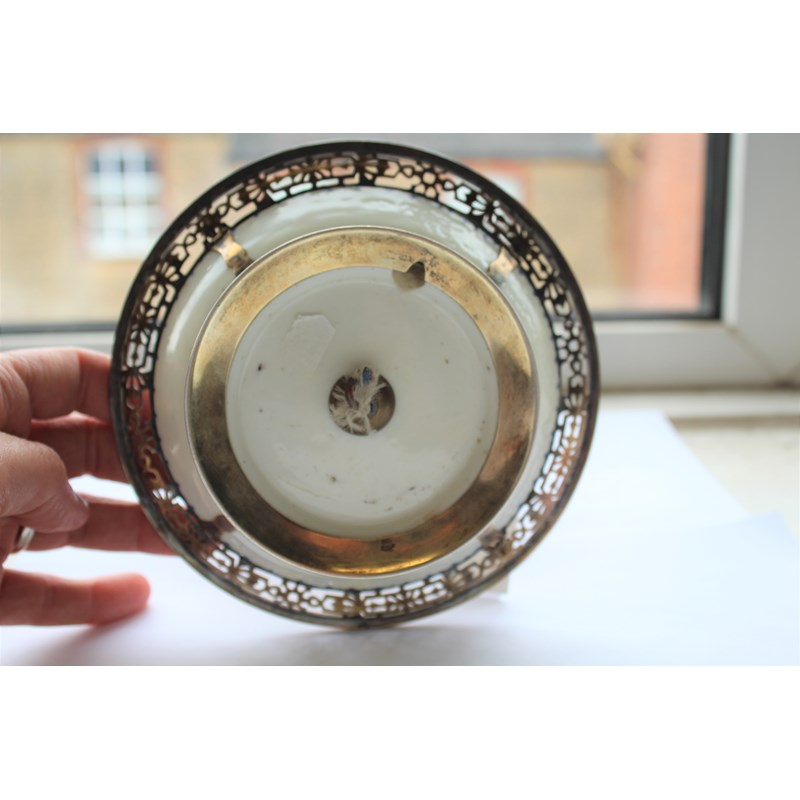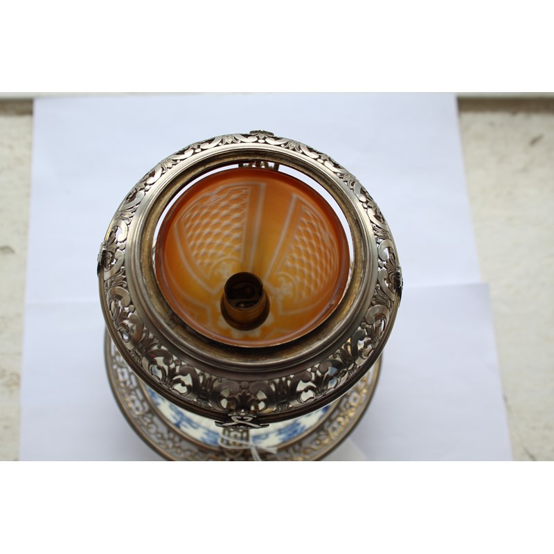 ST CLOUD - PORCELAIN LAMP & METAL MOUNTS with a porcelain fluted top with metal grill and finial, with a glass shade supported in a metal structure and fluted porcelain saucer to the base. 30.5cms high