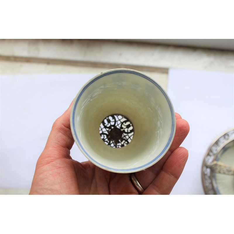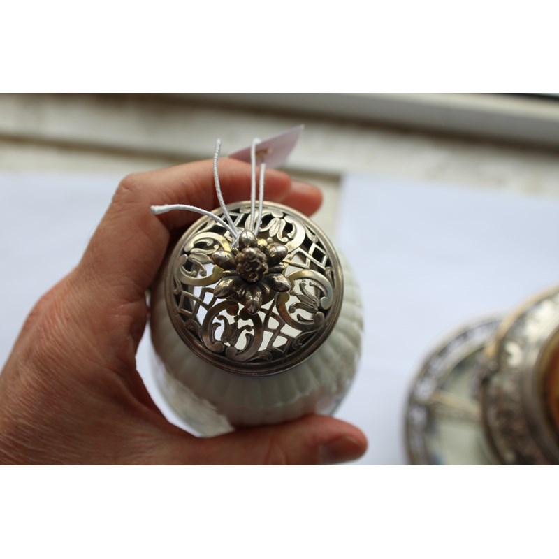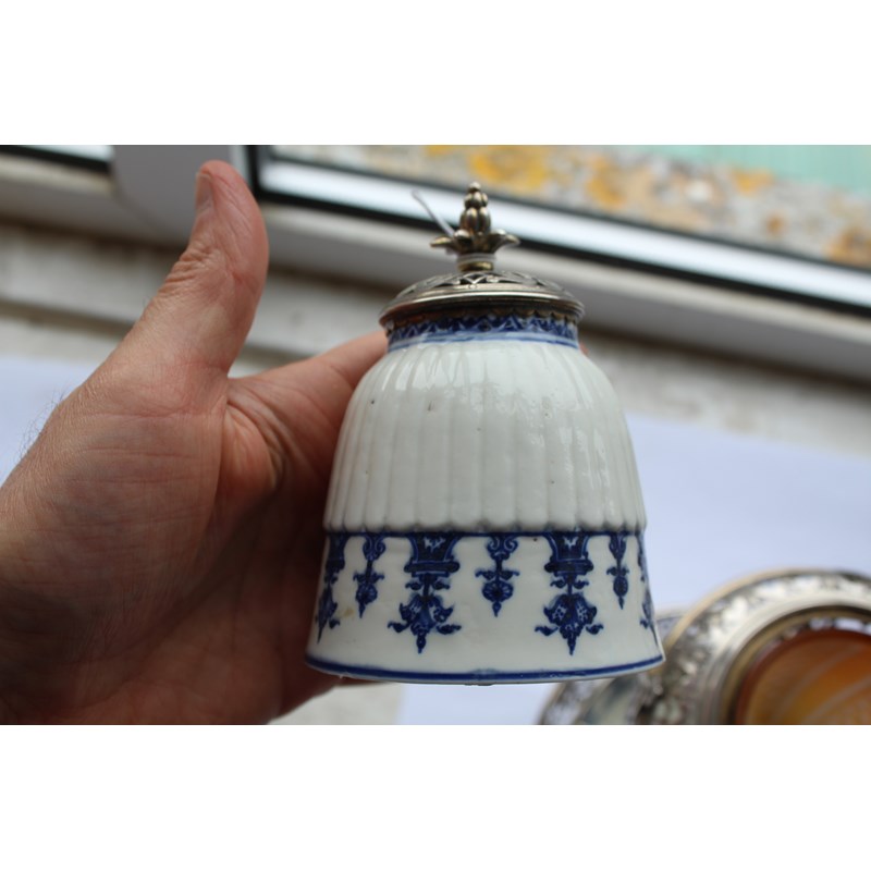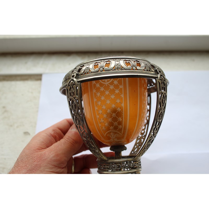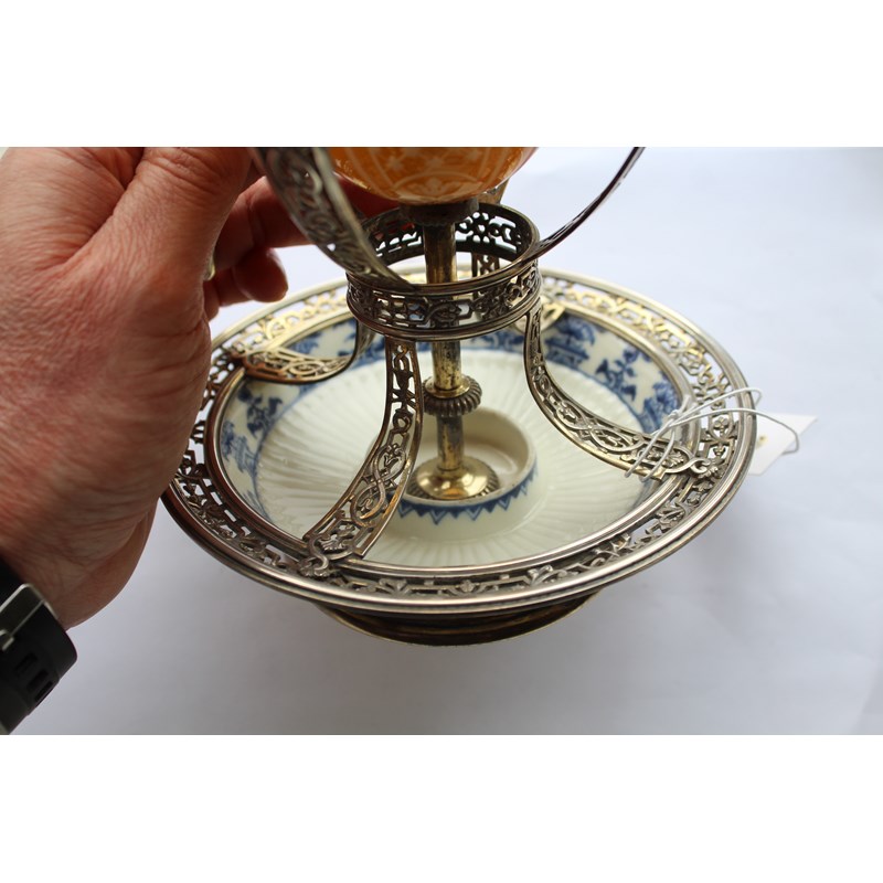 ST CLOUD - PORCELAIN LAMP & METAL MOUNTS with a porcelain fluted top with metal grill and finial, with a glass shade supported in a metal structure and fluted porcelain saucer to the base. 30.5cms high