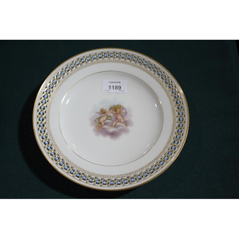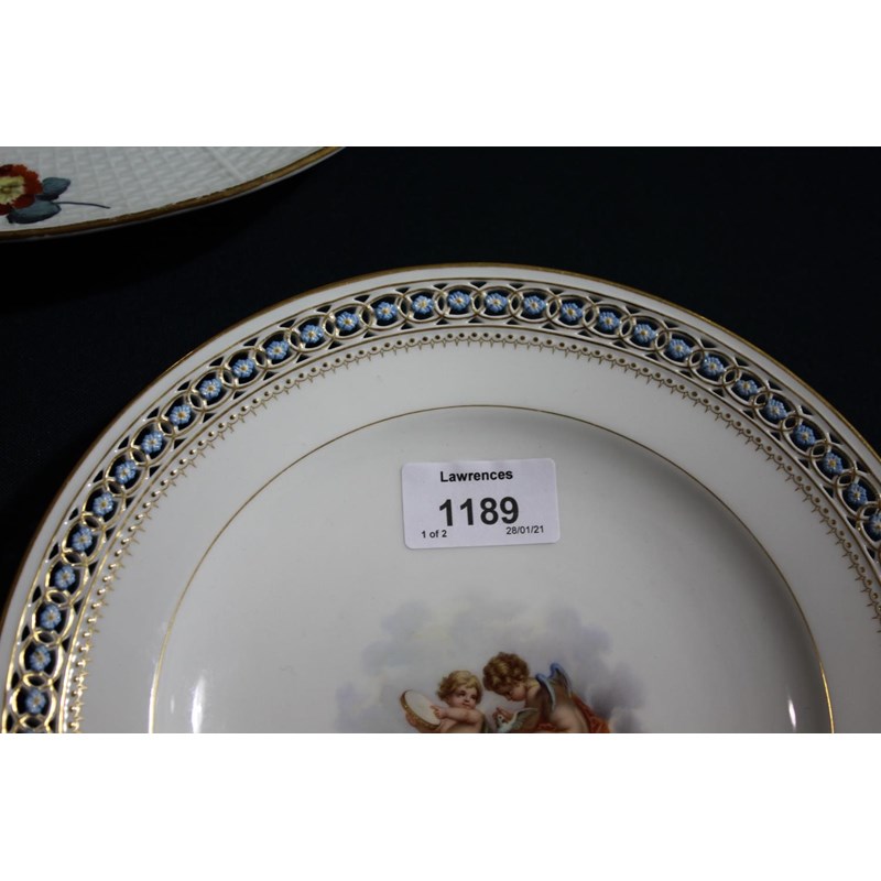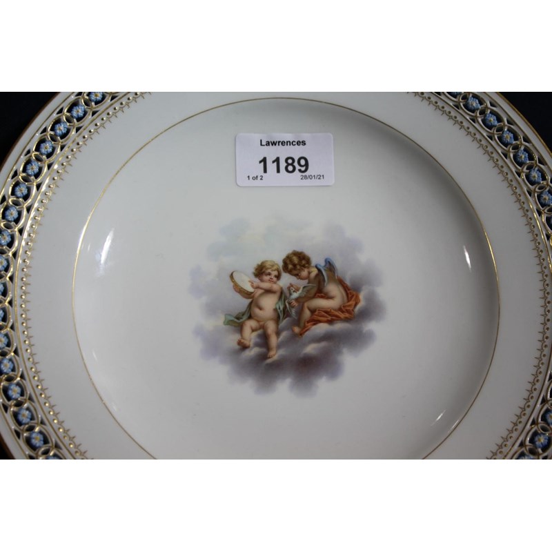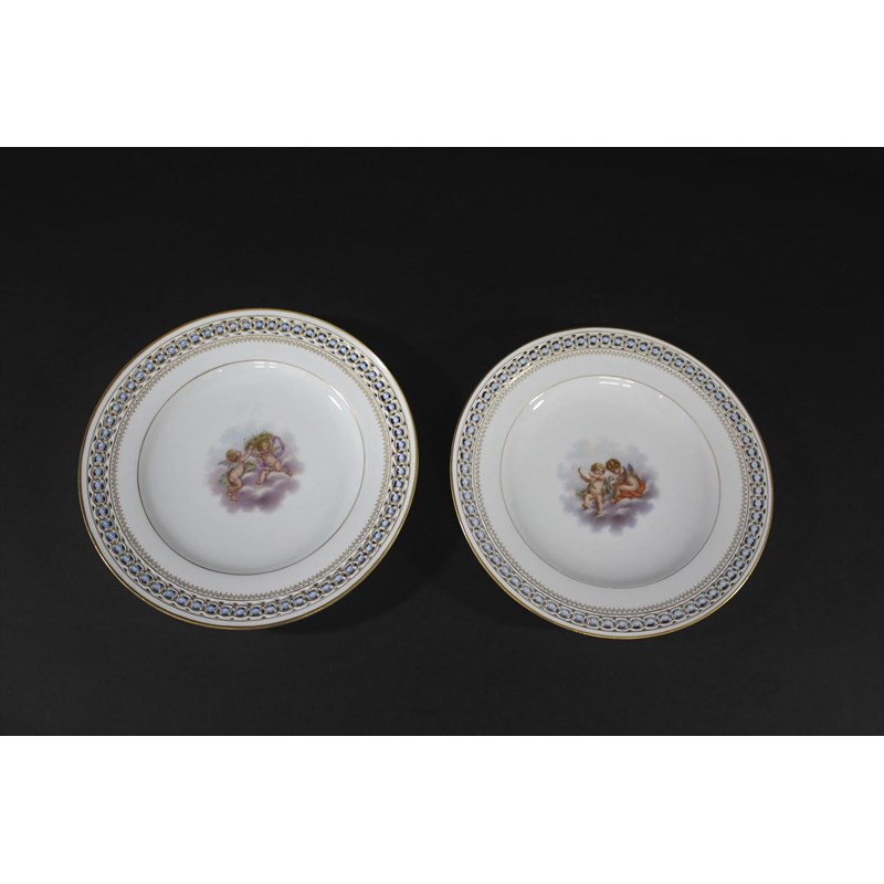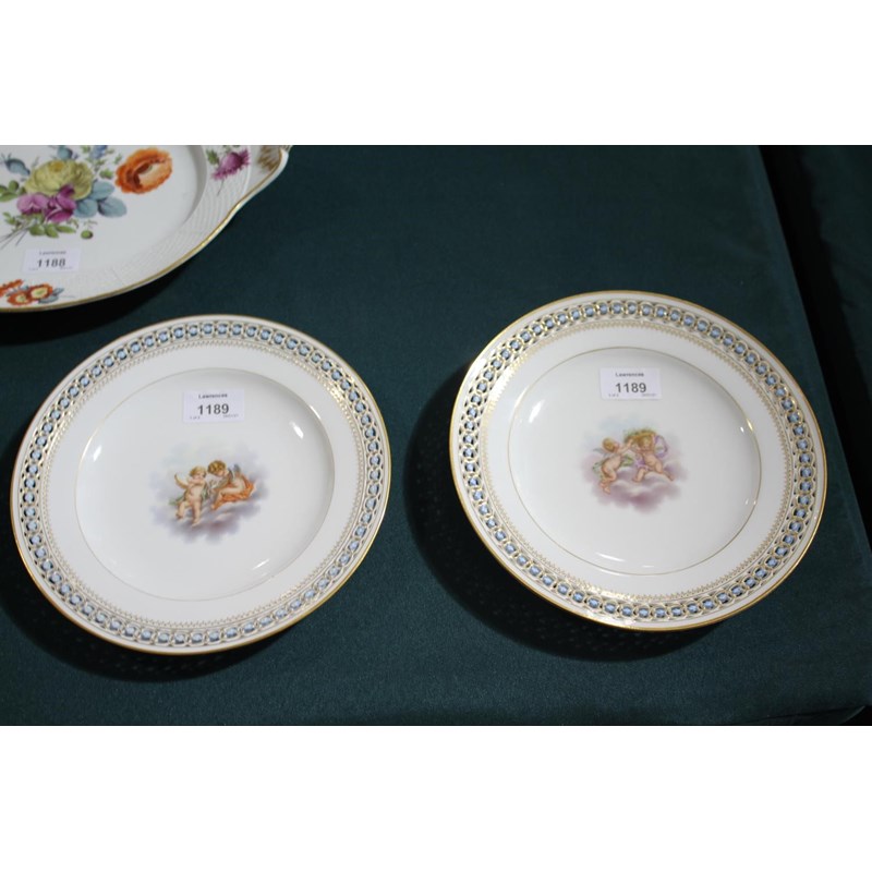 a pair of plates each with a central panel with a depiction of two Cherubs, with pierced rims encrusted with a border of flowers and gilded borders and rim. Crossed swords mark in underglaze blue. 22cms diameter