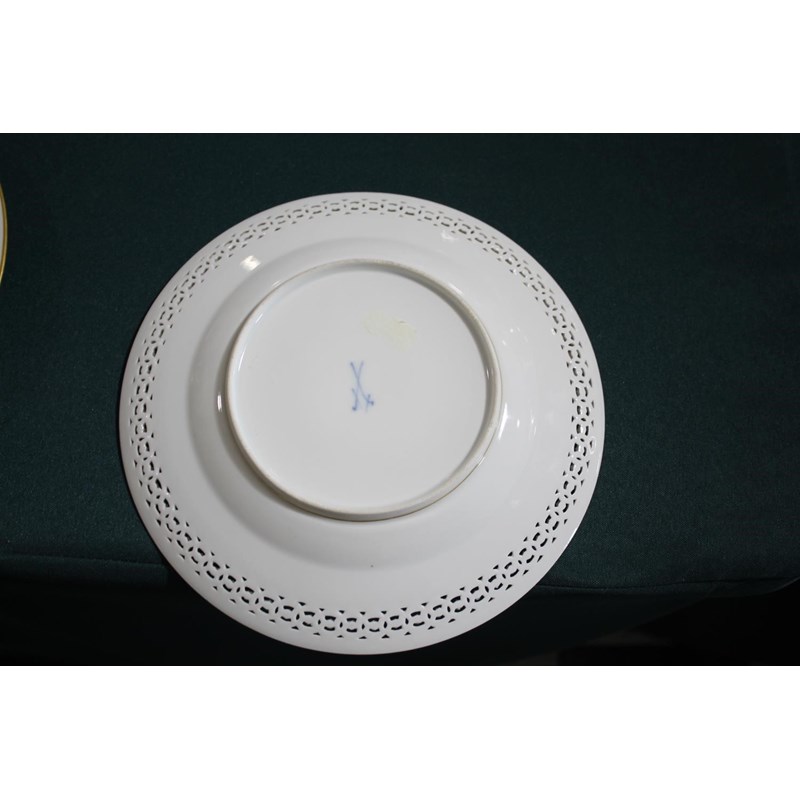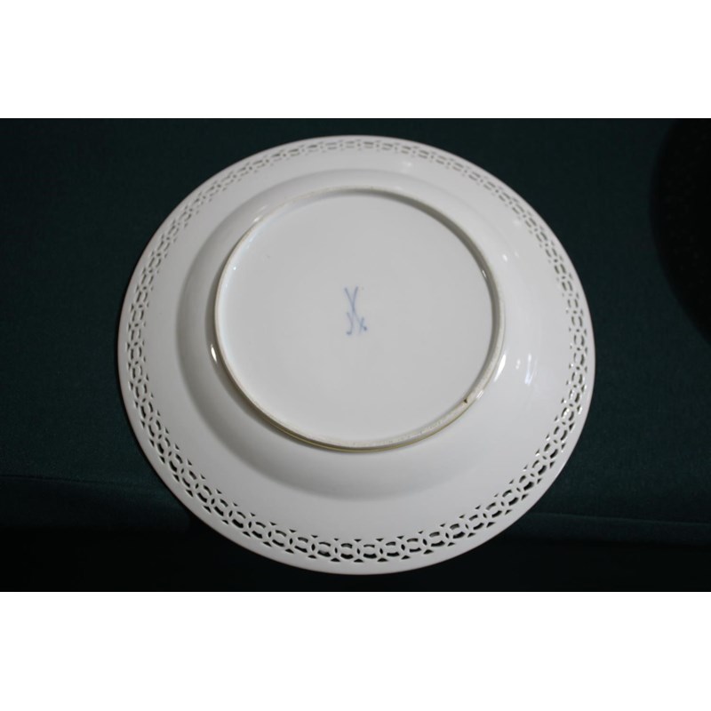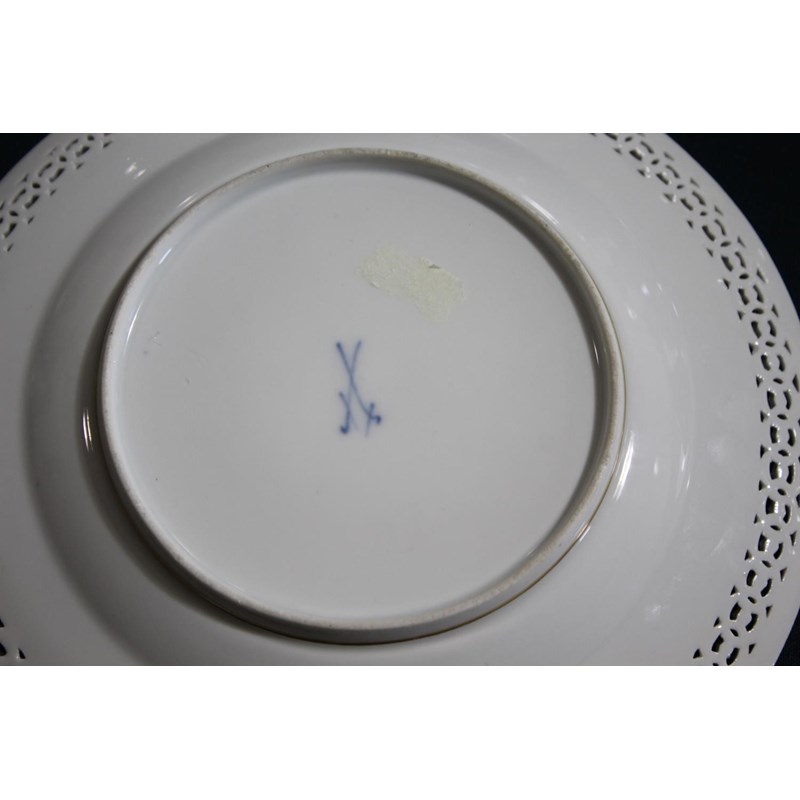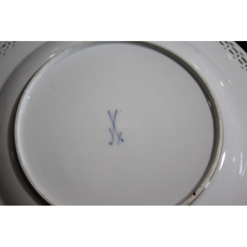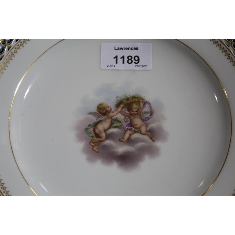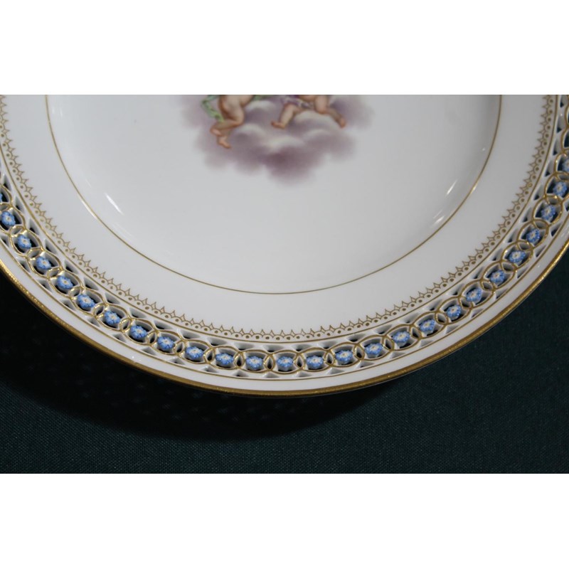 a pair of plates each with a central panel with a depiction of two Cherubs, with pierced rims encrusted with a border of flowers and gilded borders and rim. Crossed swords mark in underglaze blue. 22cms diameter
