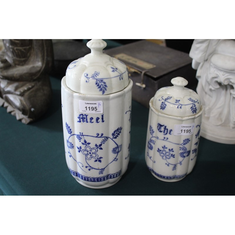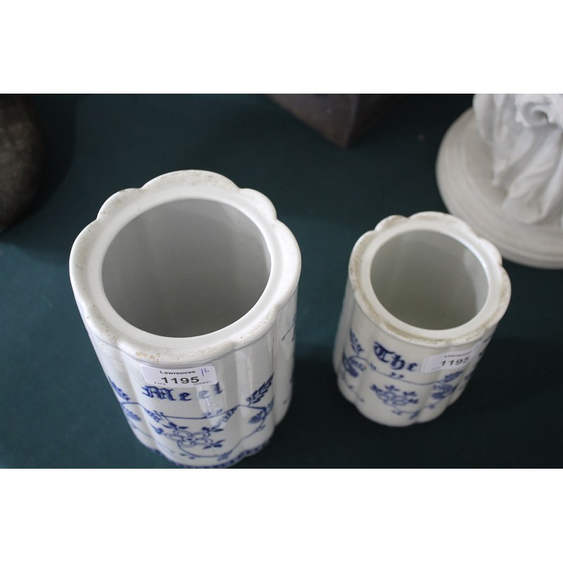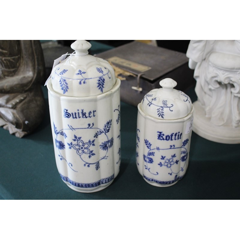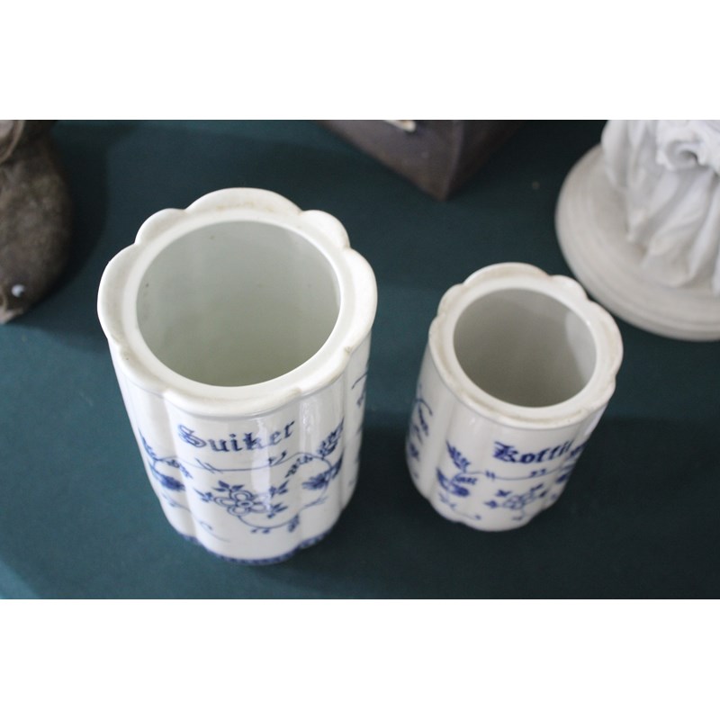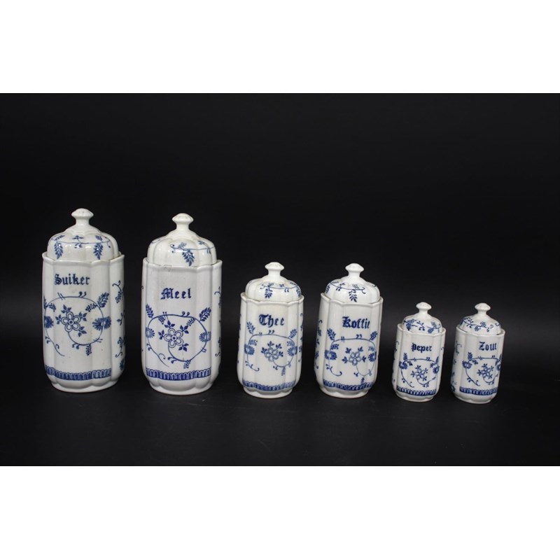 six pottery blue and white kitchen storage jars of various sizes, each named including Suiker, Koffie, Peper etc. Each marked underneath TC. Largest 28cms high. (6)
