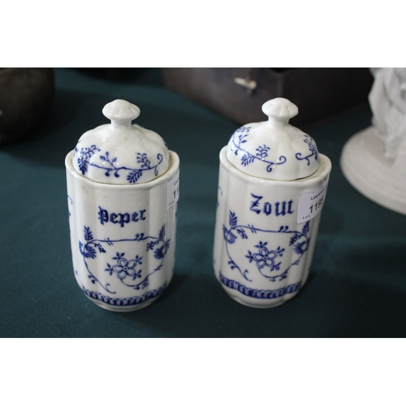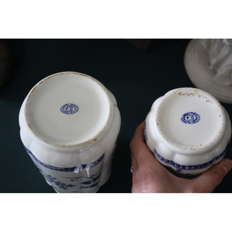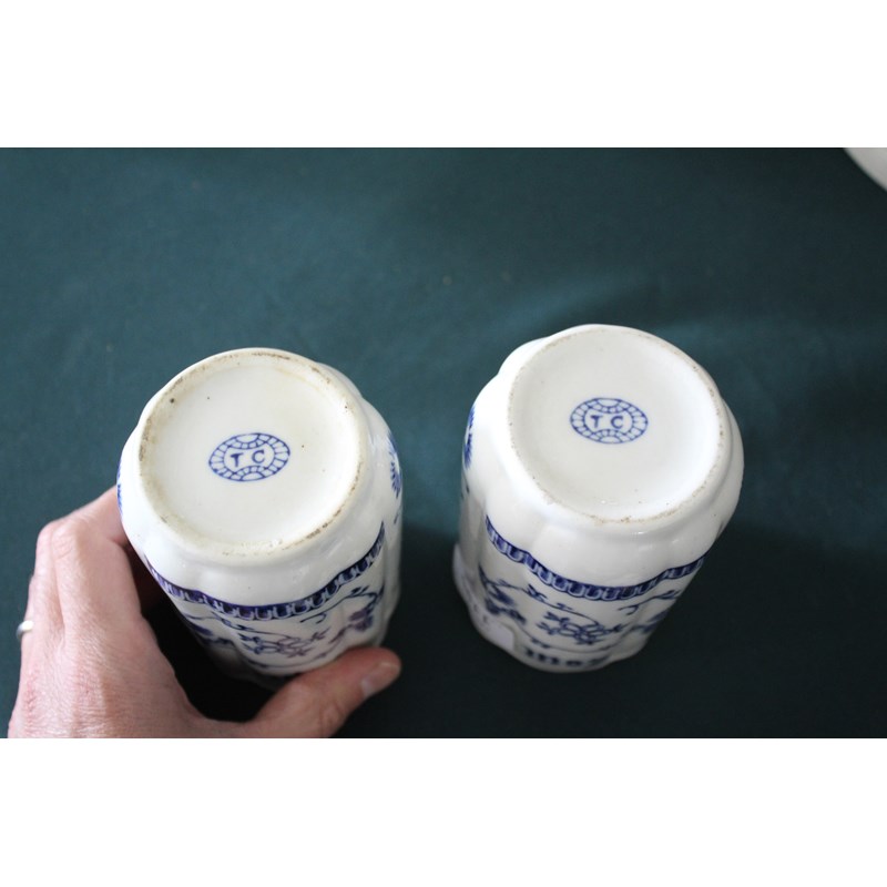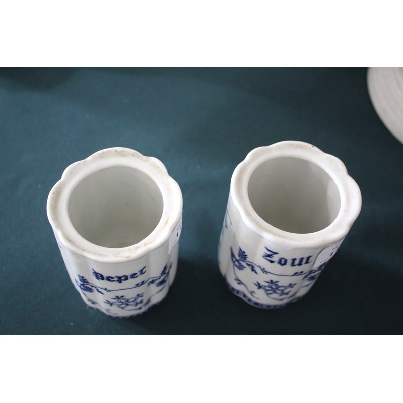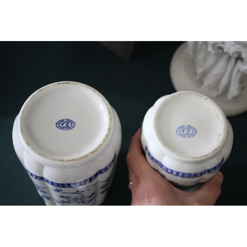 six pottery blue and white kitchen storage jars of various sizes, each named including Suiker, Koffie, Peper etc. Each marked underneath TC. Largest 28cms high. (6)