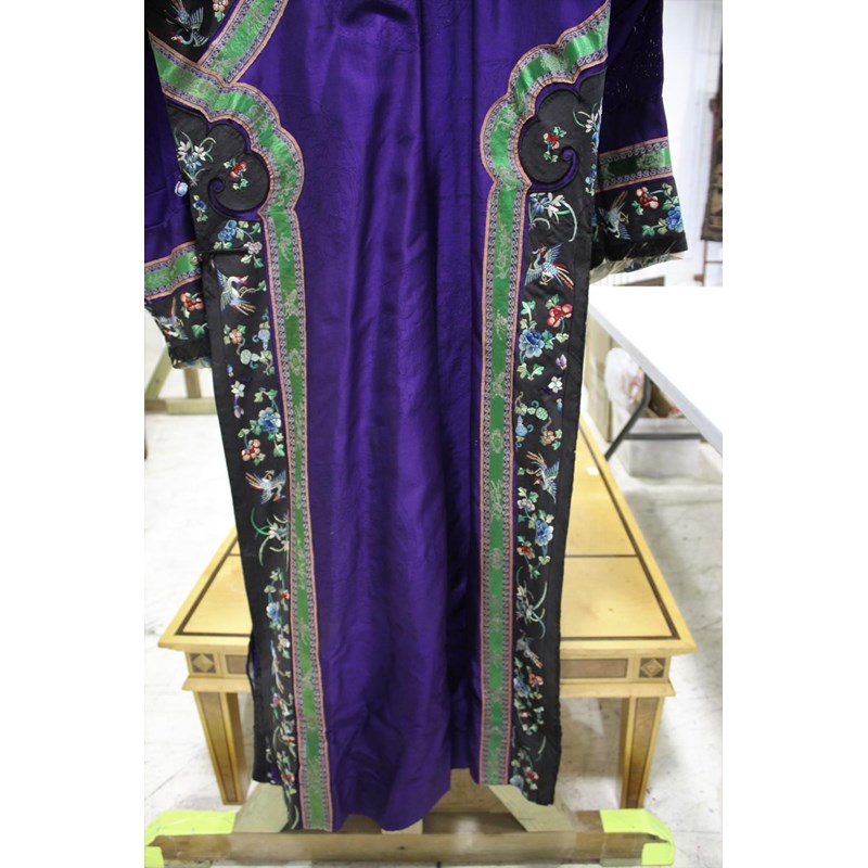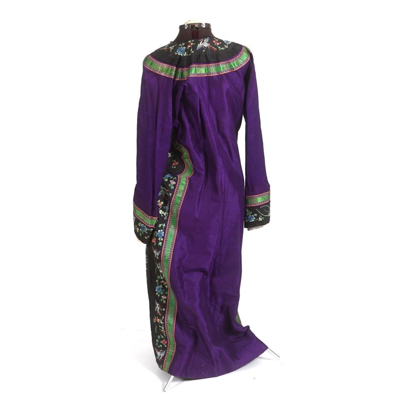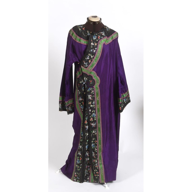 a late 19thc or early 20thc full length unlined purple silk robe, brightly embroidered to the collar, cuffs and vertical panels on a black background, designed with birds, flowers and foliage and edged with pink and green trim. With cross over fastening and spherical pierced metal buttons. 140cms long