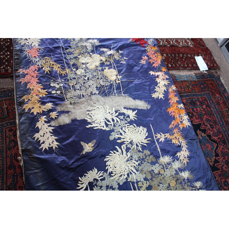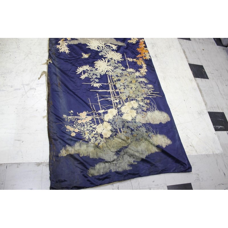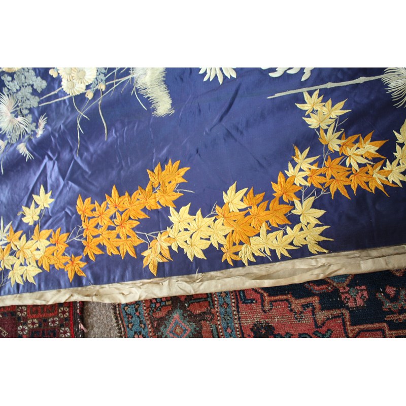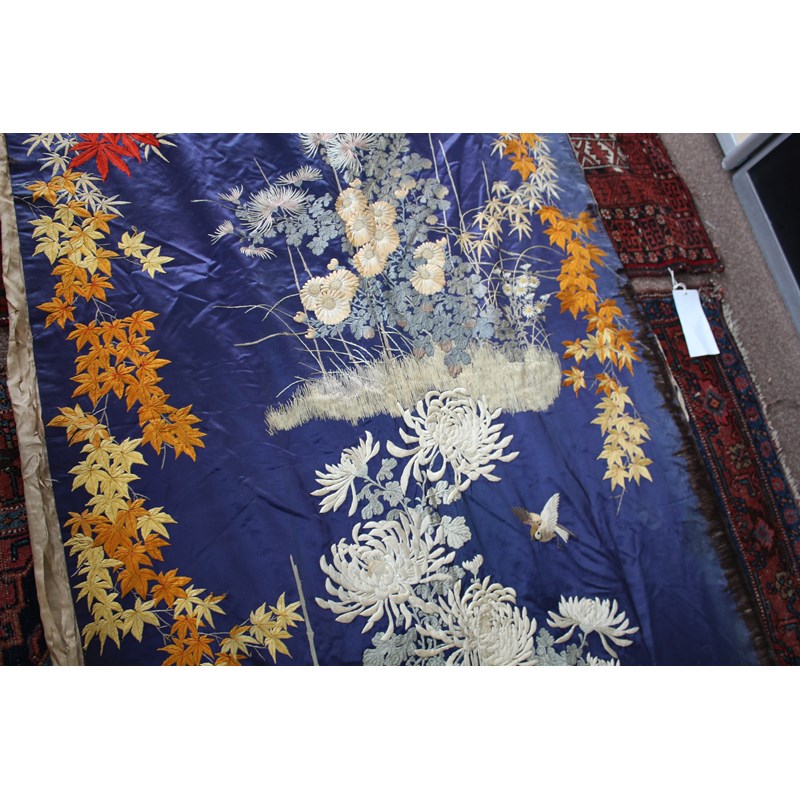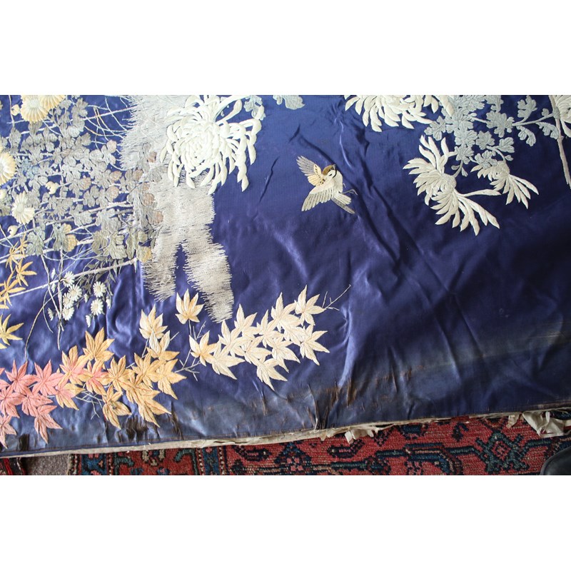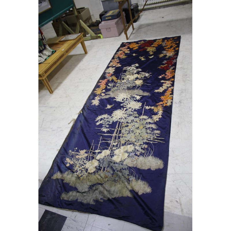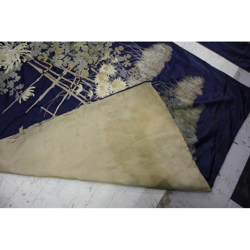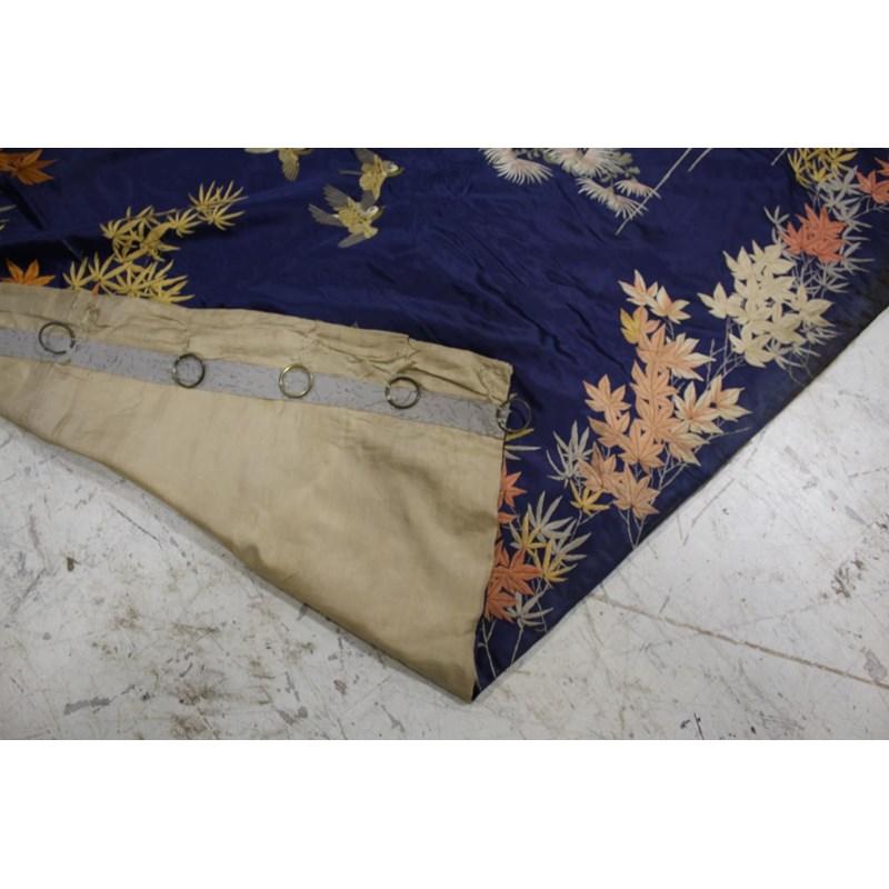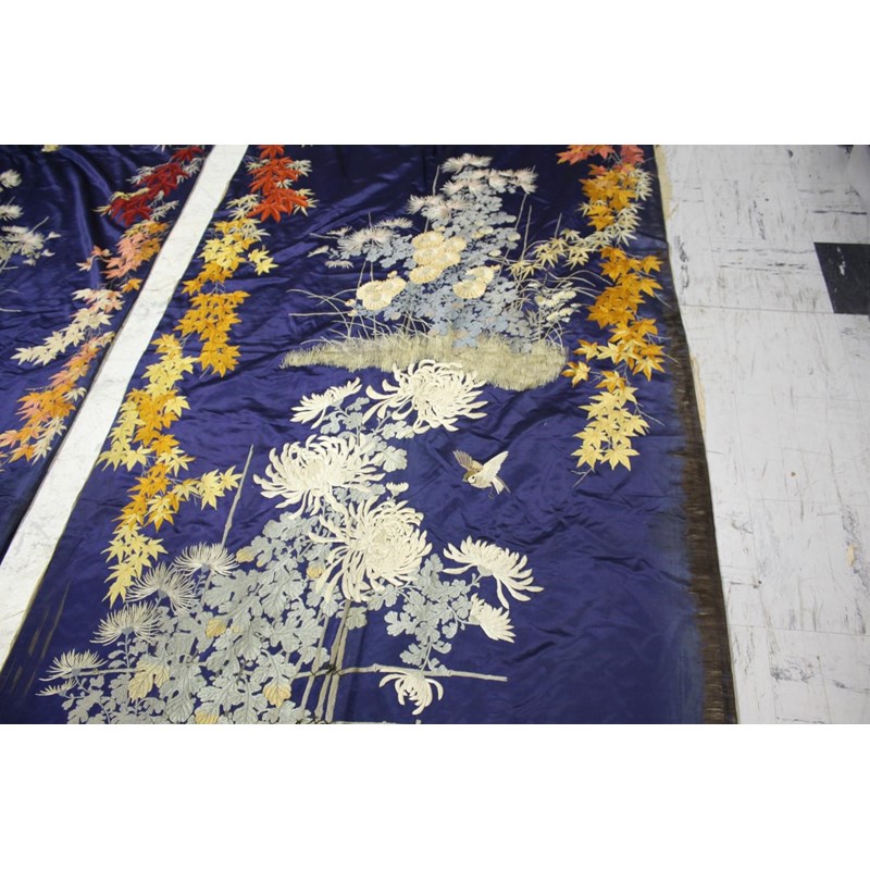late 19thc, two very similar large dark blue silk wall hangings, embroidered with a central design of flowers, leaves and birds in flight, worked in white, pale pink, grey and pale blue's. The border with a colourful trailing leaf design, worked in orange, yellow, red and gold. Some fading to the edges of the hangings, and some damage to the backing fabric. 313cms by 114cms. (2)