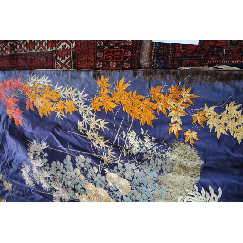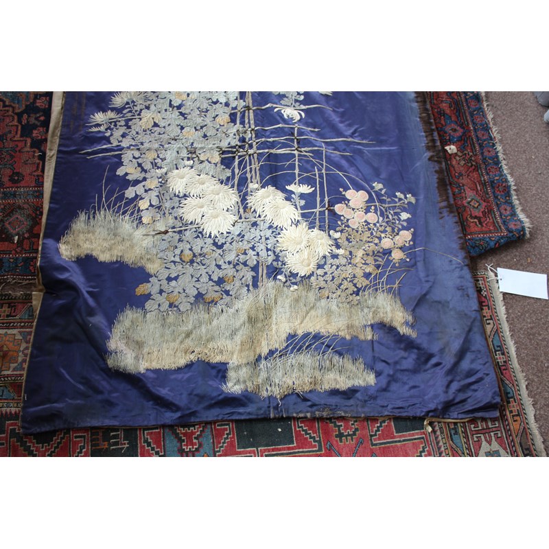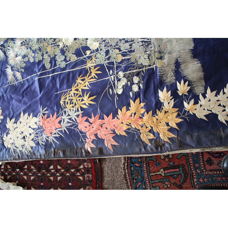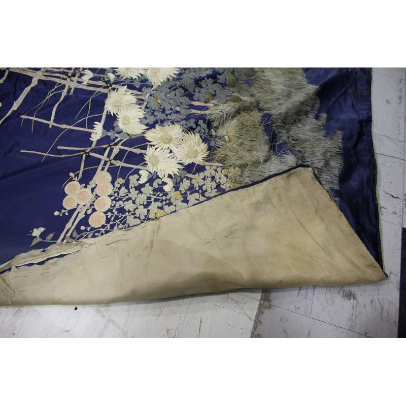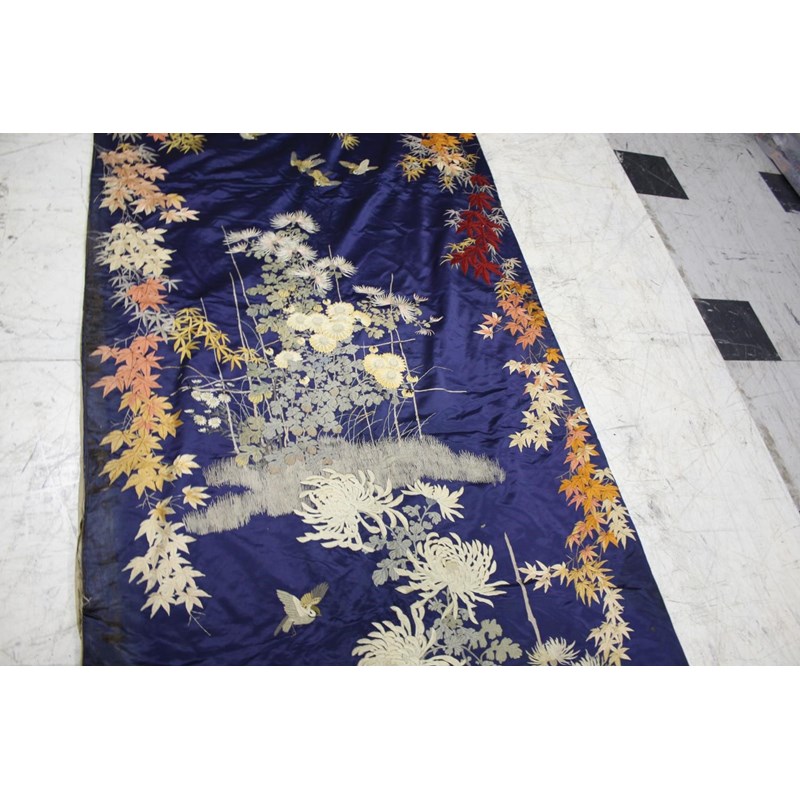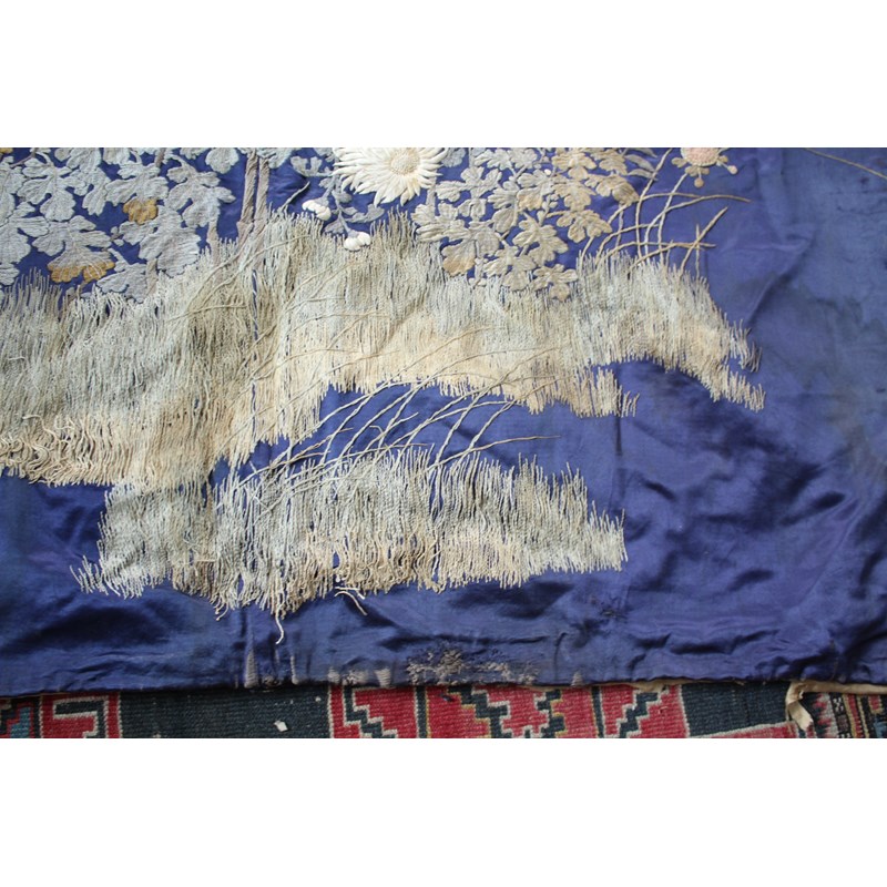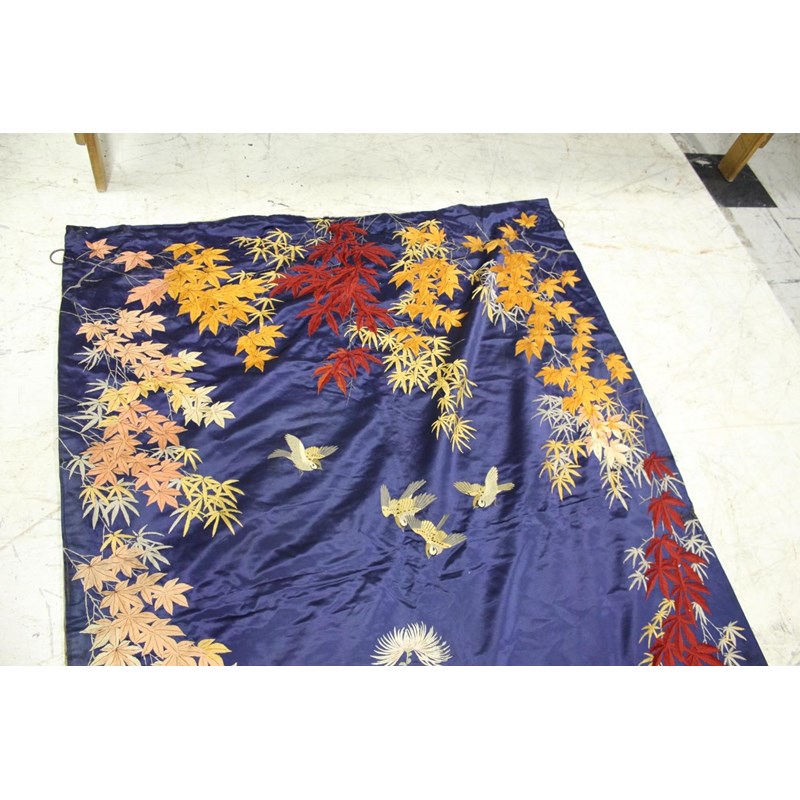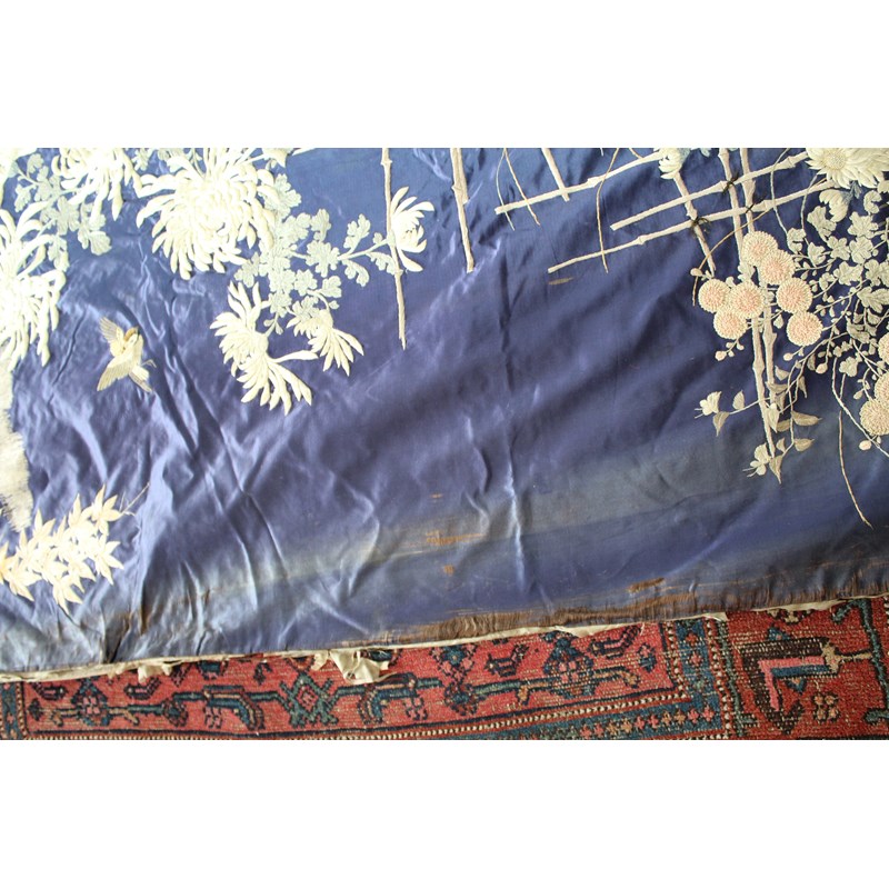 late 19thc, two very similar large dark blue silk wall hangings, embroidered with a central design of flowers, leaves and birds in flight, worked in white, pale pink, grey and pale blue's. The border with a colourful trailing leaf design, worked in orange, yellow, red and gold. Some fading to the edges of the hangings, and some damage to the backing fabric. 313cms by 114cms. (2)