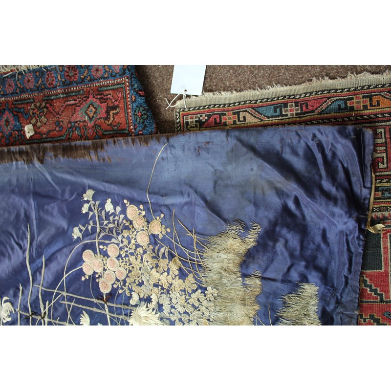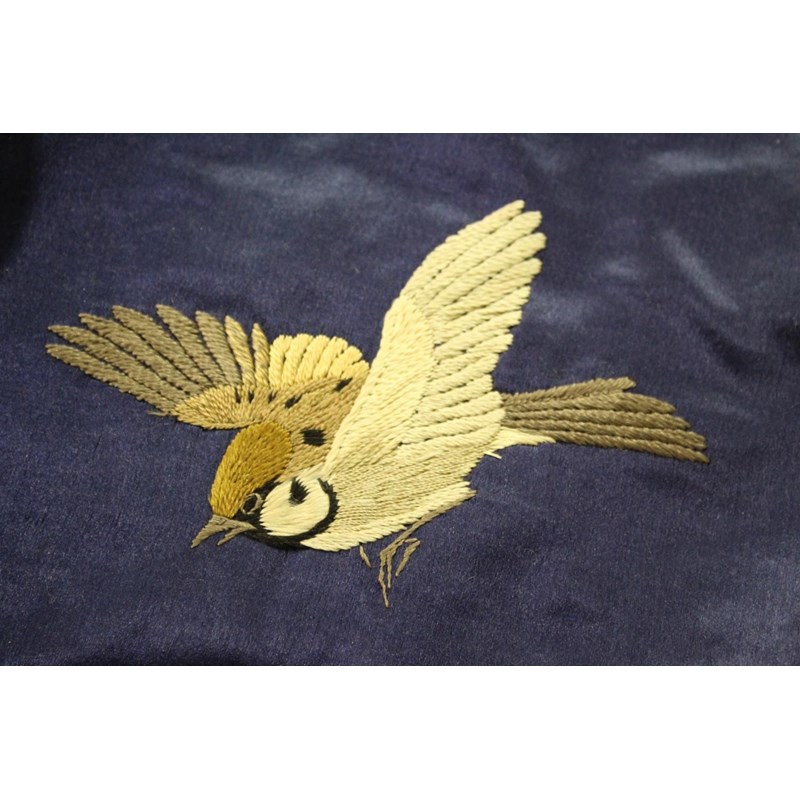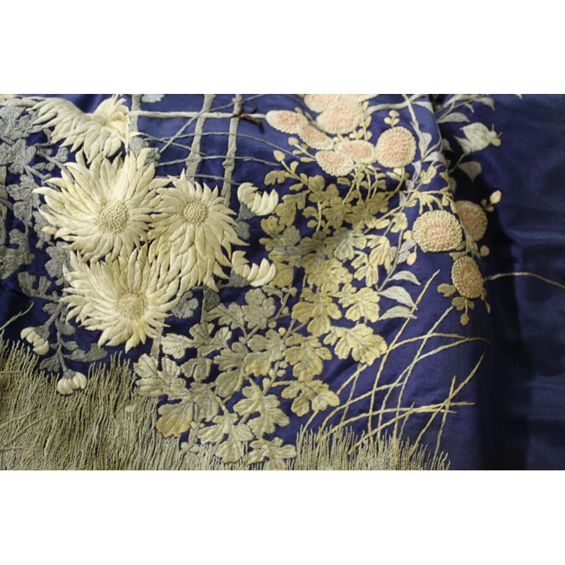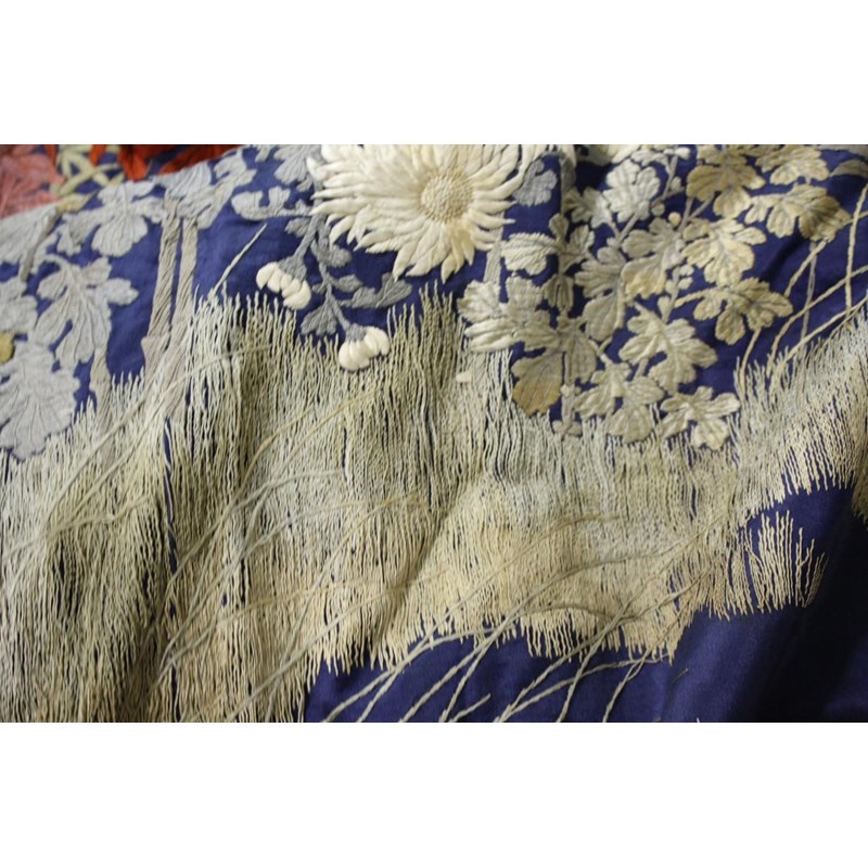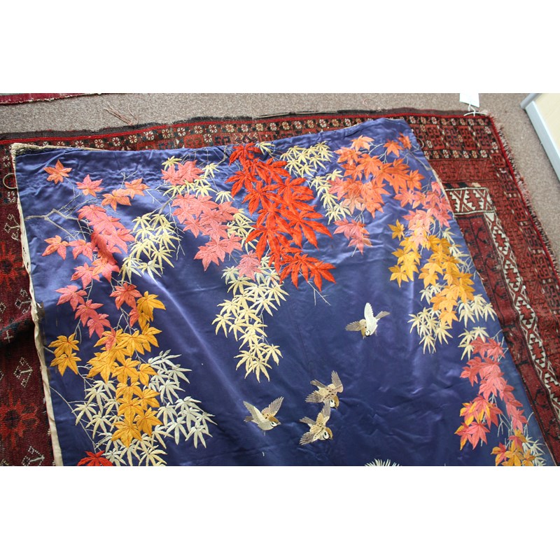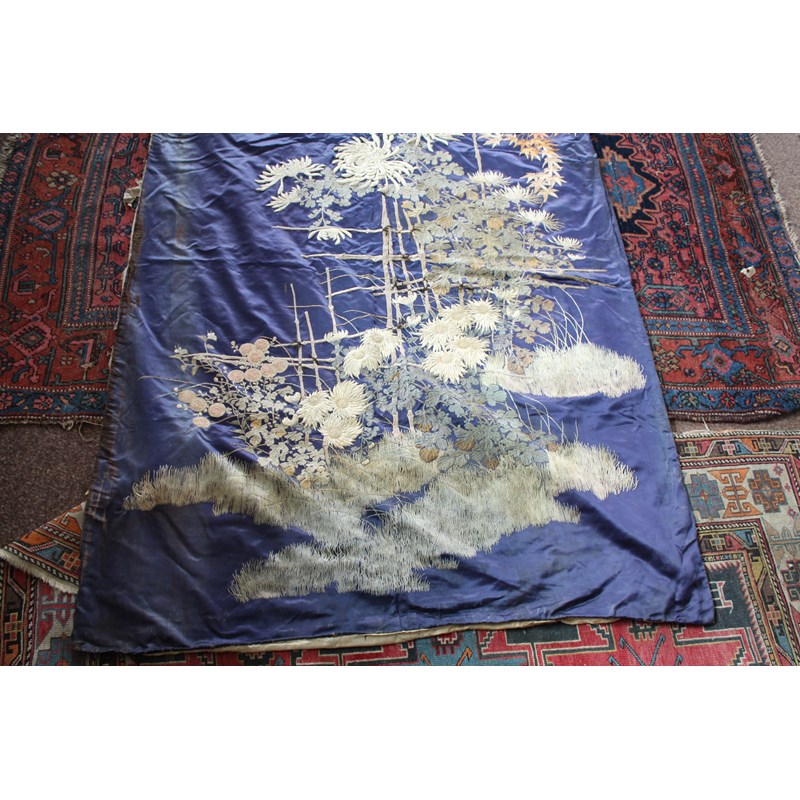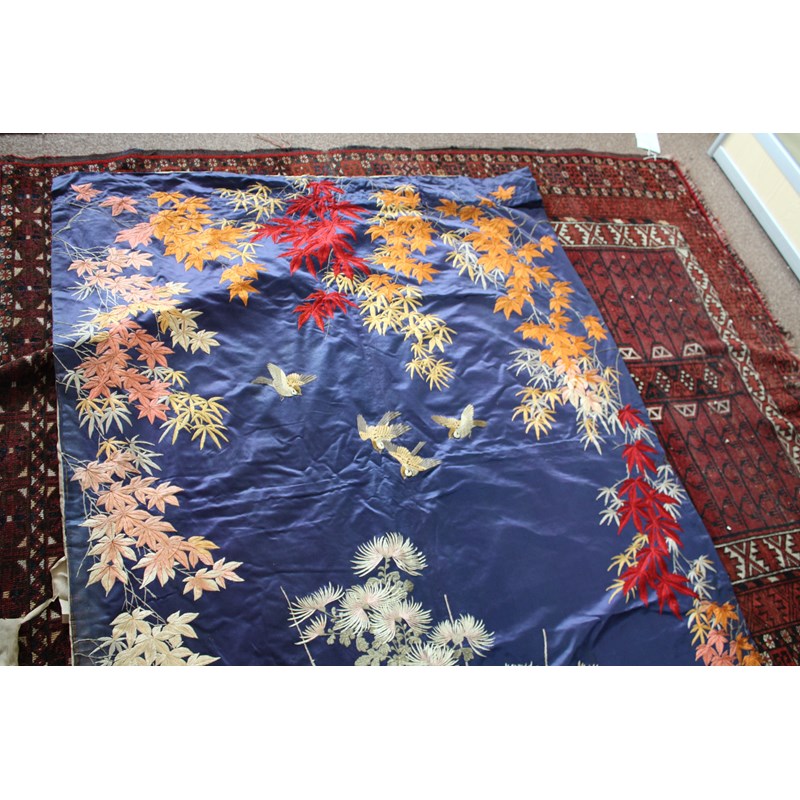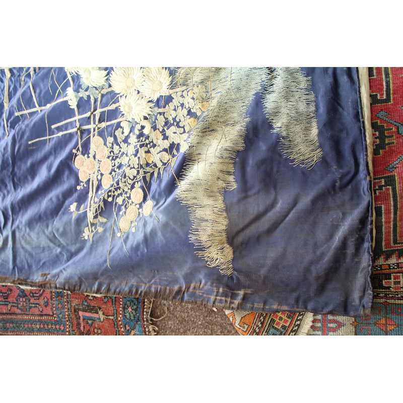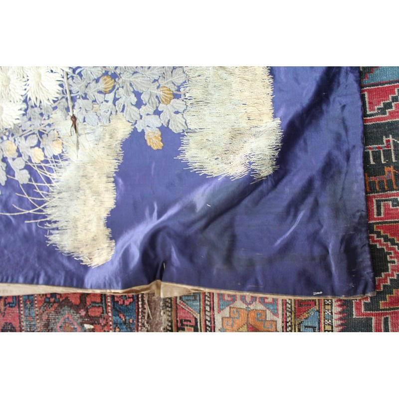 late 19thc, two very similar large dark blue silk wall hangings, embroidered with a central design of flowers, leaves and birds in flight, worked in white, pale pink, grey and pale blue's. The border with a colourful trailing leaf design, worked in orange, yellow, red and gold. Some fading to the edges of the hangings, and some damage to the backing fabric. 313cms by 114cms. (2)