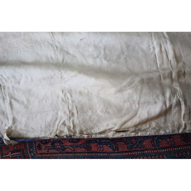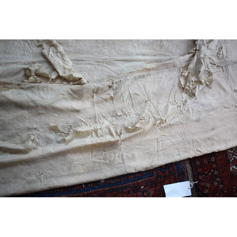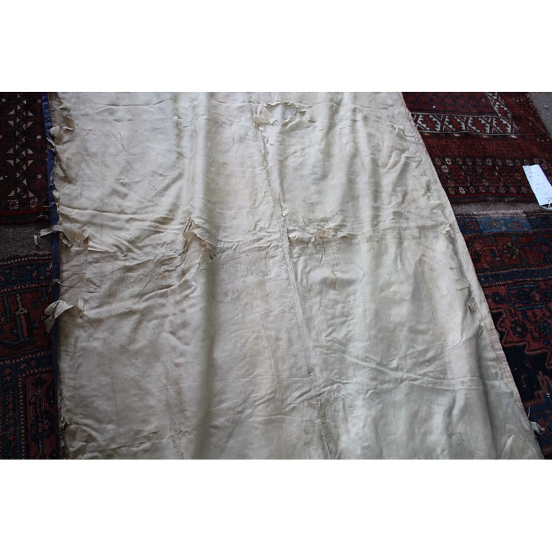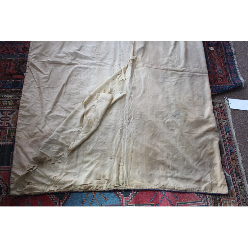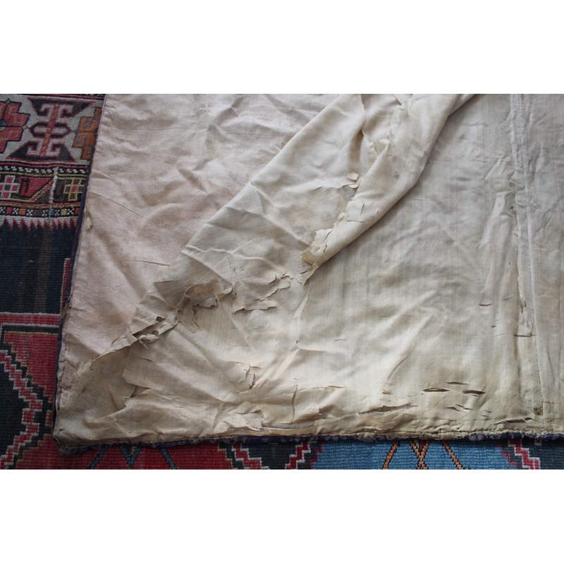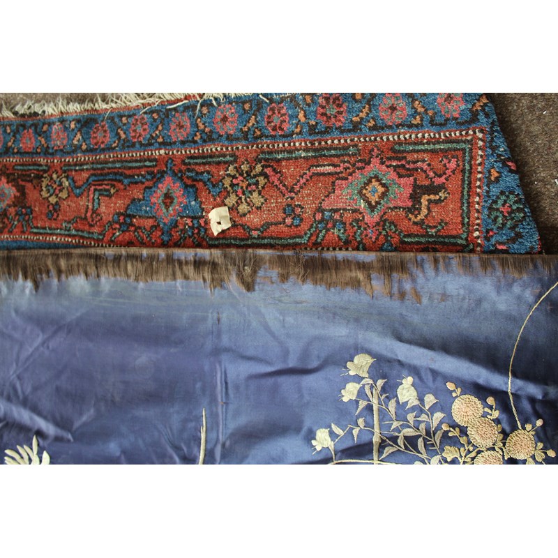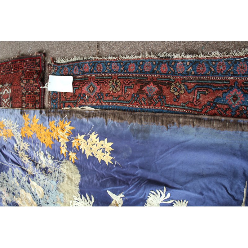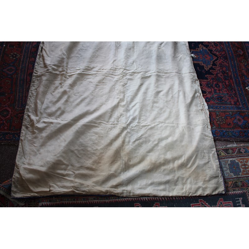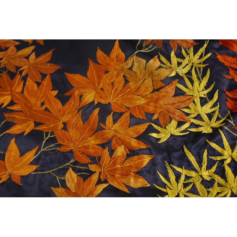 late 19thc, two very similar large dark blue silk wall hangings, embroidered with a central design of flowers, leaves and birds in flight, worked in white, pale pink, grey and pale blue's. The border with a colourful trailing leaf design, worked in orange, yellow, red and gold. Some fading to the edges of the hangings, and some damage to the backing fabric. 313cms by 114cms. (2)