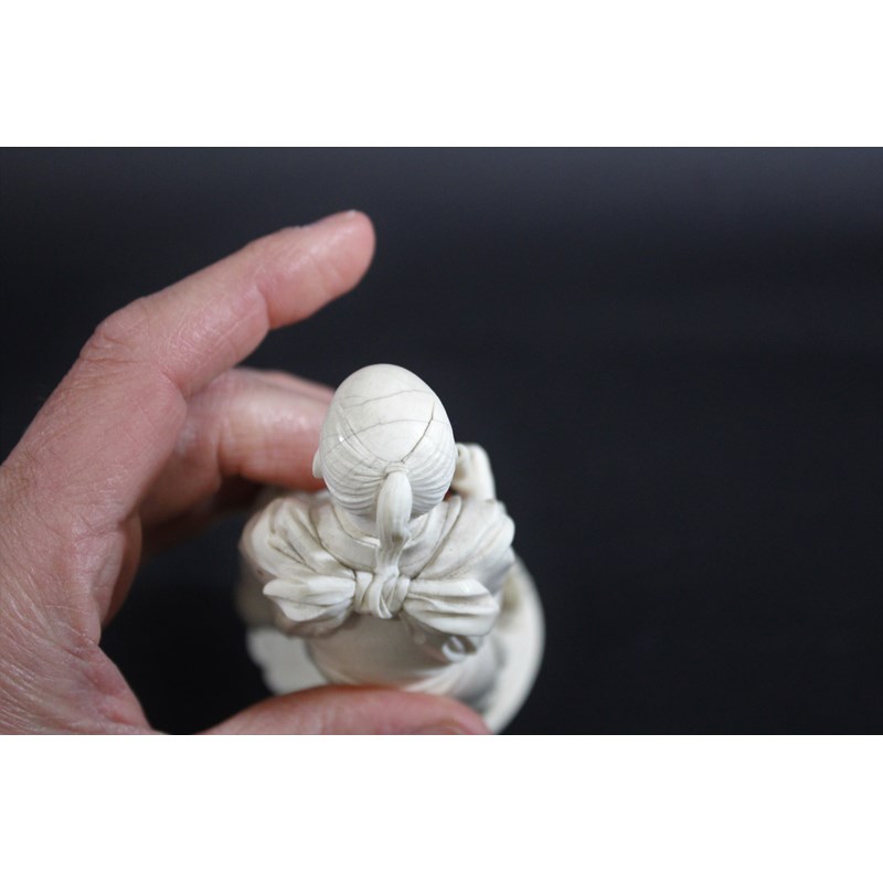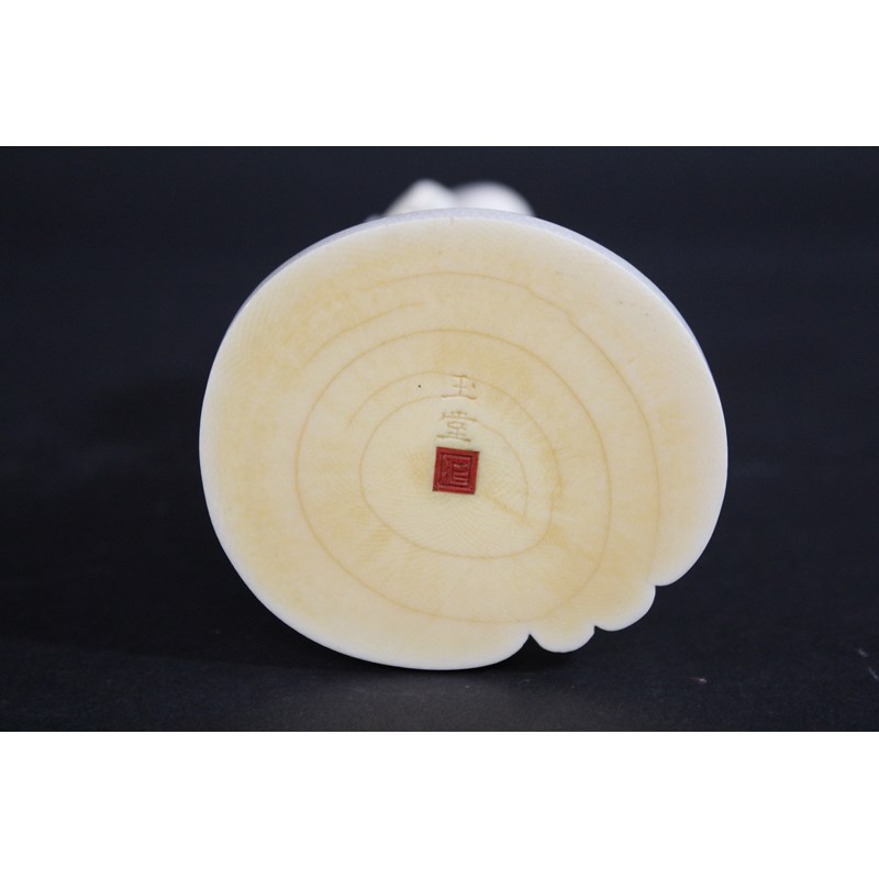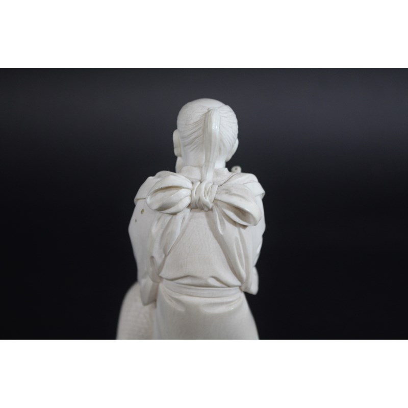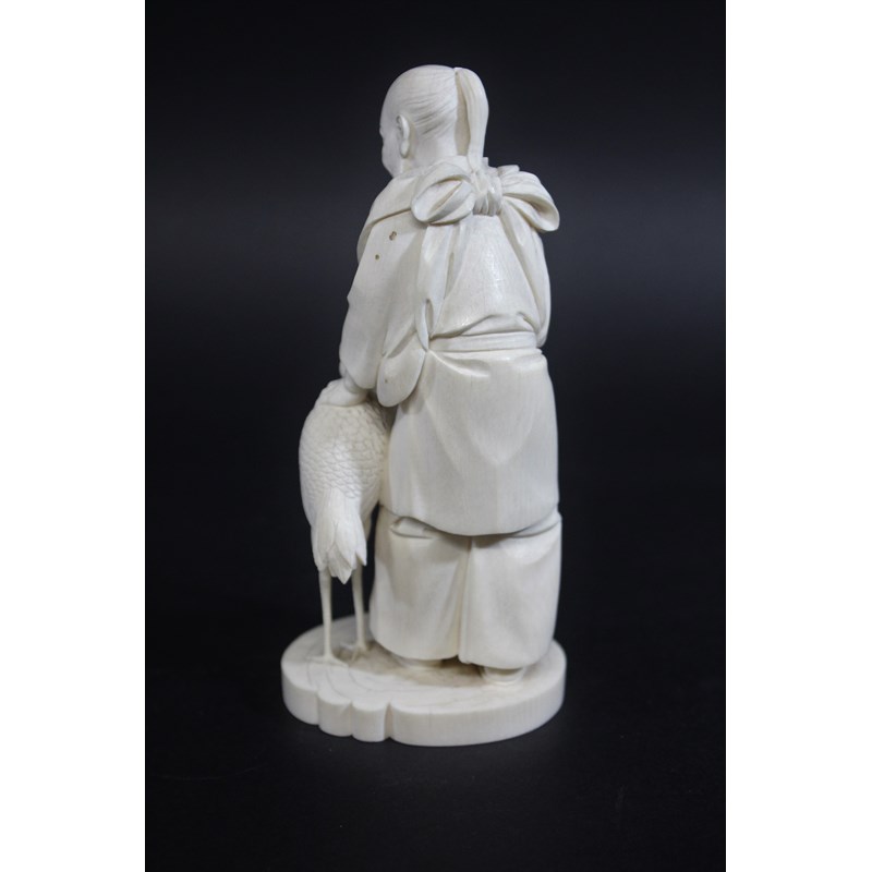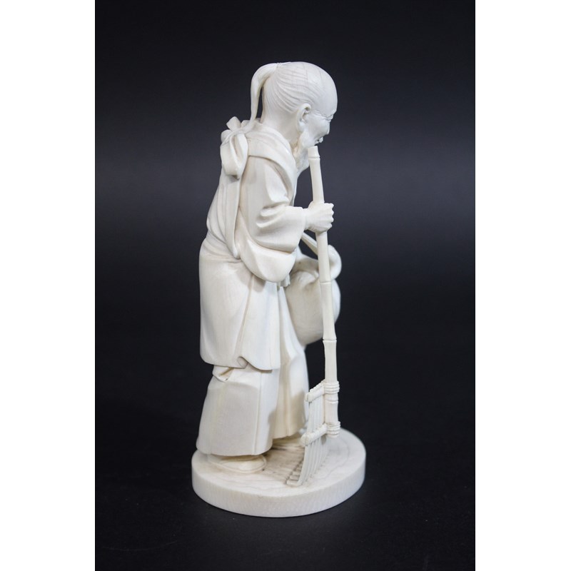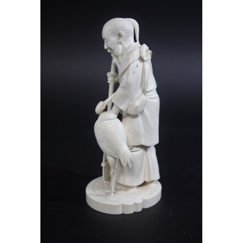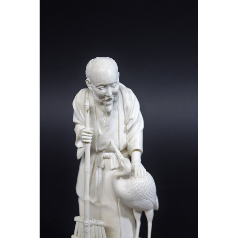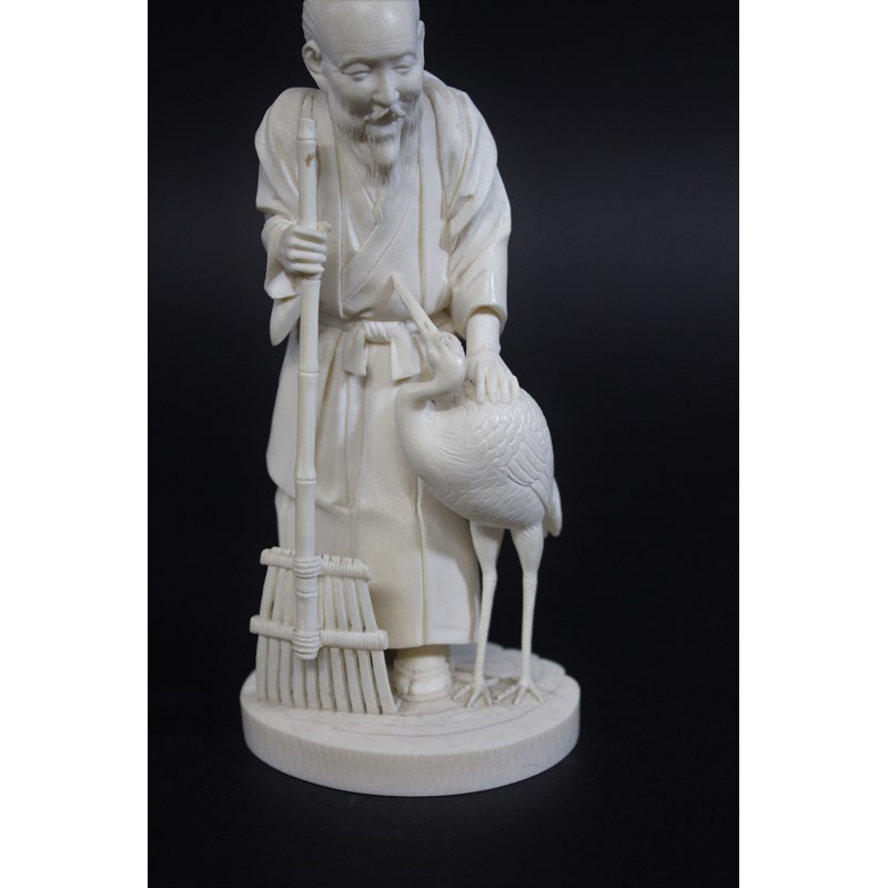 IVORY OKIMONO OF AN ELDERLY MAN & CRANE - SIGNEDÂ a Meiji period figure of a bearded gentleman, slightly stooped and wearing long flowing robes, with an obi around his waist and tied at the front, holding a bamboo rake with his left hand resting on a crane. On a shaped circular base, signature to base (probably Gyokudo) 15cms high