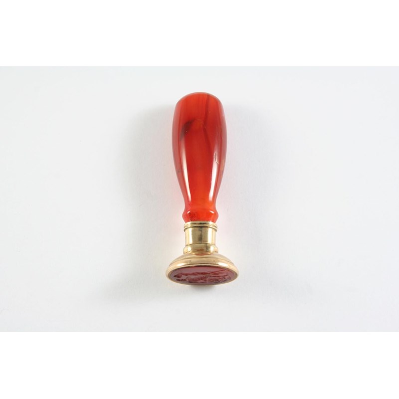 A 19TH CENTURY CARNELIAN AND GOLD DESK SEAL the waisted carnelain seal with plain gold base, the carnelian matrix depicting Hercules having slain the Nemean lion, with a maiden, 6cm high