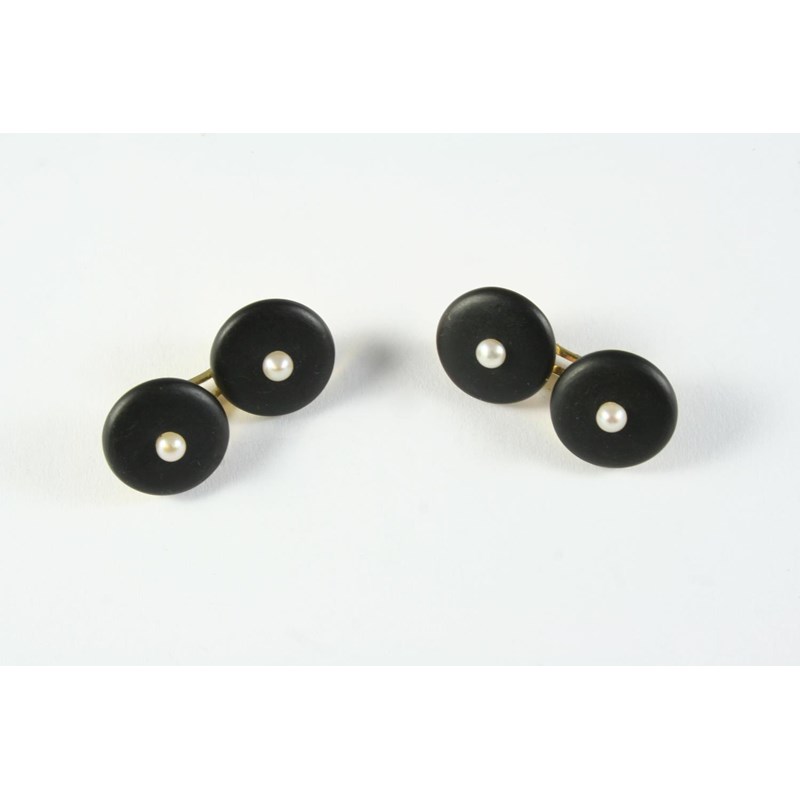 A PAIR OF BLACK ONYX AND PEARL CUFFLINKS each black onyx link centred with a small pearl, backed in yellow gold