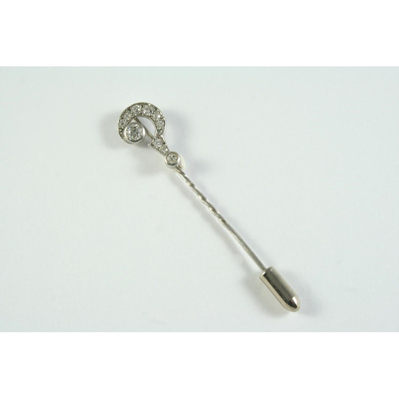 A DIAMOND QUESTION MARK STICK PIN mounted with two collet set old circular-cut diamonds and millegrain set with graduated circular old-cut diamonds