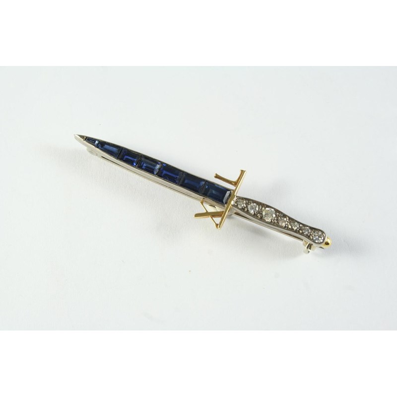 A SAPPHIRE AND DIAMOND 40 COMMANDO ROYAL MARINES DAGGER BROOCH mounted with calibre-cut sapphires and circular-cut diamonds, in gold, 6.3cm long