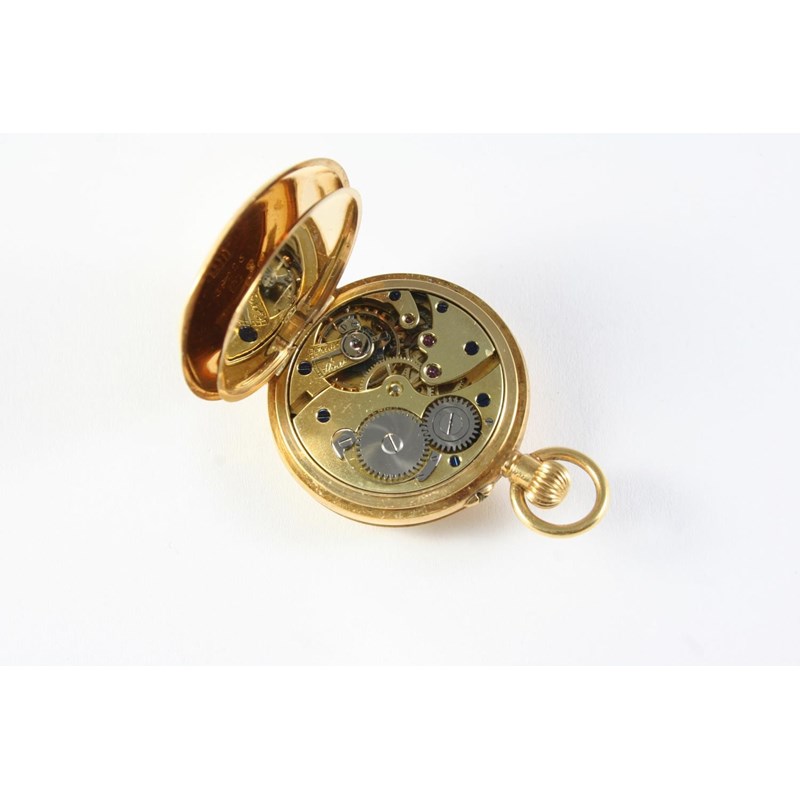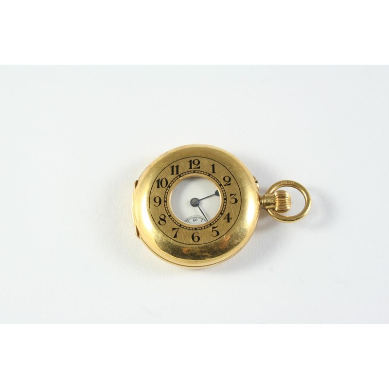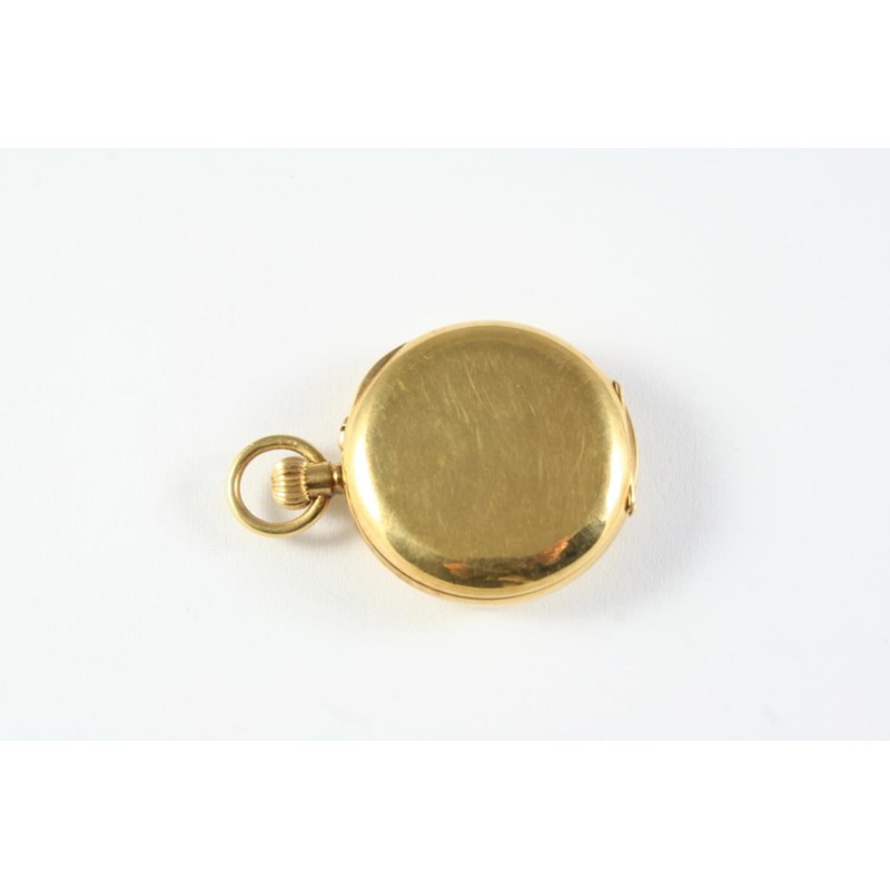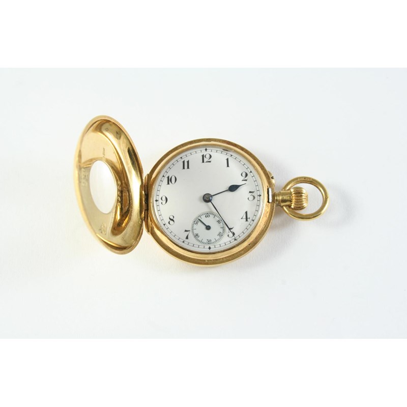 AN 18CT GOLD HALF HUNTING CASED FOB WATCH the white enamel dial with Arabic numerals and subsidiary seconds dial, outer chapter ring, 30mm dia., 24.6 grams