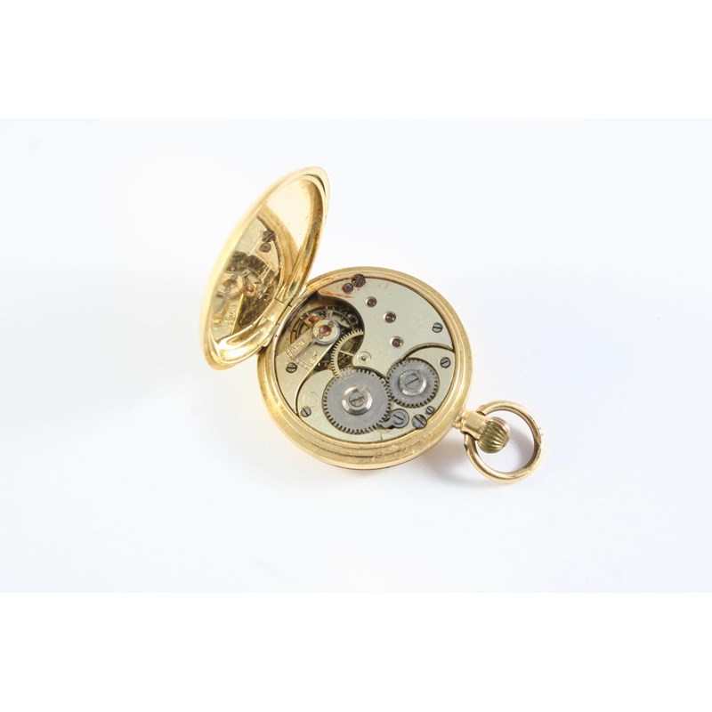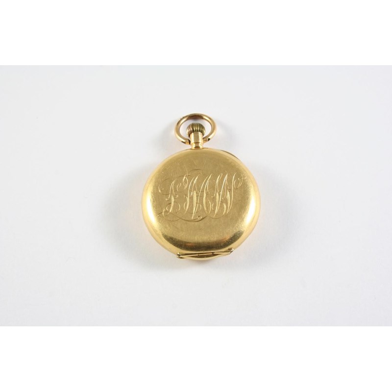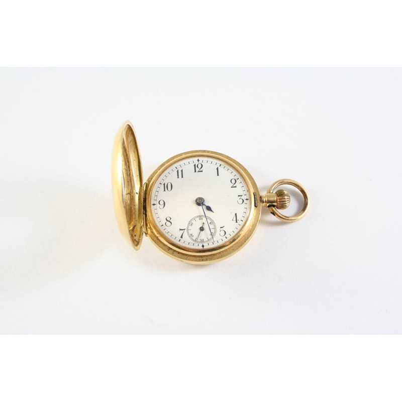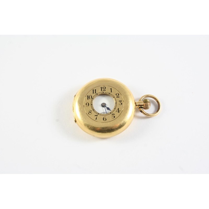 AN 18CT GOLD HALF HUNTING CASED POCKET WATCH the white enamel dial with Arabic numerals and subsidiary seconds dial, inscribed with initials to the back case, 32mm dia., 30.4 grams