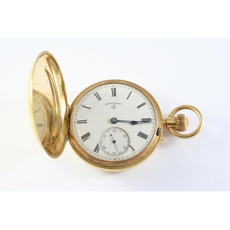 the white enamel dial signed Rotherhams, with black Roman numerals and subsidiary seconds dial, with inscription to the inner cased dated for 1913, hallmarked for Birmingham 1909, monogram to the front case, 50mm dia, 84 grams