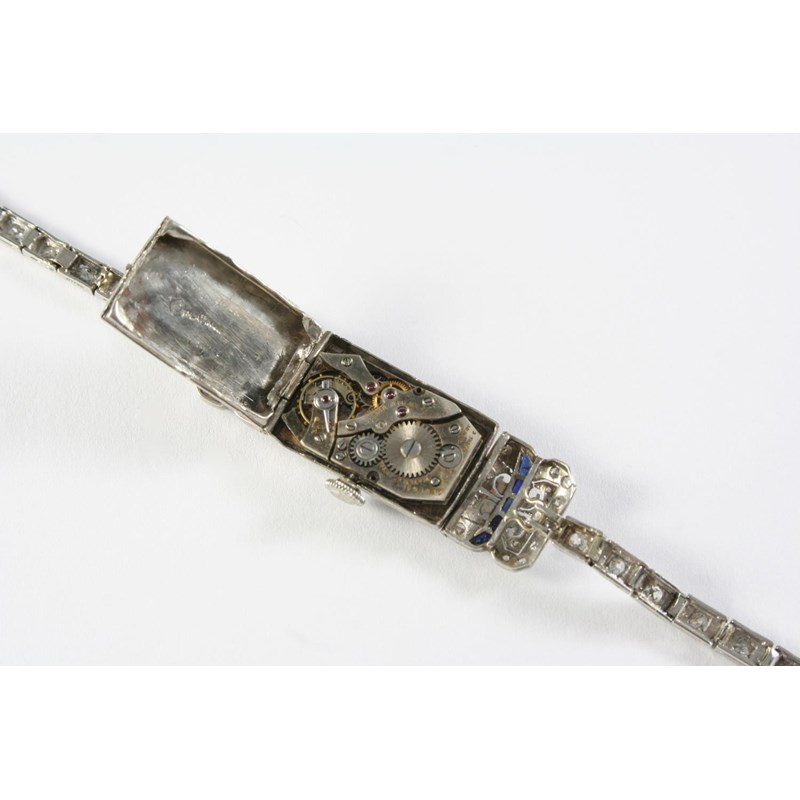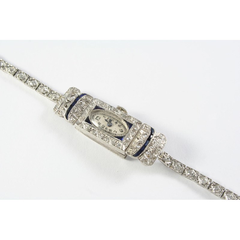 the oval-shaped dial with Arabic numerals, mounted with circular-cut diamonds and calibre-cut sapphires, in platinum, 18cm long