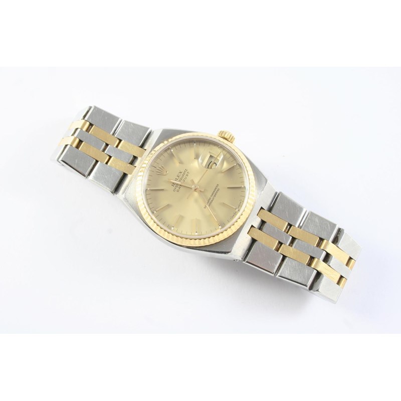the signed gold coloured dial with baton numerals, case number L8 18004, model number 17013, on a stainless steel and gold bracelet by Rolex, with Rolex logo to the winder and clasp, 35mm dia. With green pouch by Rolex.